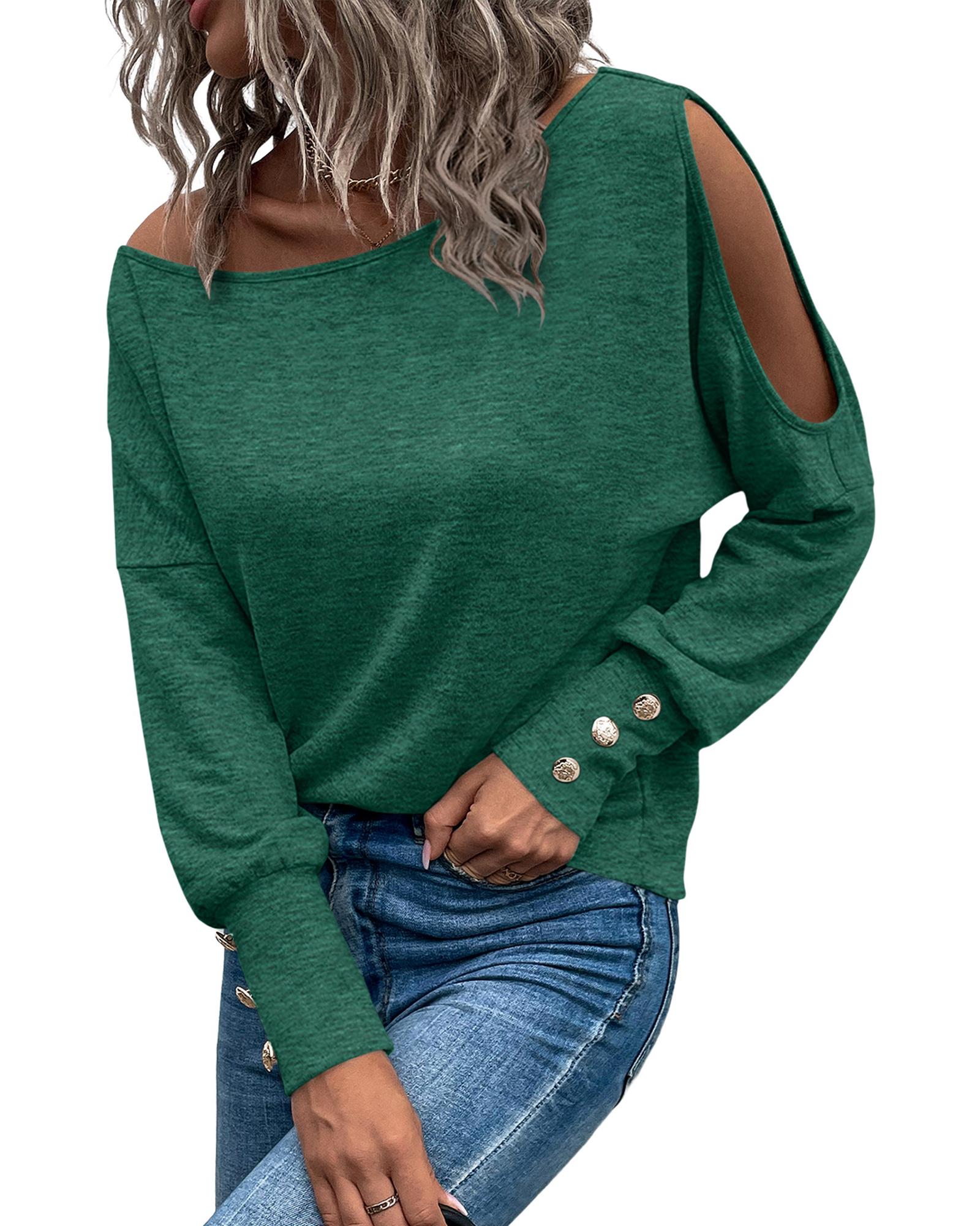 This green asymmetrical cut-out buttoned long sleeve top combines a trendy fitted silhouette with unique design elements. Its solid color makes it versatile for various outfits, while the button details add a touch of sophistication. The loose fit ensures comfortable movement, making it suitable for different occasions.