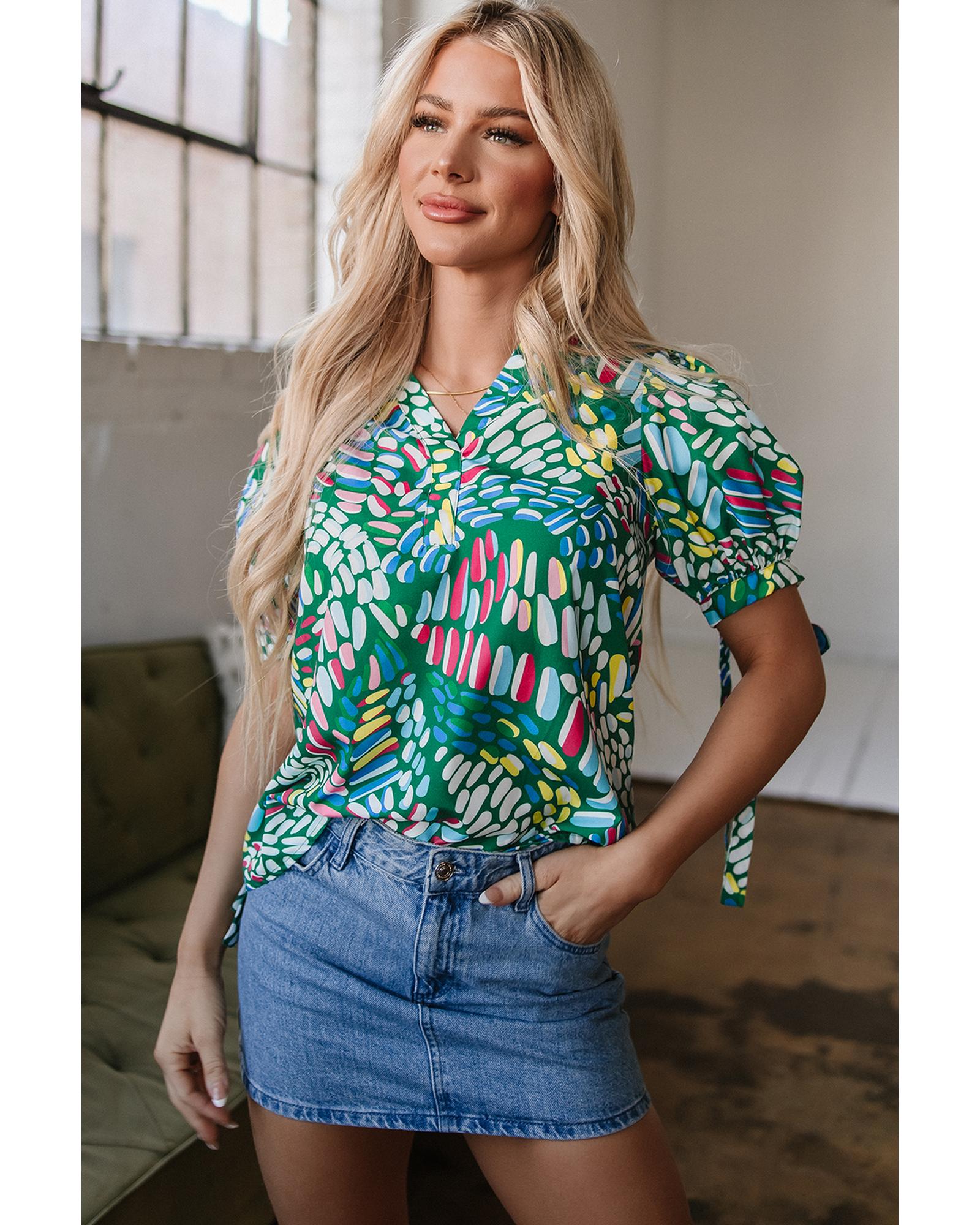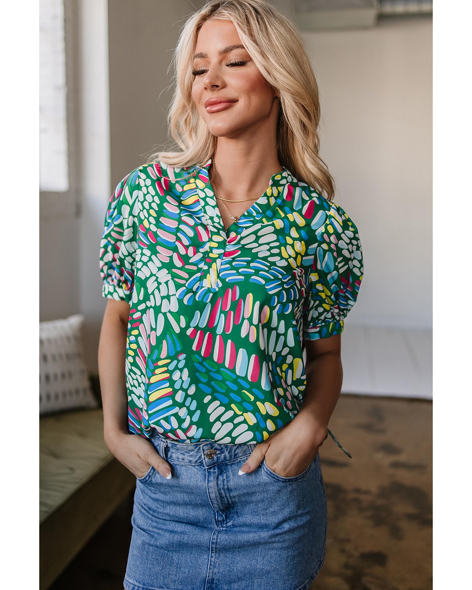 Green Brushwork Geometric Print Puff Sleeve Notched Neck Blouse – M