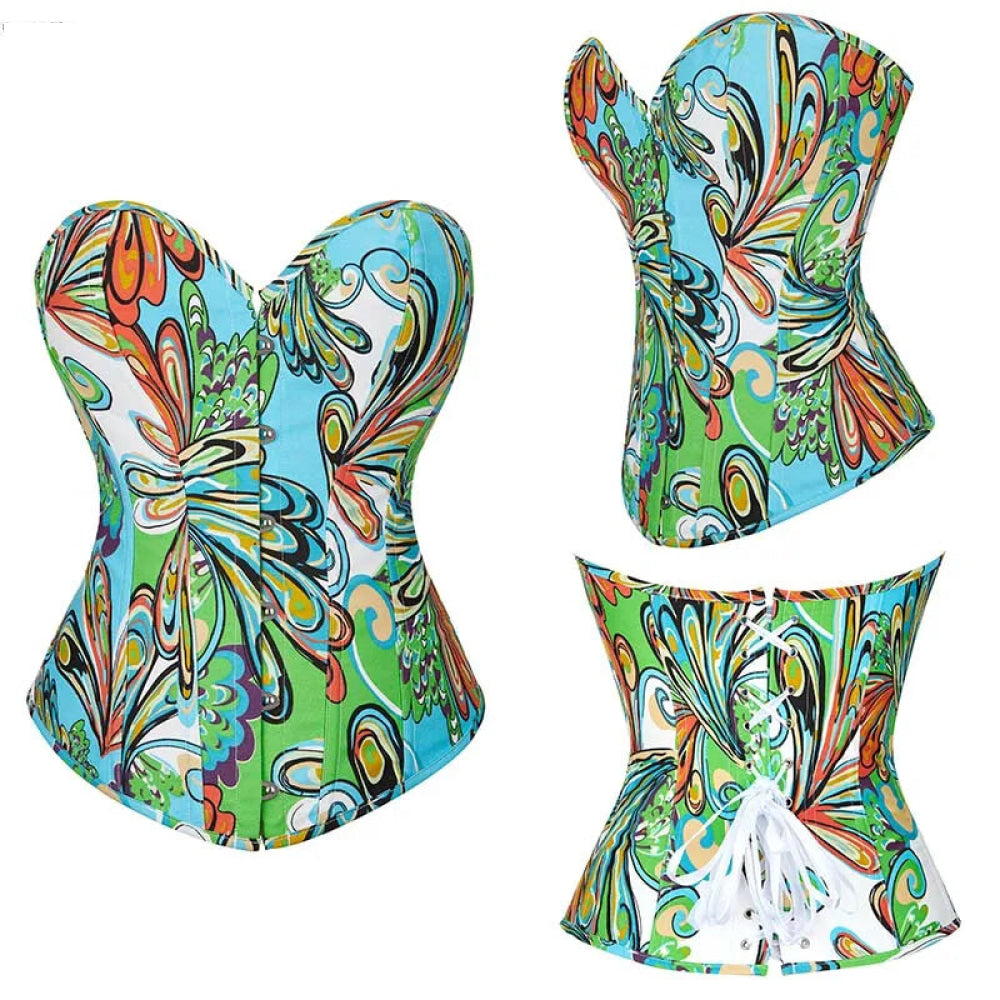 This product is a stylish and alluring lingerie piece designed for women of all sizes. It features a butterfly print corset top with a matching g-string, combining comfort, support, and a fashionable look. The design includes adjustable back lacing and a front busk closure, making it both functional and attractive.