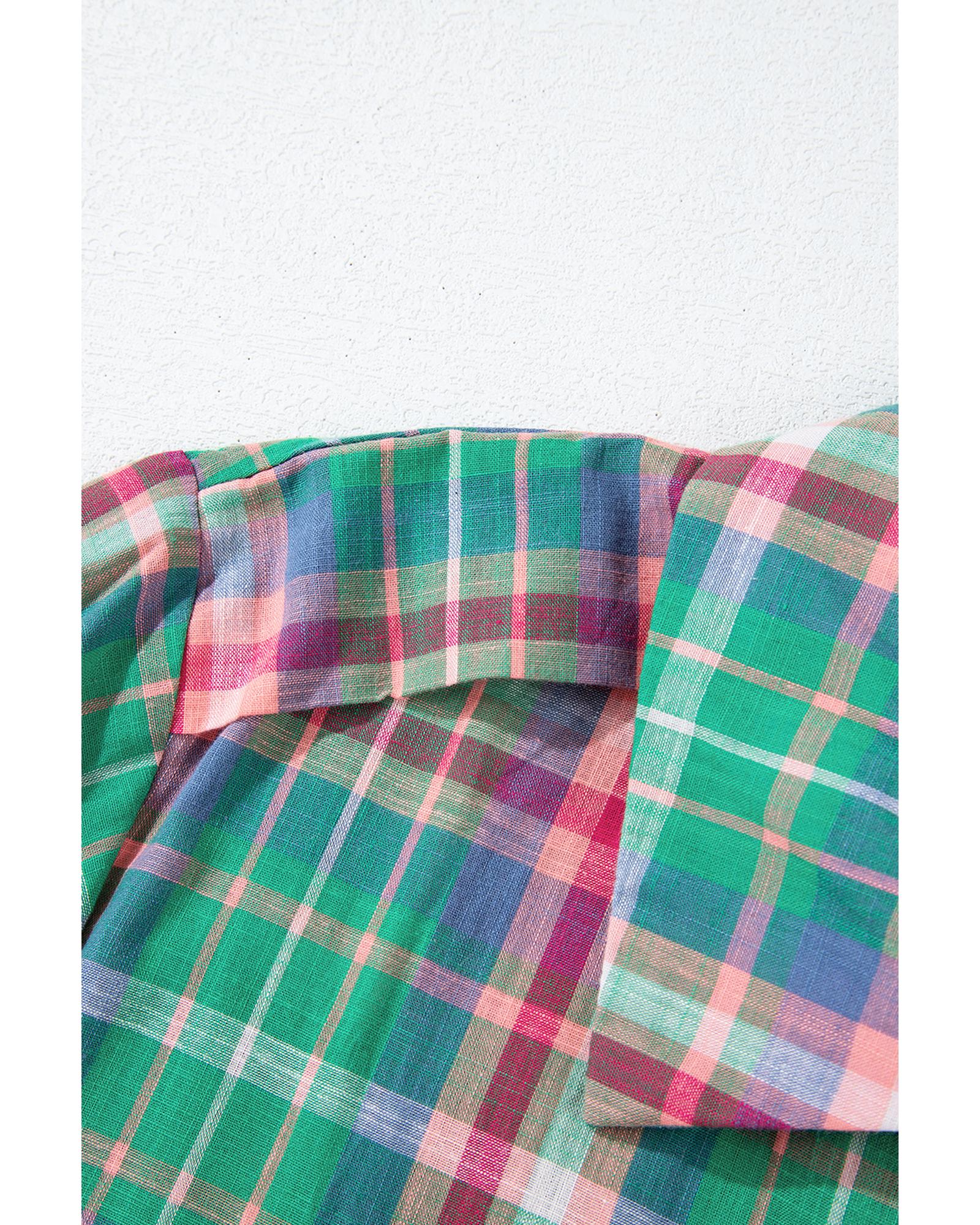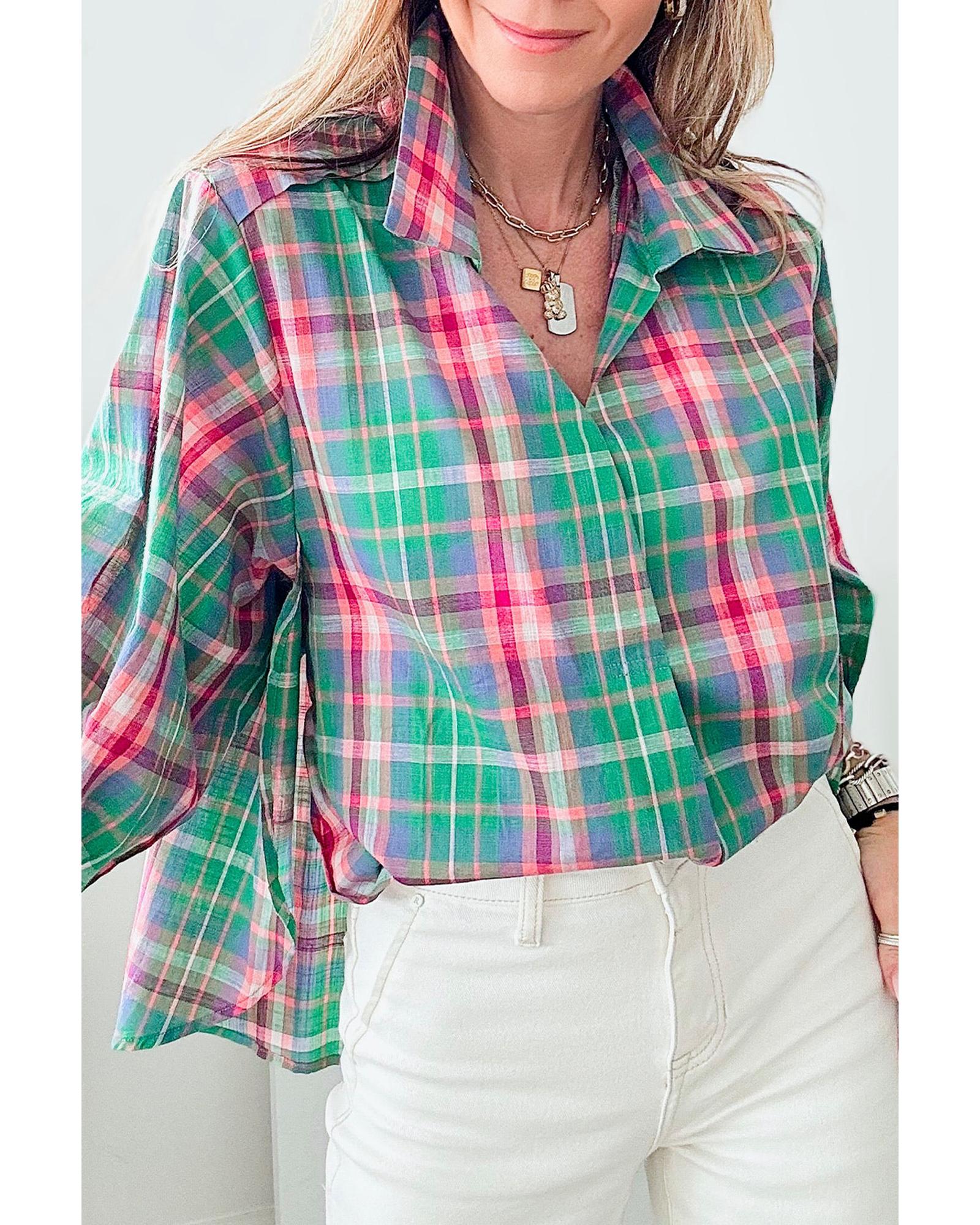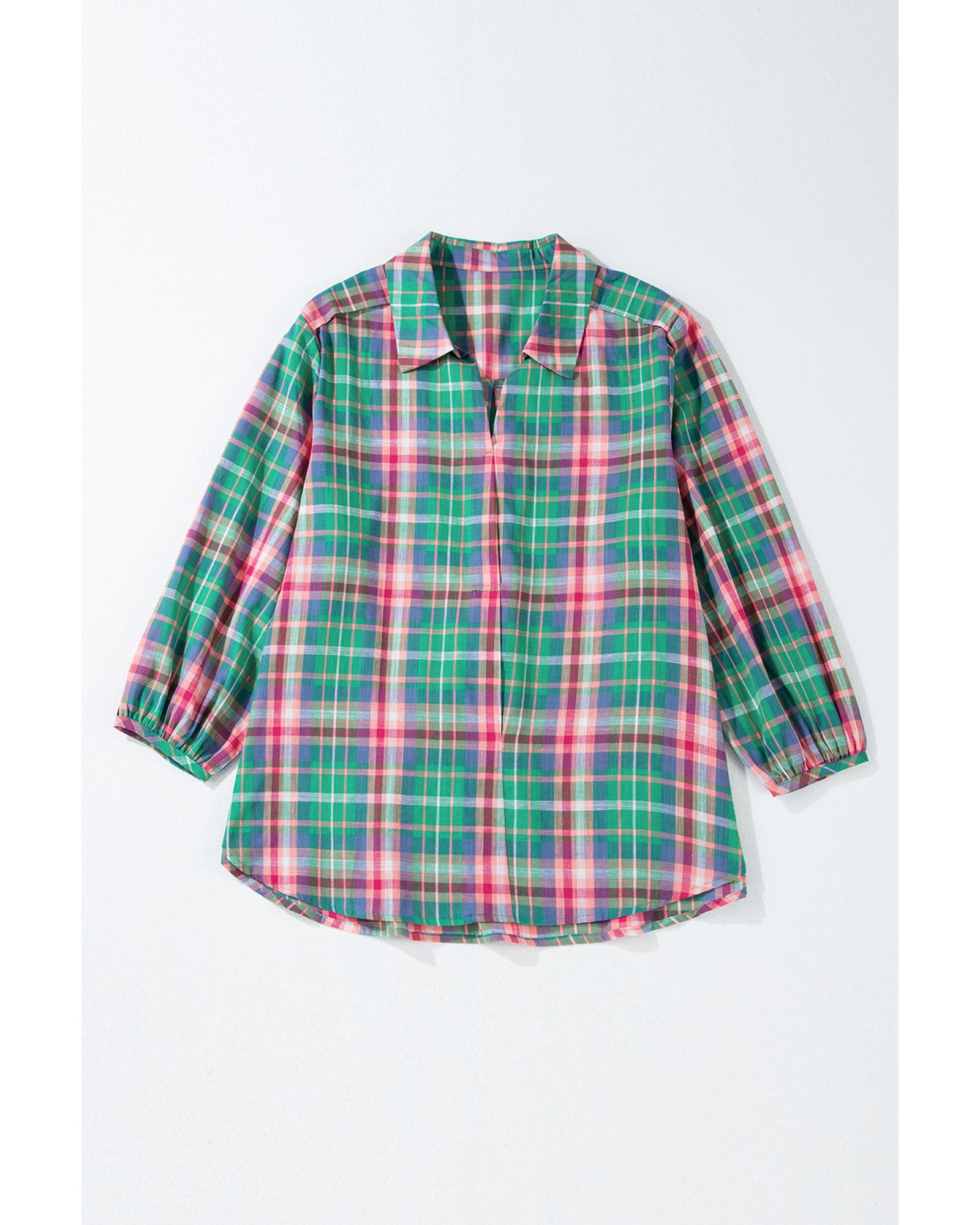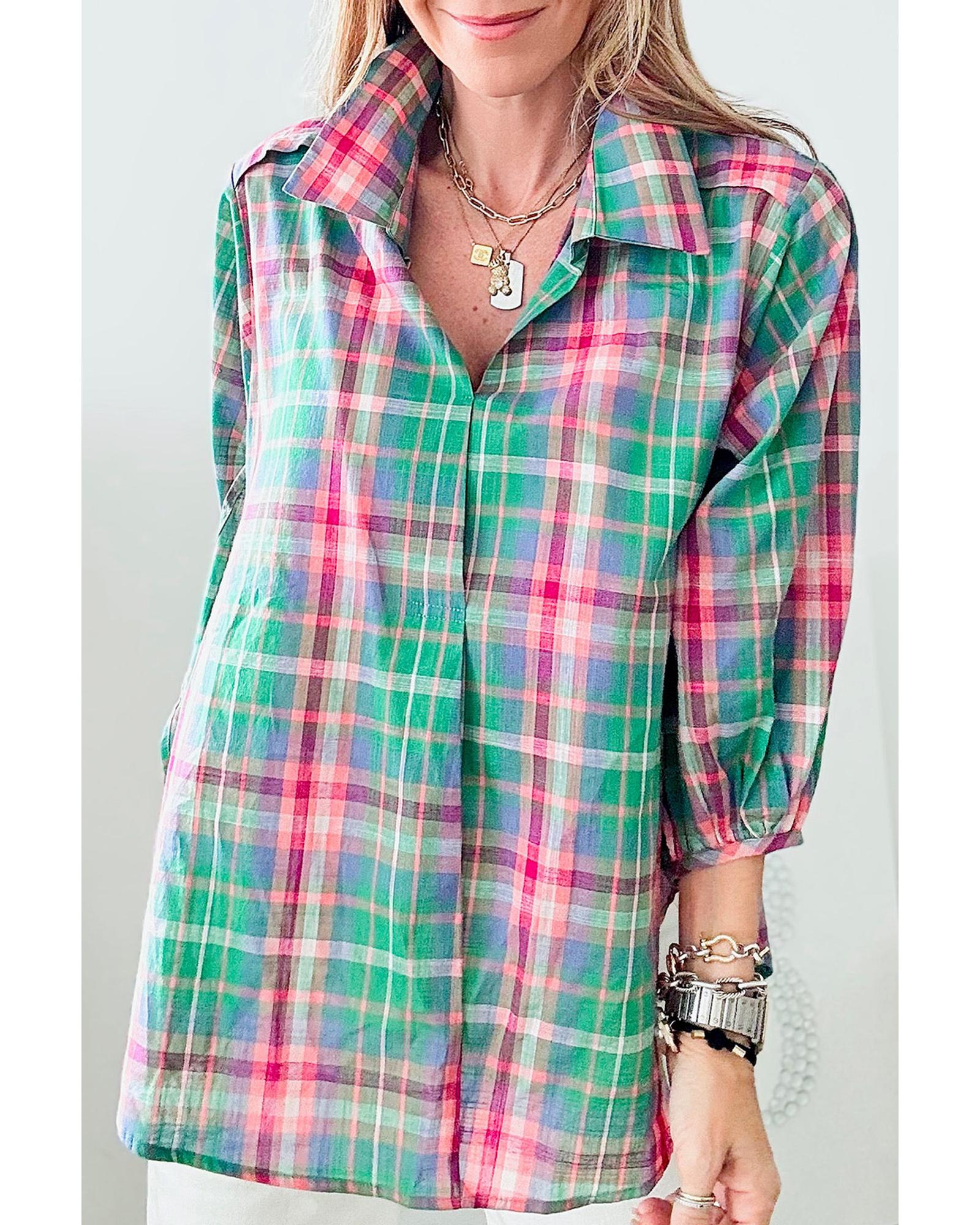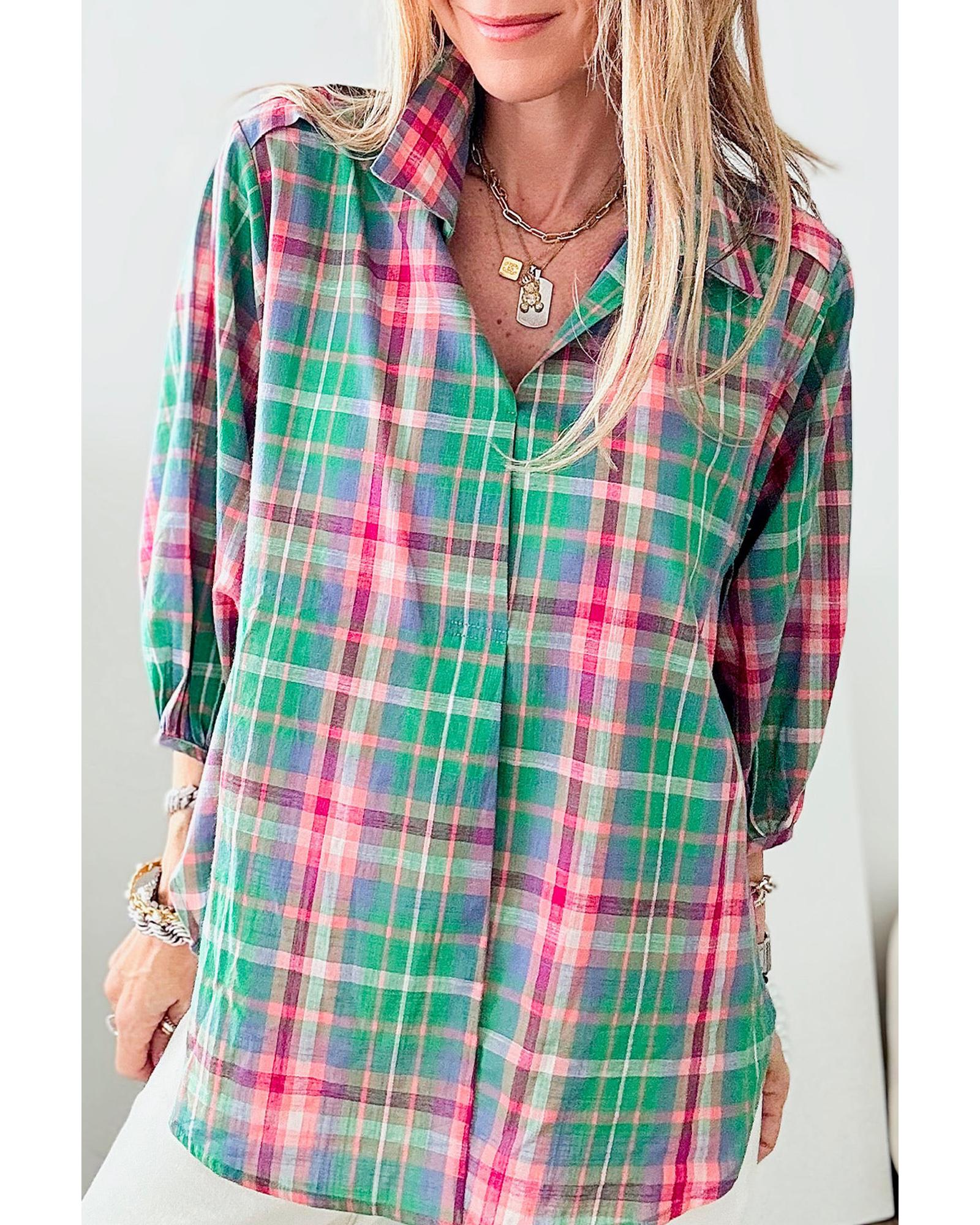 This green checkered shirt features a classic plaid pattern with a relaxed fit, making it suitable for both casual and formal occasions. The 3/4 sleeves and collar add timeless style, while the loose fit provides comfort and freedom of movement throughout the day.