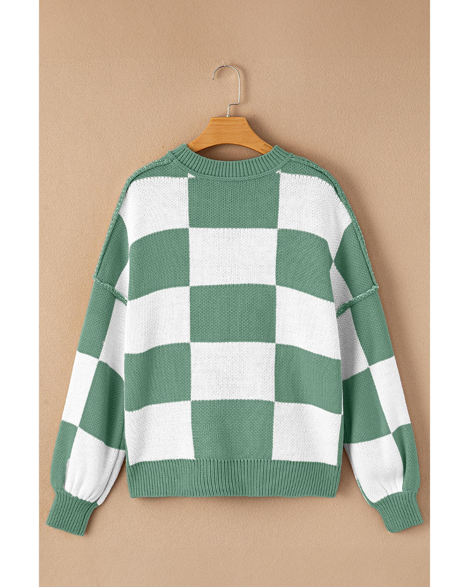This stylish green checkered sweater features a modern knit design with unique bishop sleeves, offering an elegant and trendy look. Crafted from high-quality acrylic fabric, it provides a soft and comfortable wearing experience. The fitted silhouette and high elasticity ensure a flattering fit suitable for various occasions.