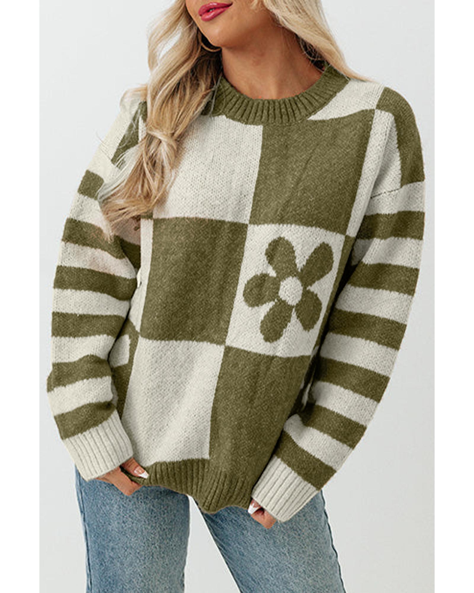 This sweater features a trendy checkered floral print design with striped sleeves, combining style and warmth. It is crafted from fine knit material, offering a comfortable fit for everyday wear. The relaxed silhouette and ribbed cuffs provide a modern and cozy look suitable for various occasions.