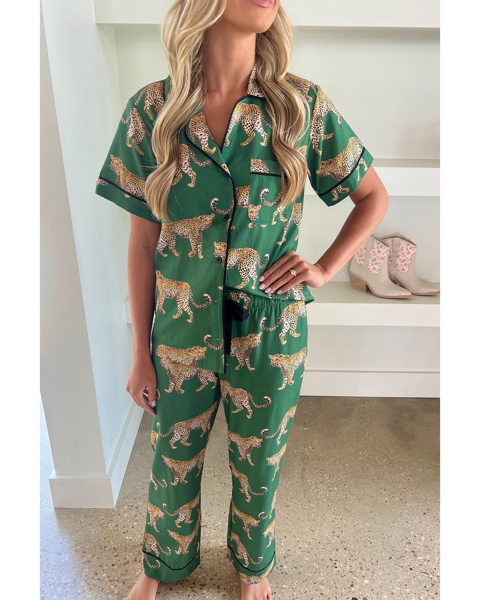 This pajama set features a stylish green cheetah print design, combining comfort and trendy fashion. It includes a short sleeve shirt and matching pants, making it suitable for warmer nights. Crafted from soft and breathable fabric, it offers a comfortable sleep experience.