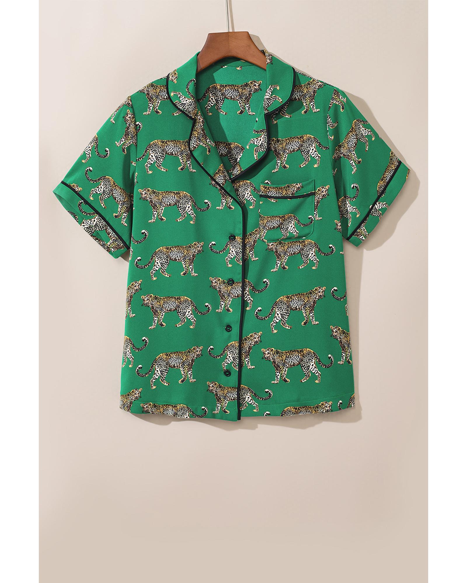 Green Cheetah Print Short Sleeve Shirt and Pants Pajama Set – M