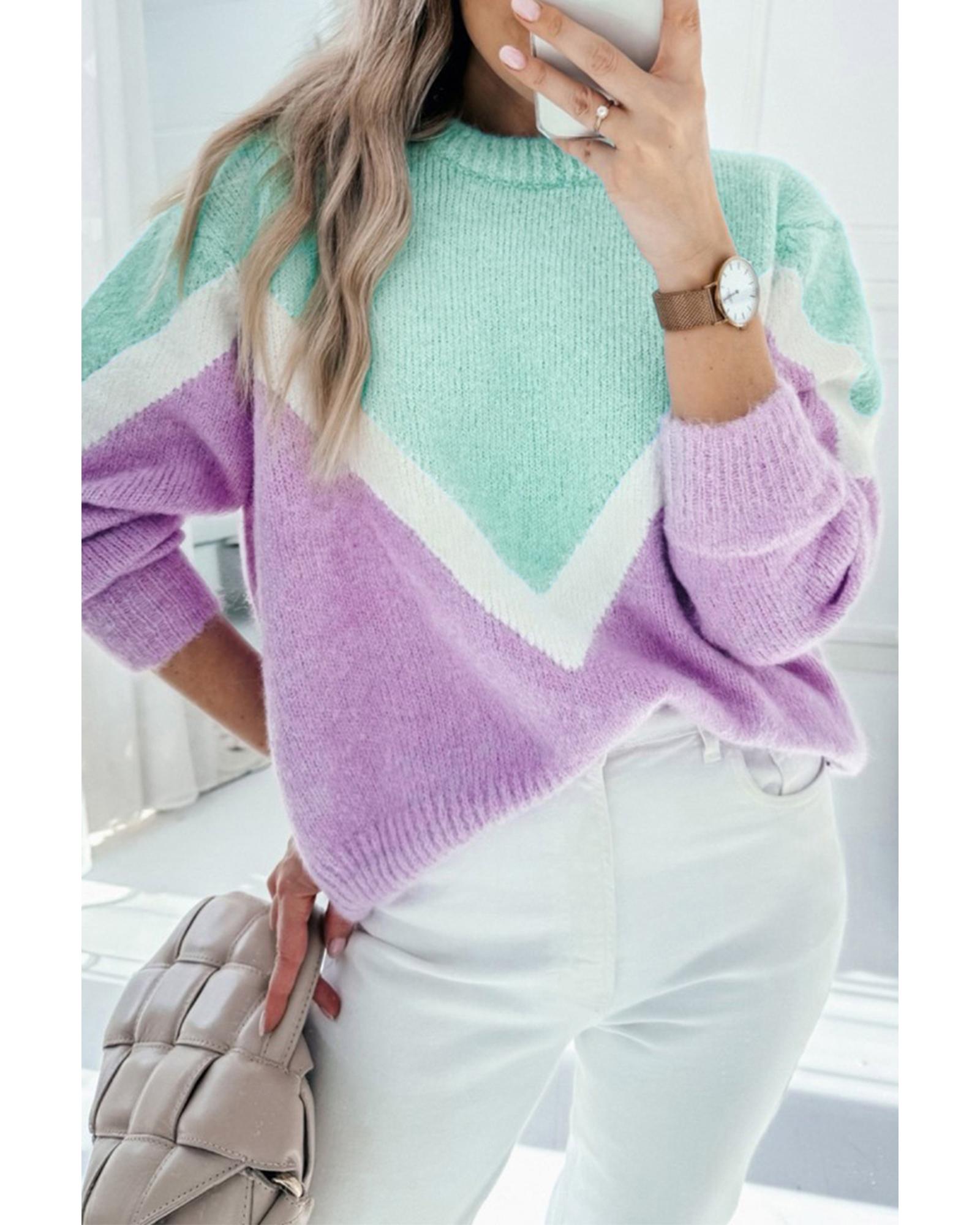 This sweater features a modern design with a vibrant chevron pattern, adding a stylish touch to any outfit. Crafted with a ribbed knit texture, it offers both comfort and a trendy appearance. The drop shoulder silhouette provides a relaxed fit, making it suitable for various occasions.