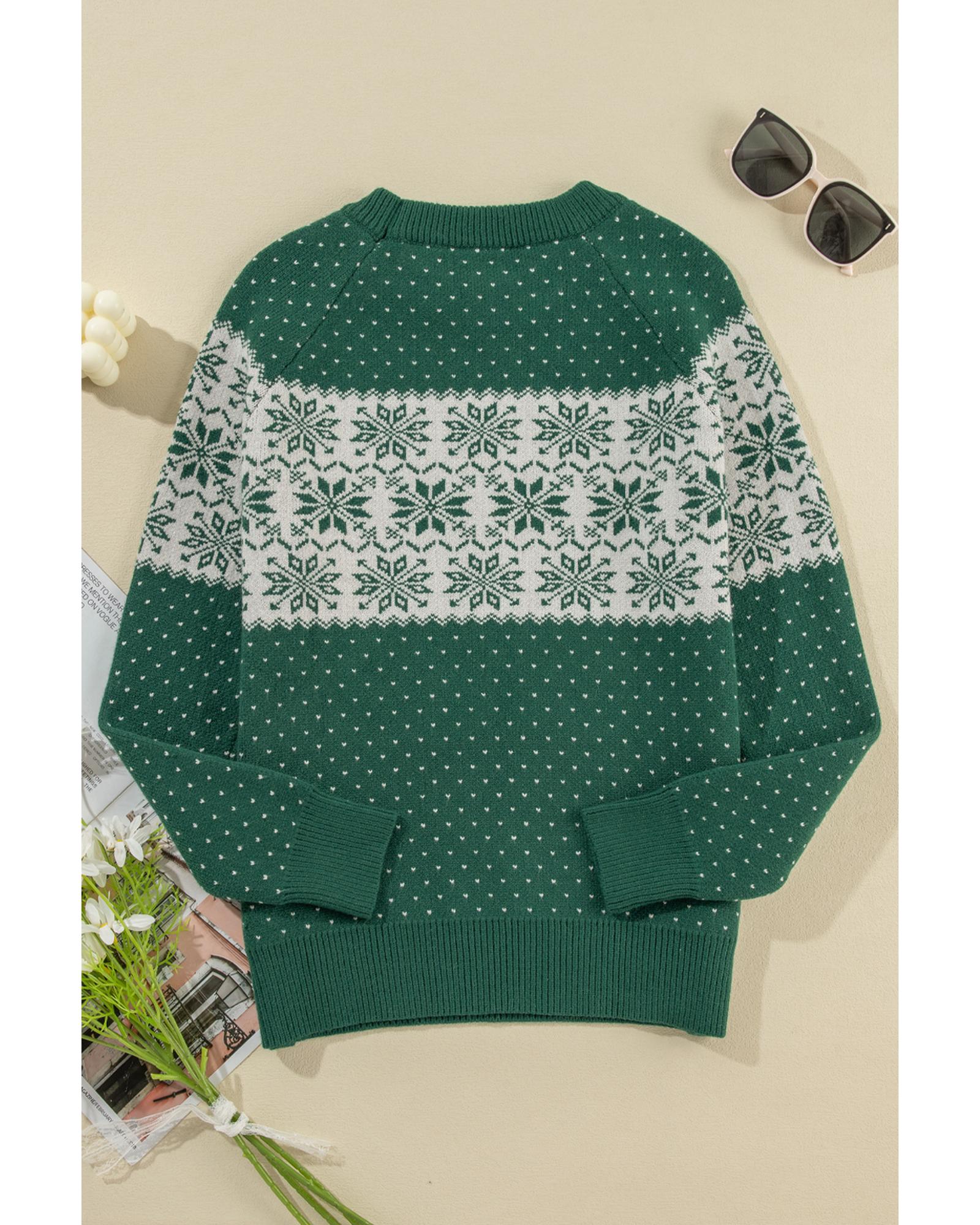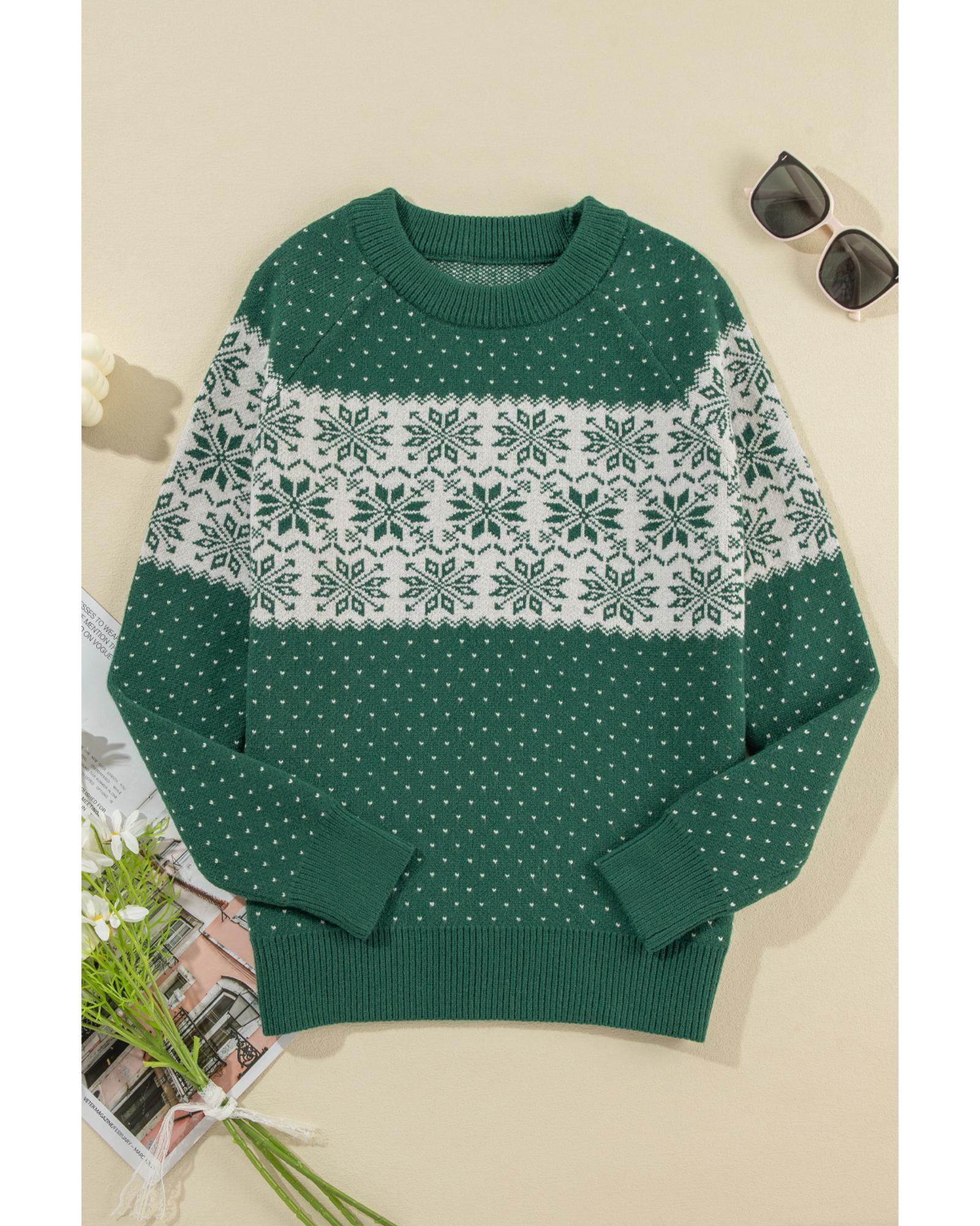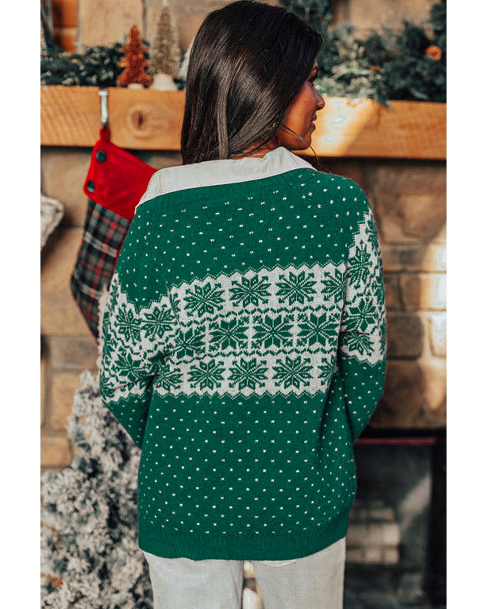 Green Christmas Snowflake Dotted Print Round Neck Sweater – M