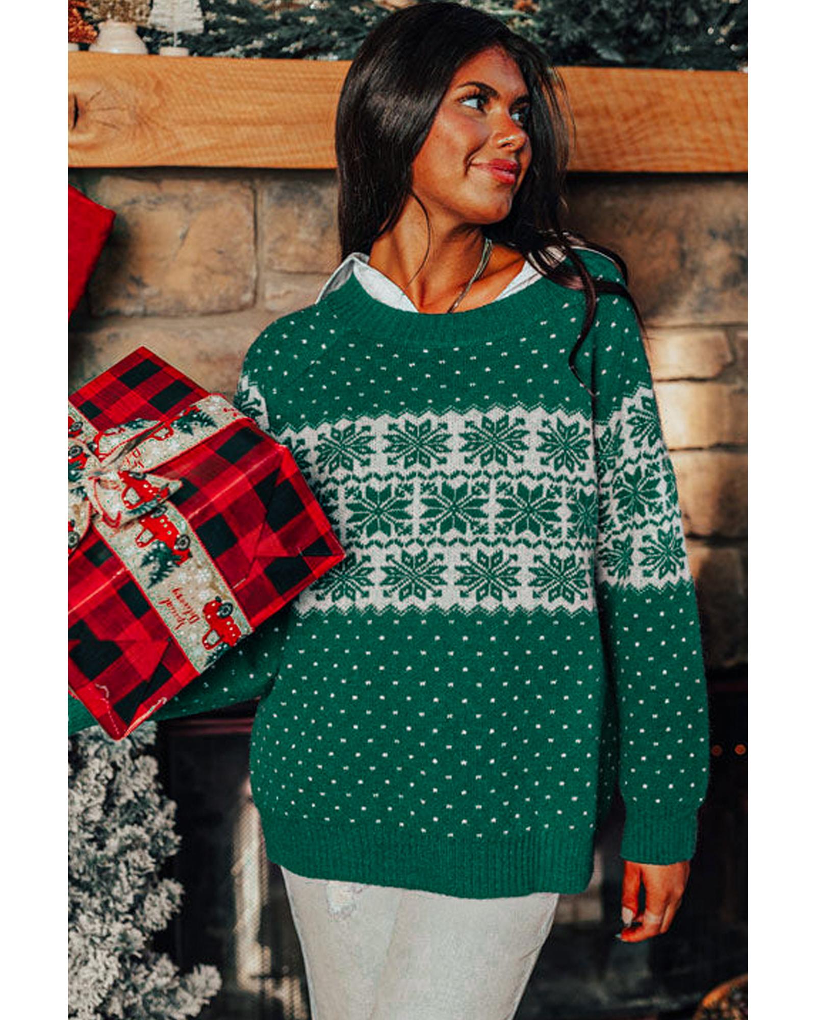 This festive sweater features a charming snowflake and dotted print design, perfect for celebrating the holiday season. Its classic round neck and soft, comfortable fabric make it an ideal choice for winter days and Christmas gatherings. The versatile style ensures you stay cozy and stylish throughout the season.
