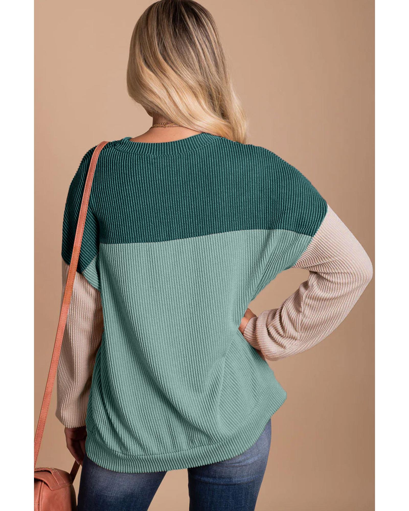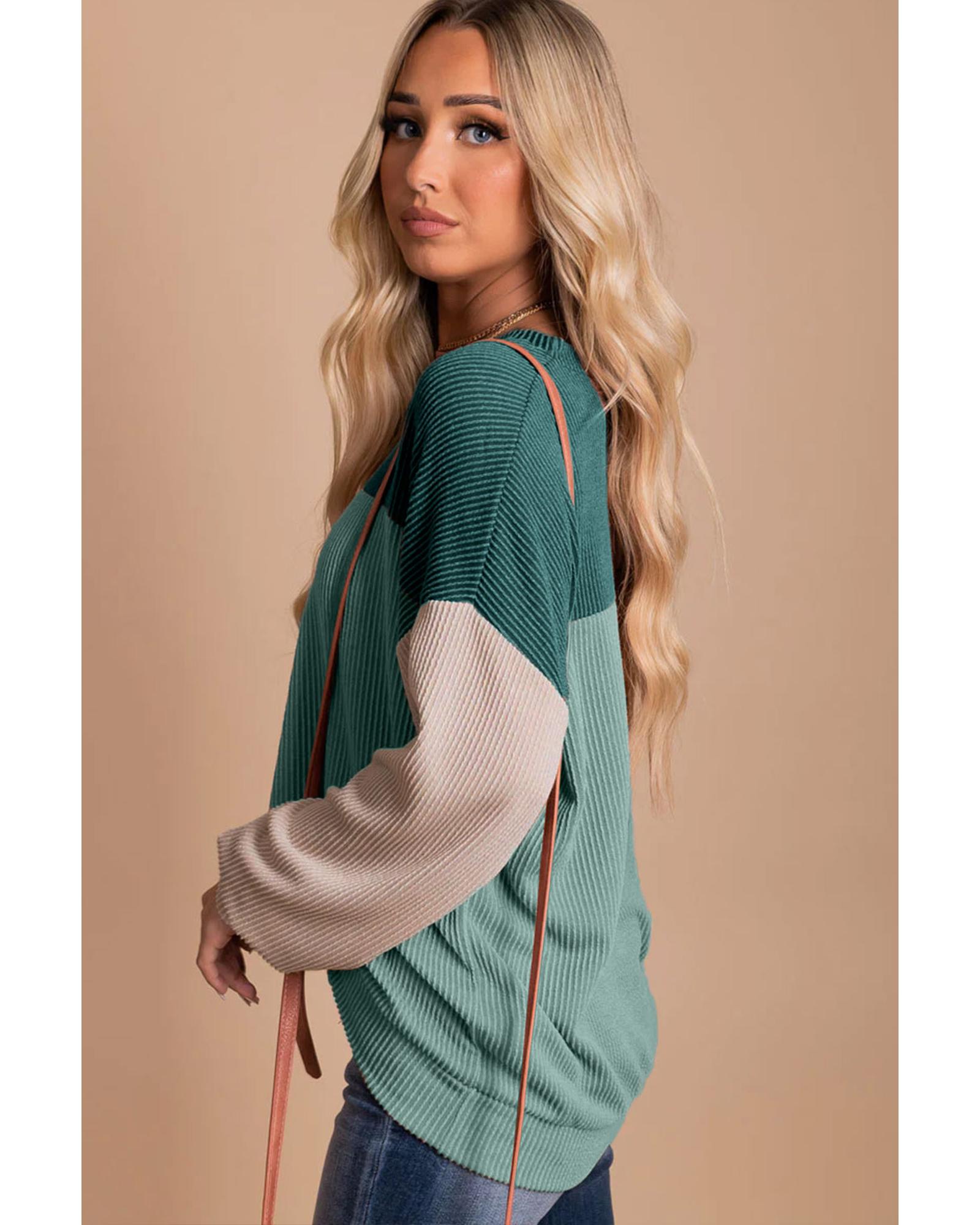 This green color block long sleeve ribbed top offers a stylish and comfortable fit, suitable for both casual and formal occasions. Its unique color block pattern and ribbed detailing add a trendy touch to your wardrobe.