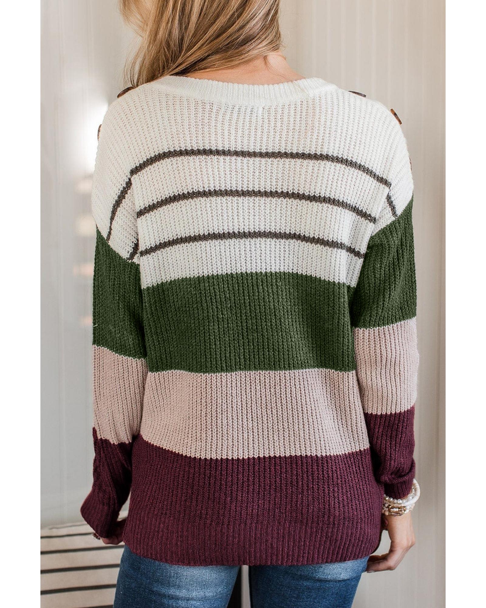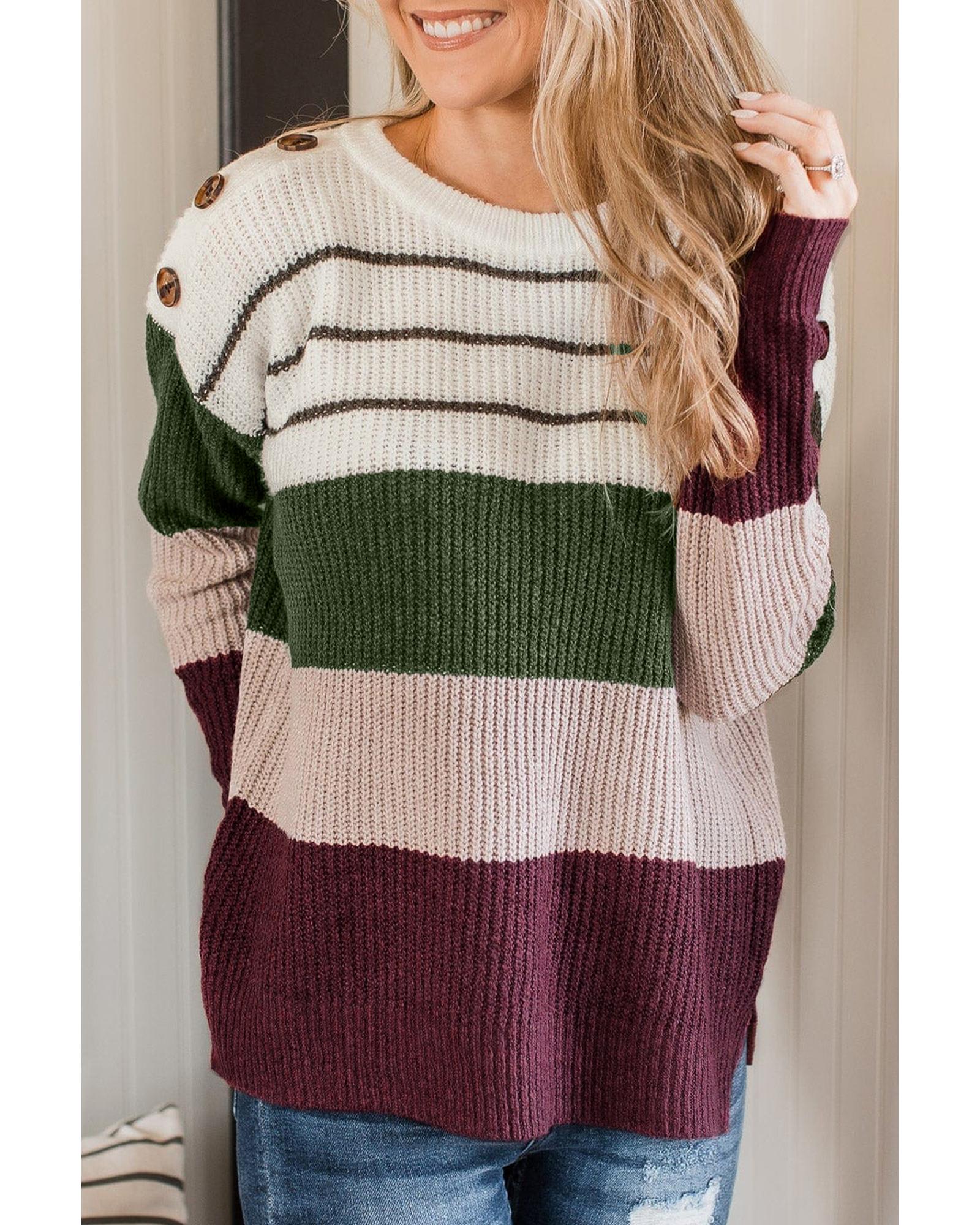 Green Color Block Striped Buttoned Shoulder Split Sweater – L