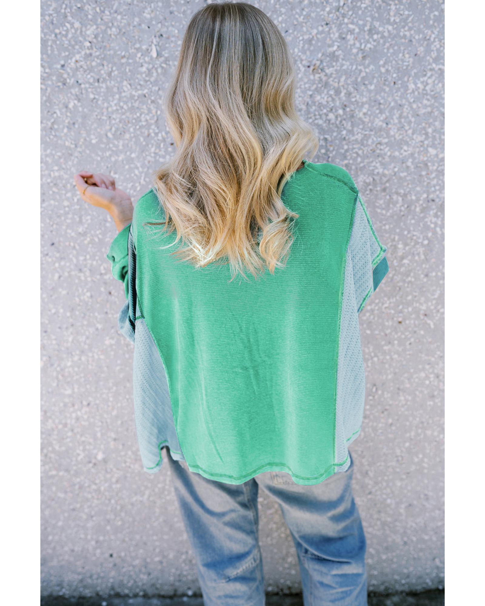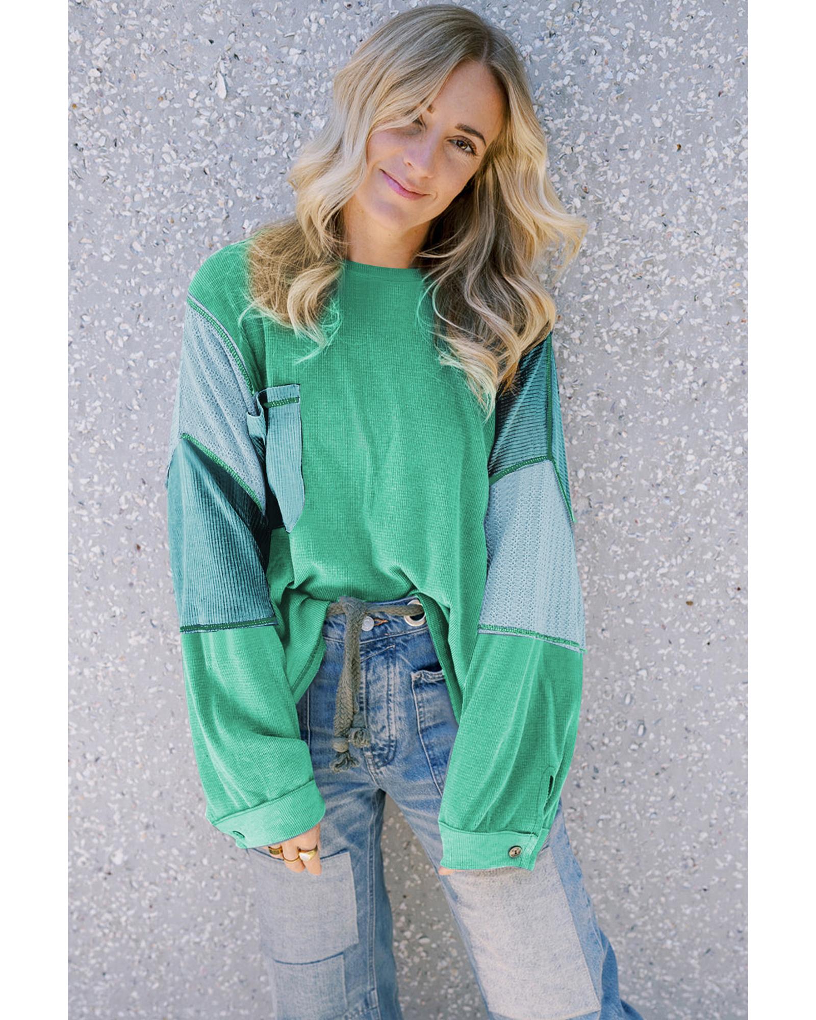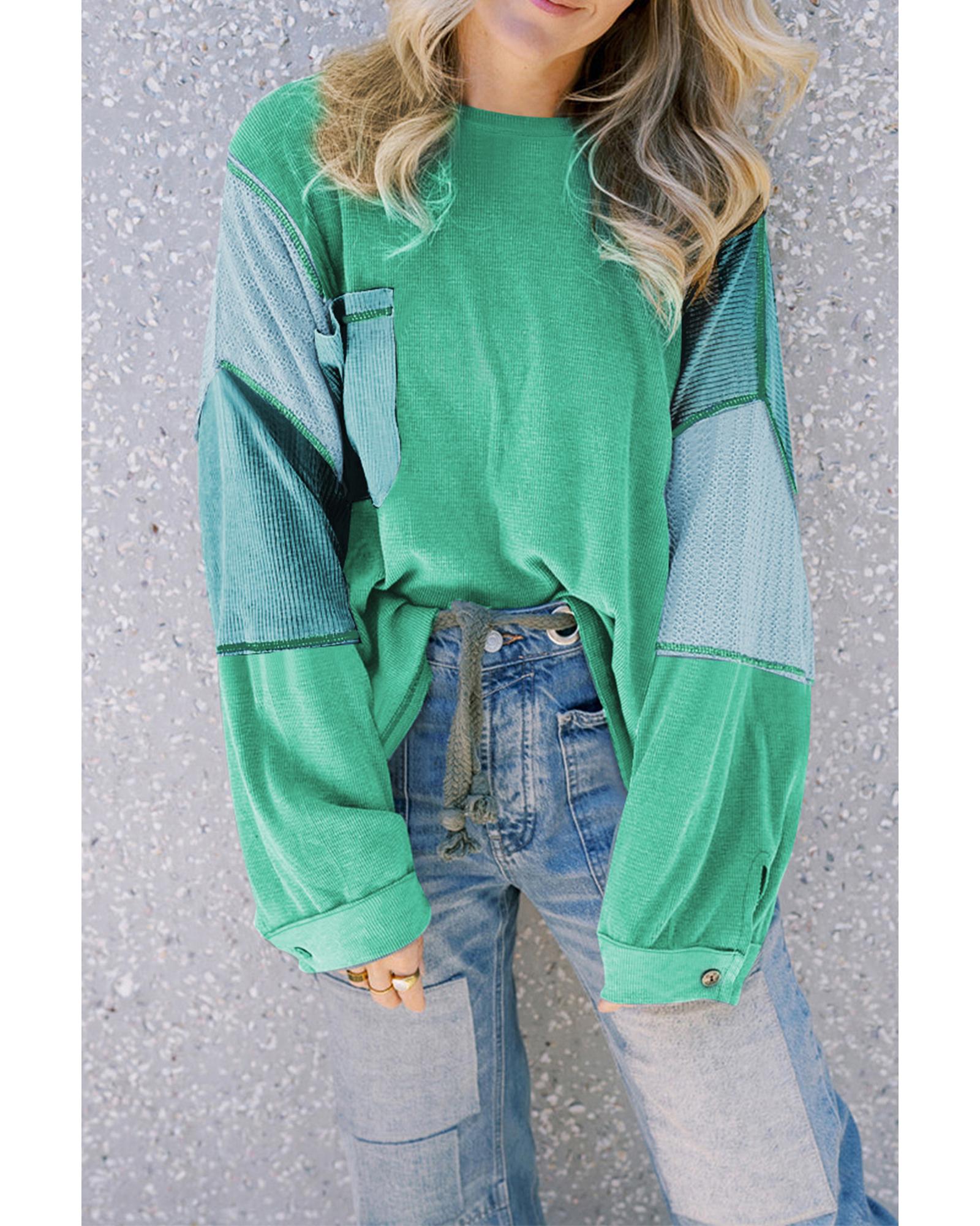 Green Colorblock Stitching Patchwork Buttoned Long Sleeve Top – L