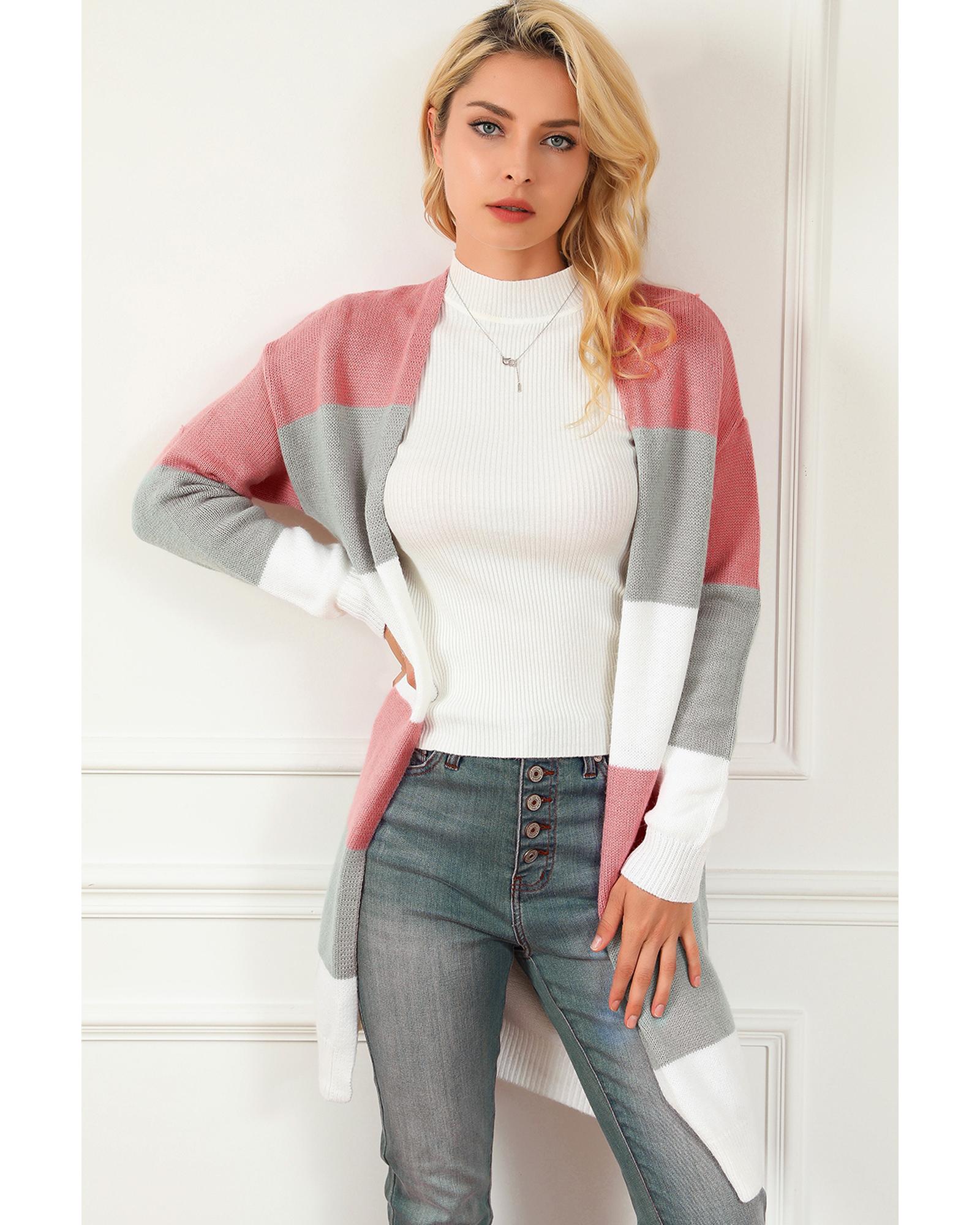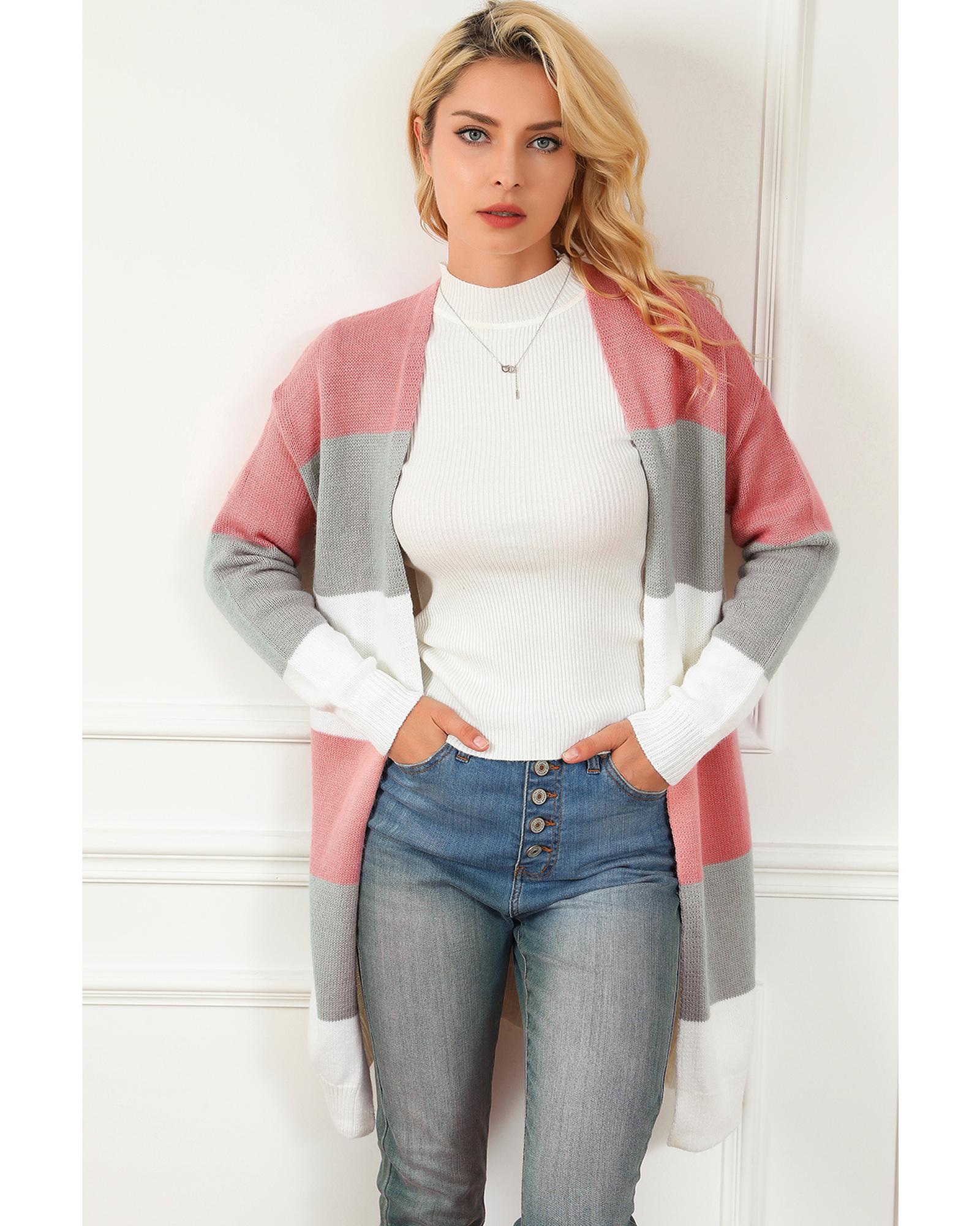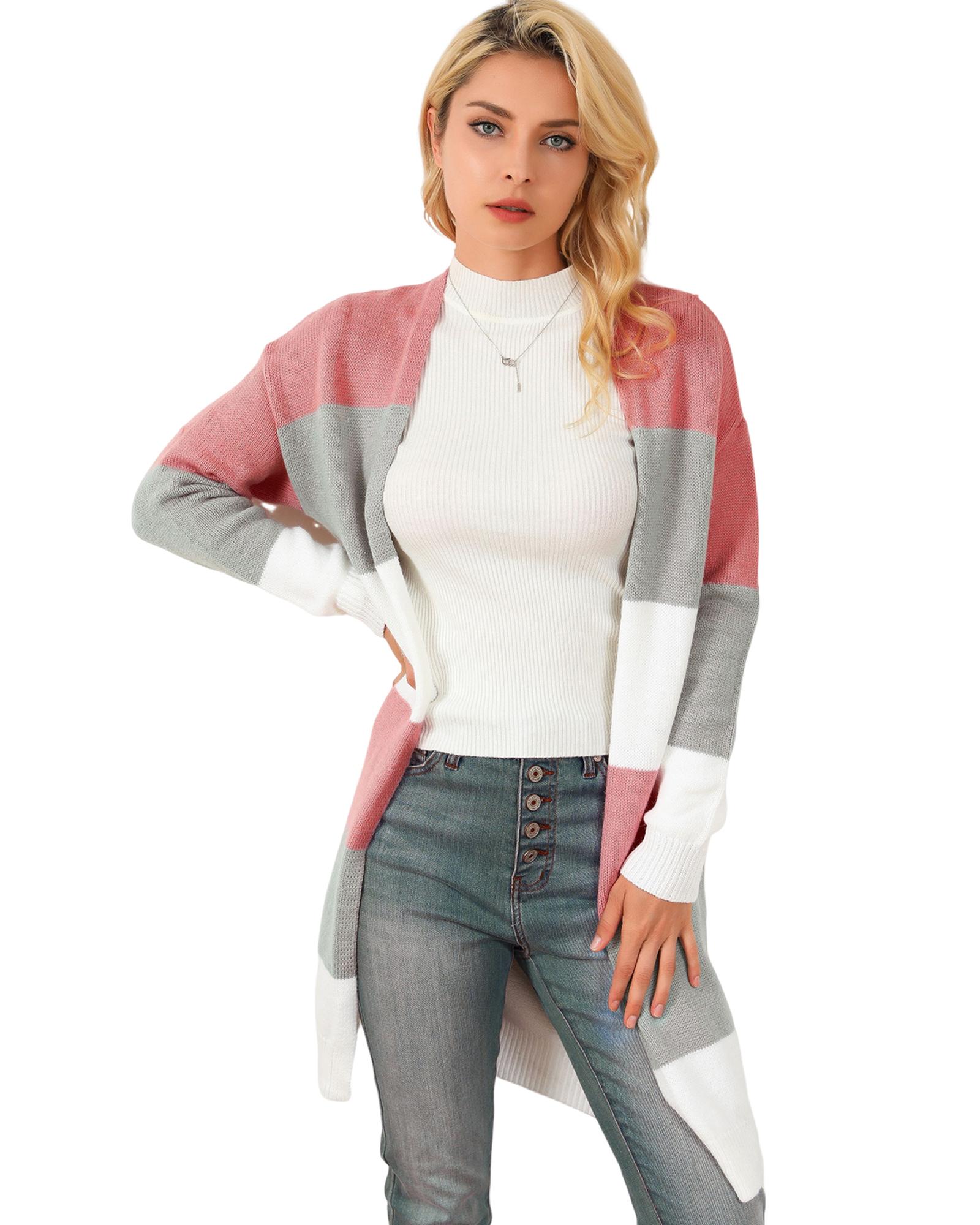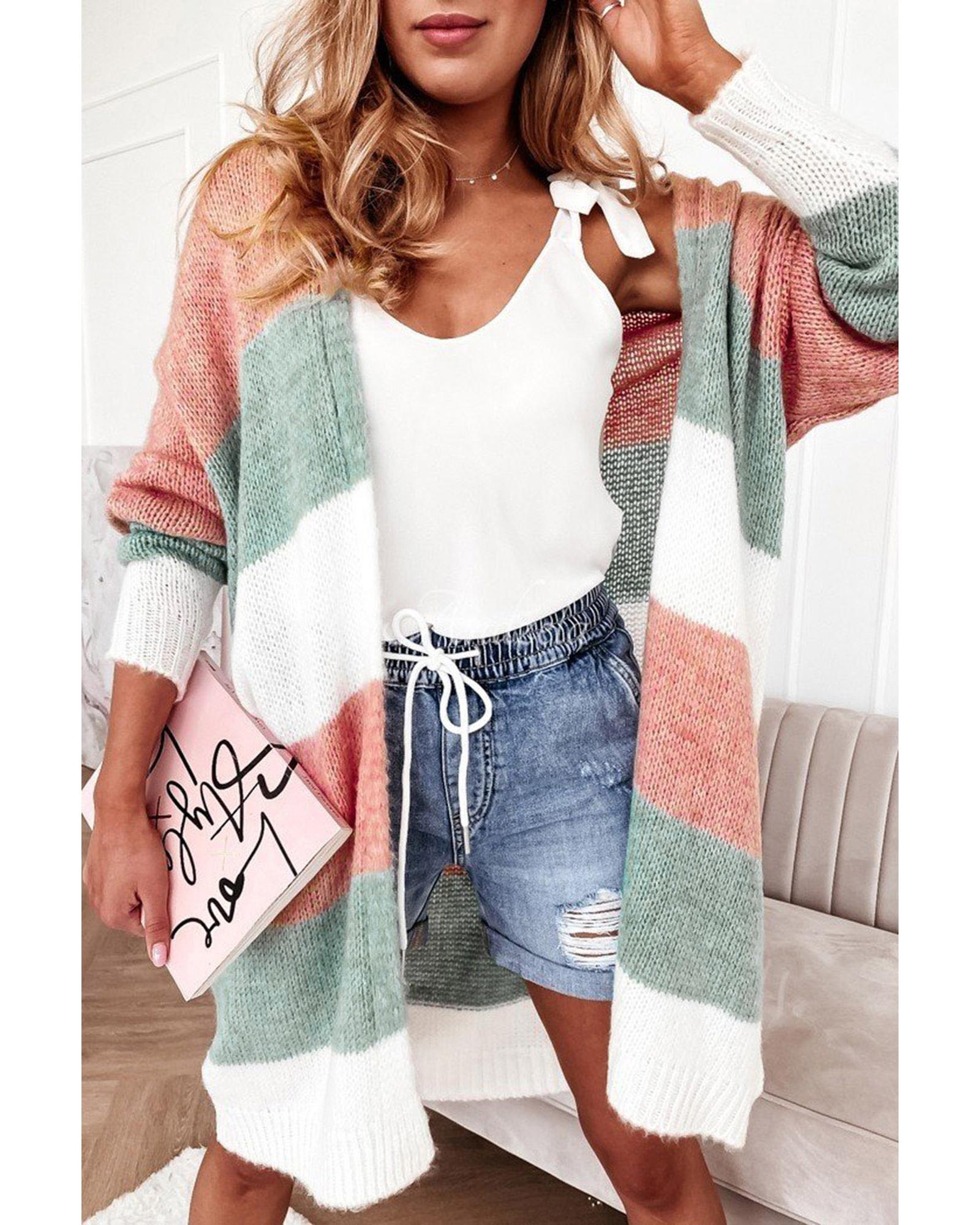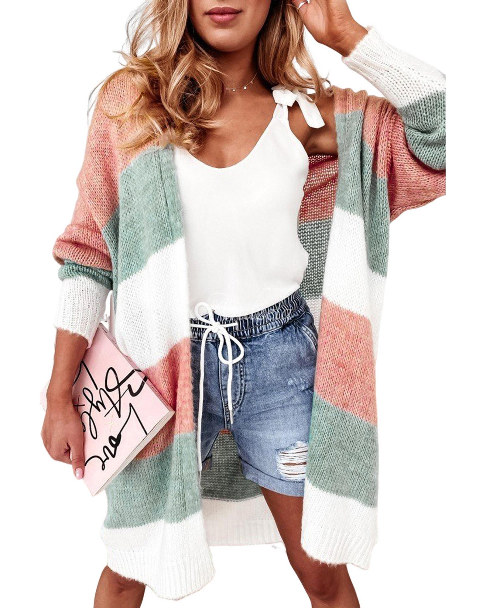 This green colorblock stripe open-front cardigan offers a stylish and casual look, perfect for fall and winter outfits. Its relaxed silhouette and dropped shoulder design provide comfort and ease of pairing with various clothing styles. Made from a soft woolen knit, it ensures warmth and comfort throughout the day.