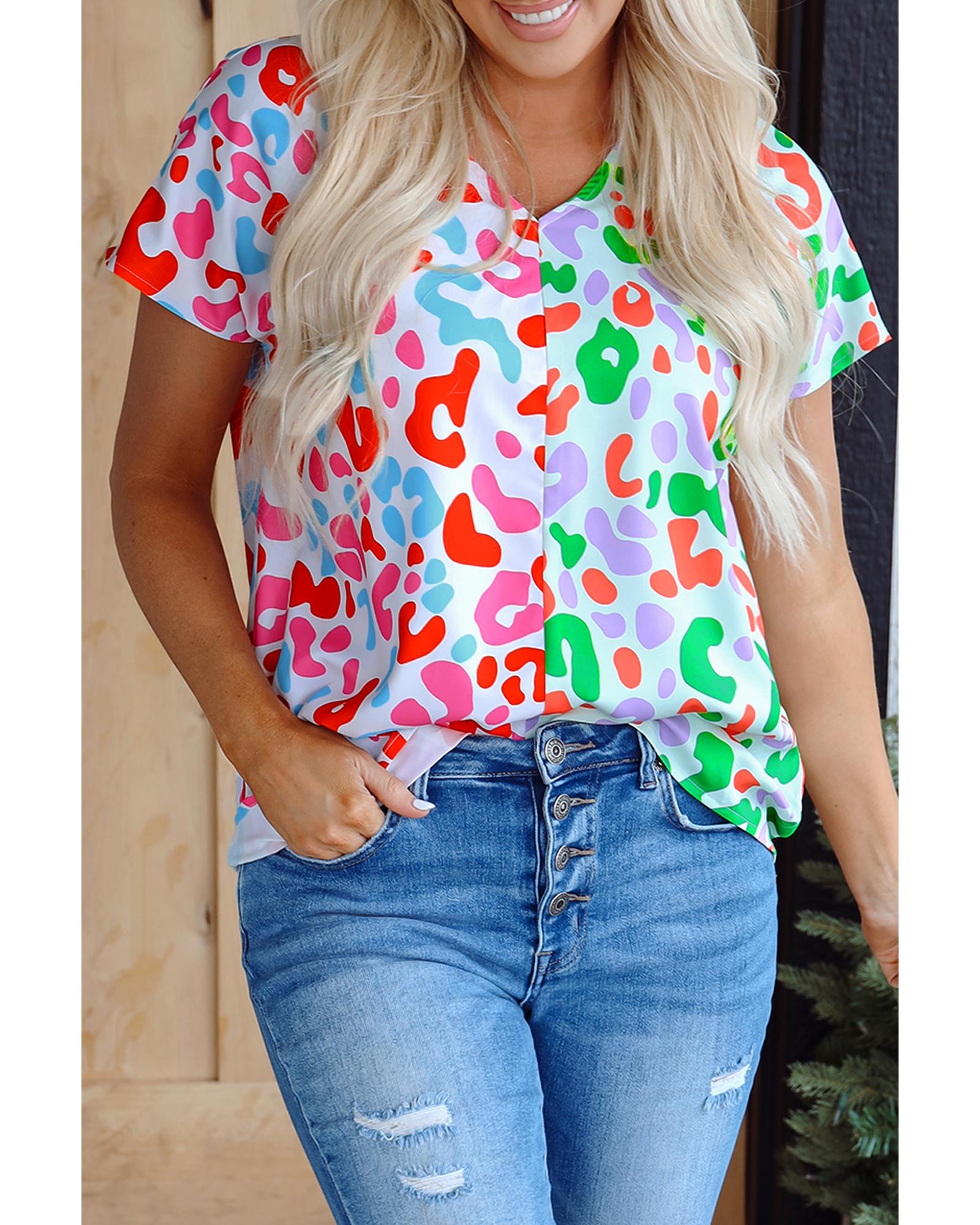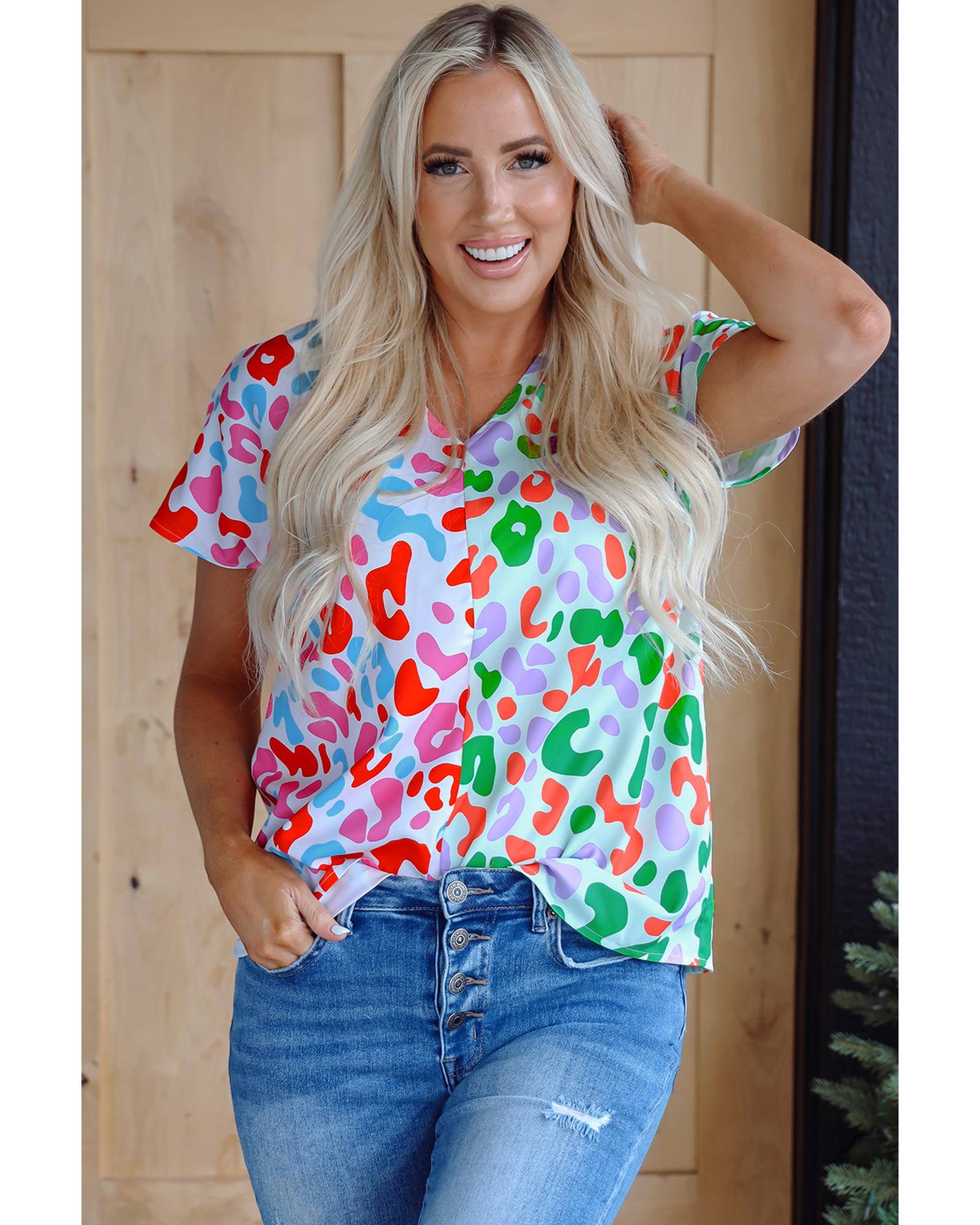 Green Contrast Leopard Print V Neck Short Sleeve Blouse – S