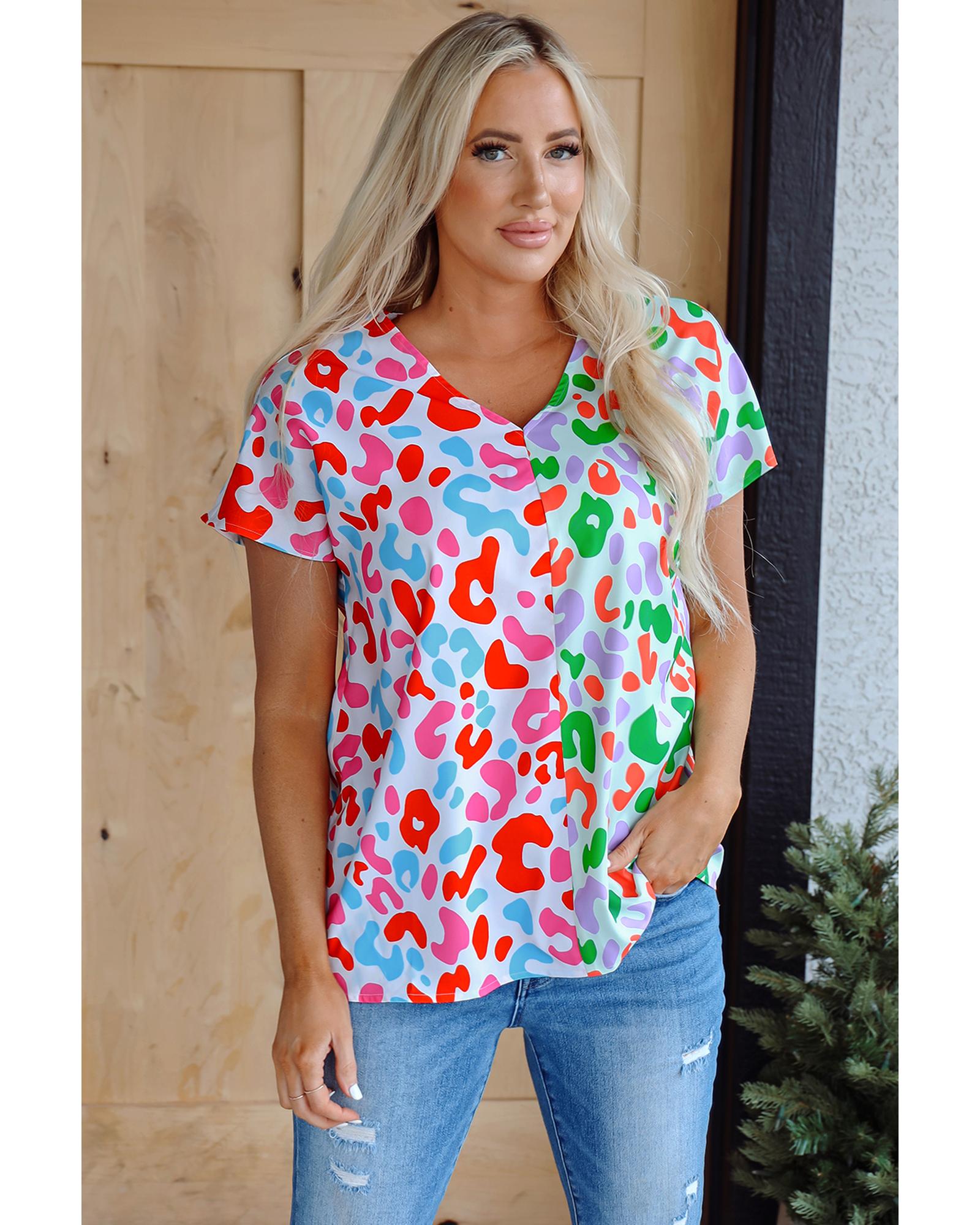 This stylish blouse features a bold leopard print design combined with a flattering V-neck cut, making it a fashionable choice for warm weather. Crafted from sleek fabric, it offers comfort and a trendy look suitable for summer days.