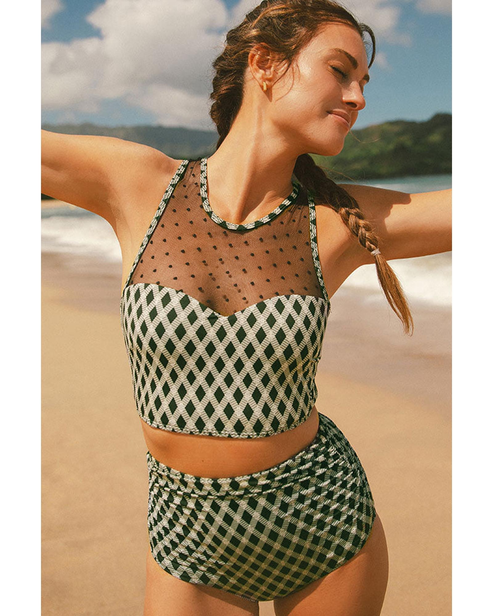 Green Dotted Mesh Plaid Patchwork High Waisted Bikini – M