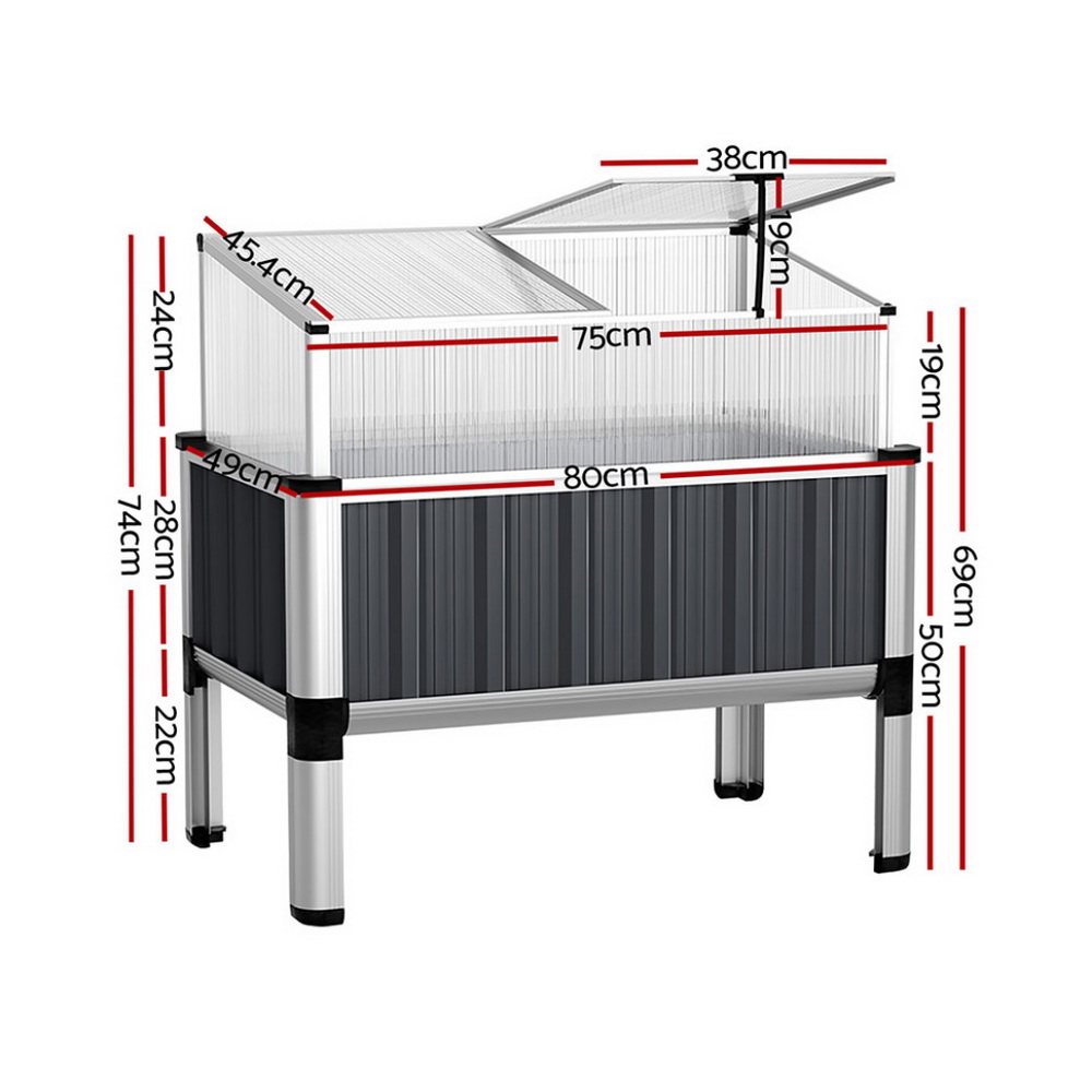 This raised garden bed is designed to support healthy plant growth and provide protection against pests and weather conditions. It features a durable aluminium frame with a metal base and a translucent polycarbonate roof that offers all-weather coverage. The tiltable roof panels allow for ventilation and climate control, while the raised height helps prevent back strain and keeps plants safe from foot traffic. Suitable for flowers, vegetables, and herbs, it is ideal for both experienced and novice gardeners.
