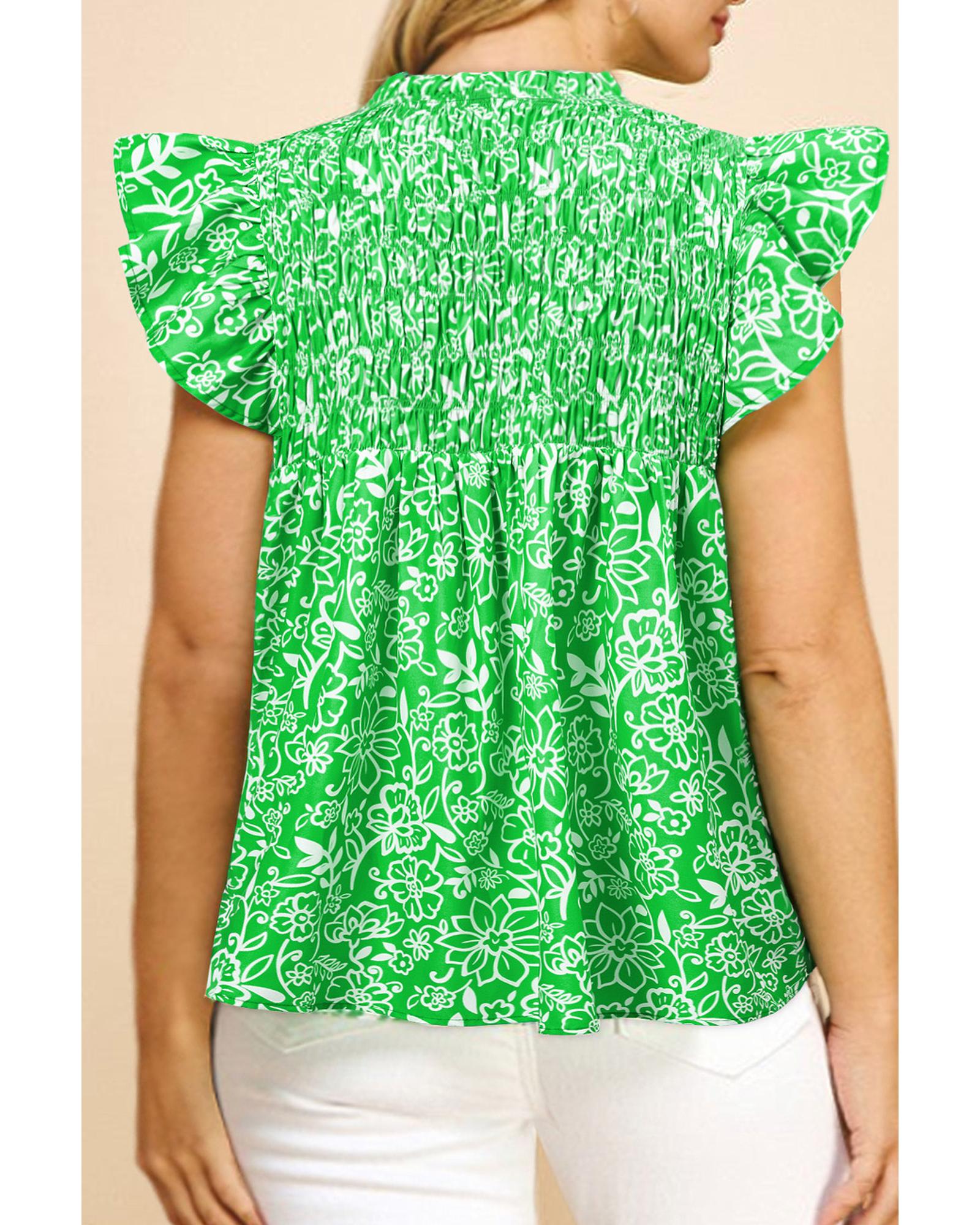 Green Floral Flutter Sleeve Shirred Notched Neck Plus Size Blouse – 4X