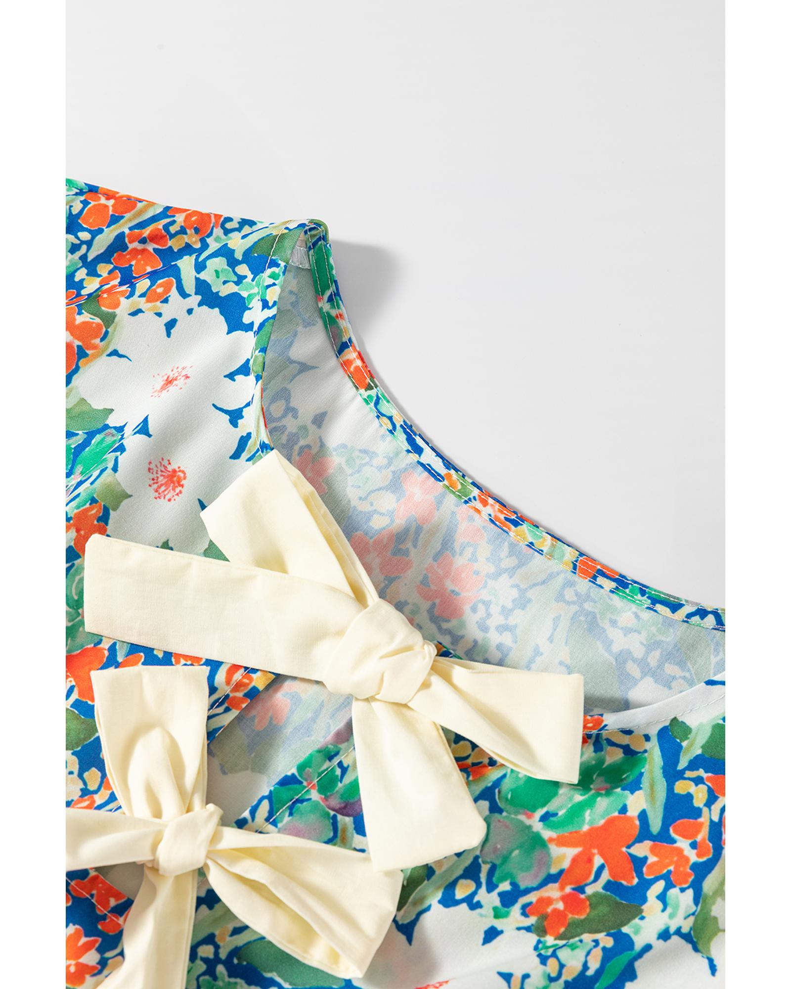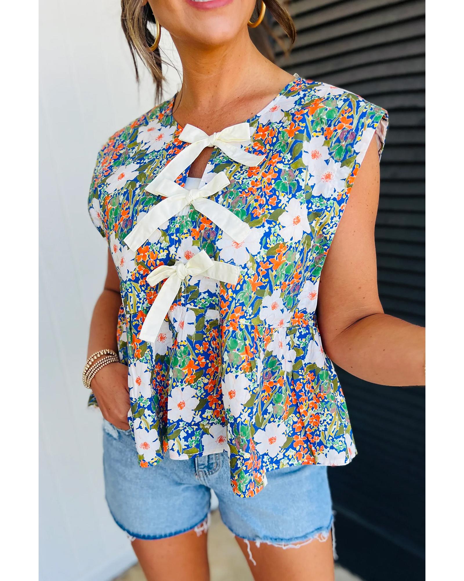This stylish sleeveless peplum blouse features a charming green floral print, perfect for adding a romantic touch to your wardrobe. The adorable bow applique detail enhances its whimsical appeal, making it a delightful choice for warm weather outings.