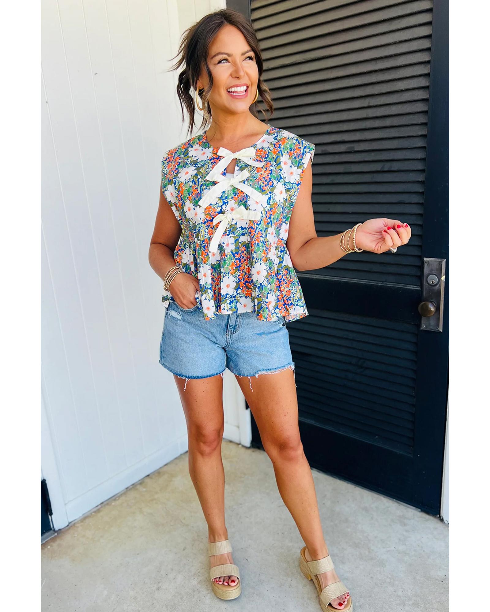 This sleeveless peplum blouse features a charming green floral print, perfect for adding a romantic touch to your wardrobe. The adorable bow applique detail enhances its whimsical appeal, making it a delightful choice for warm weather outings.