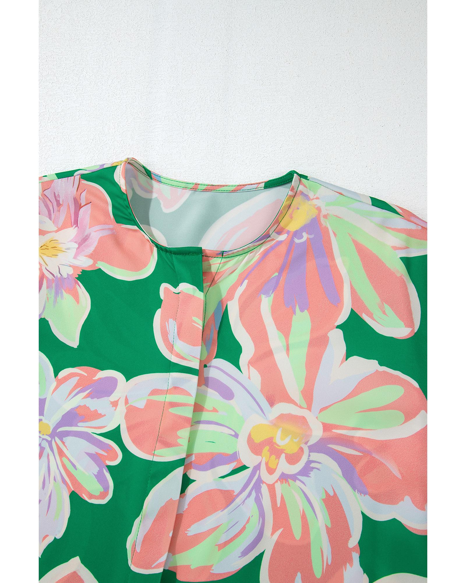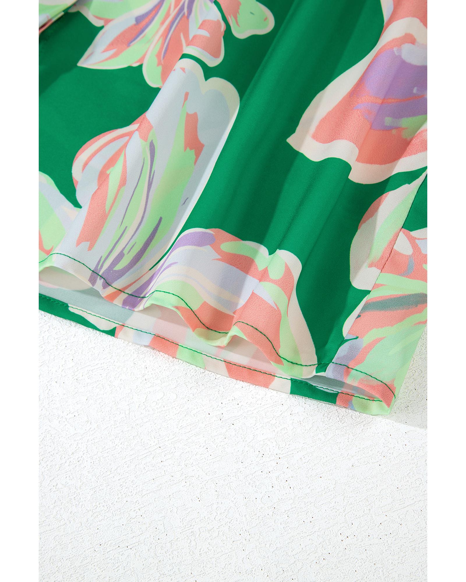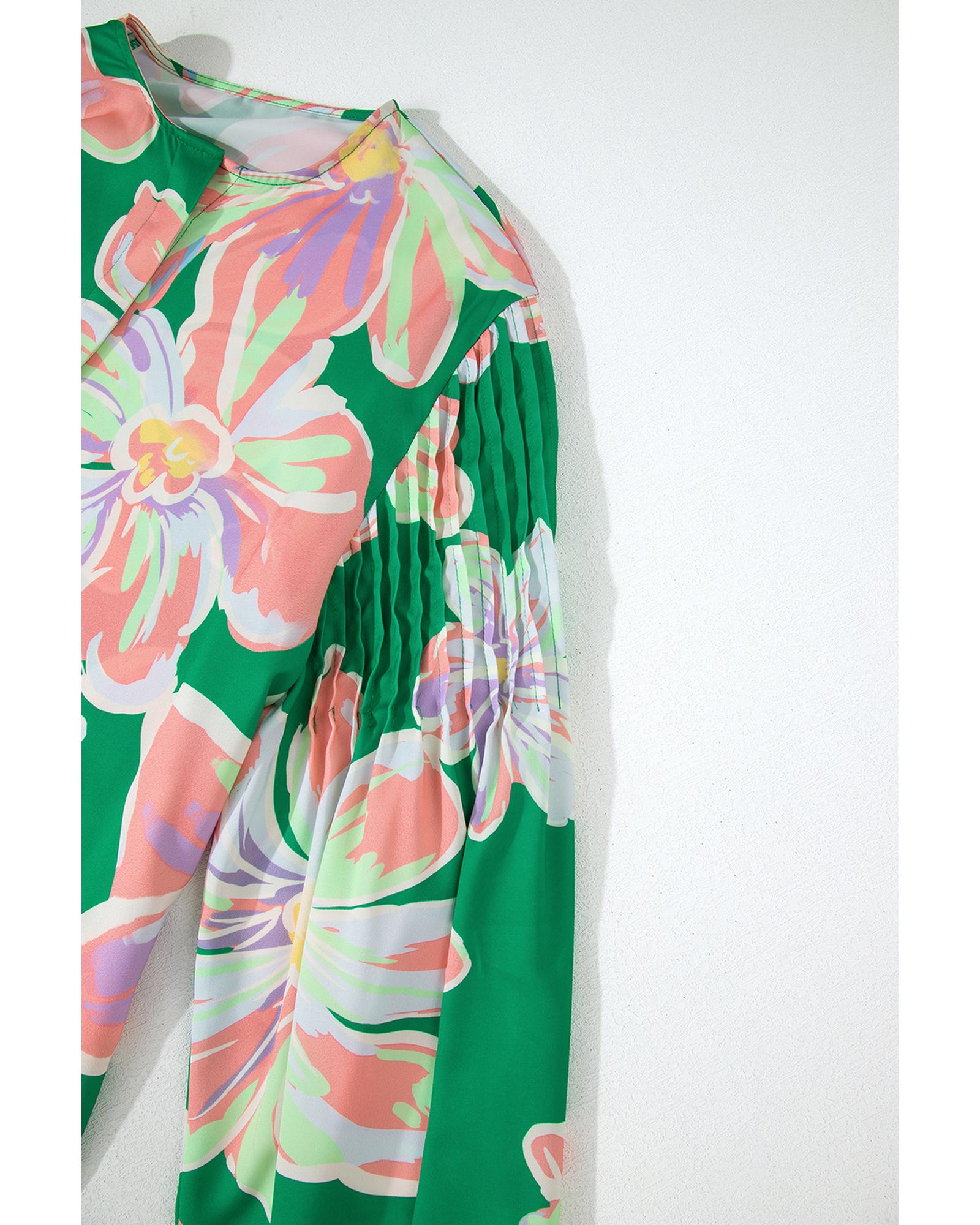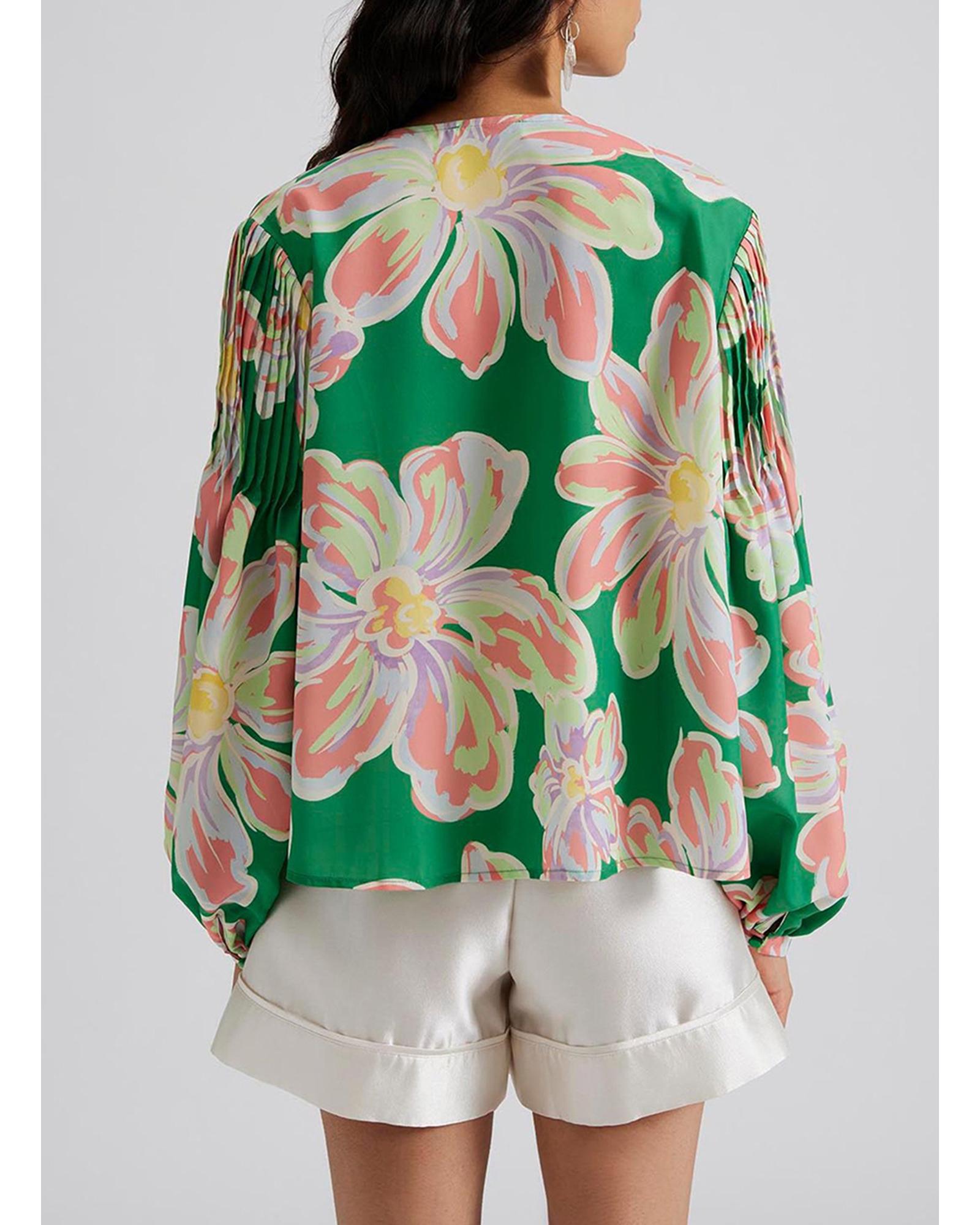 Green Floral Print Button up Pleated Puff Sleeve Loose Shirt – M