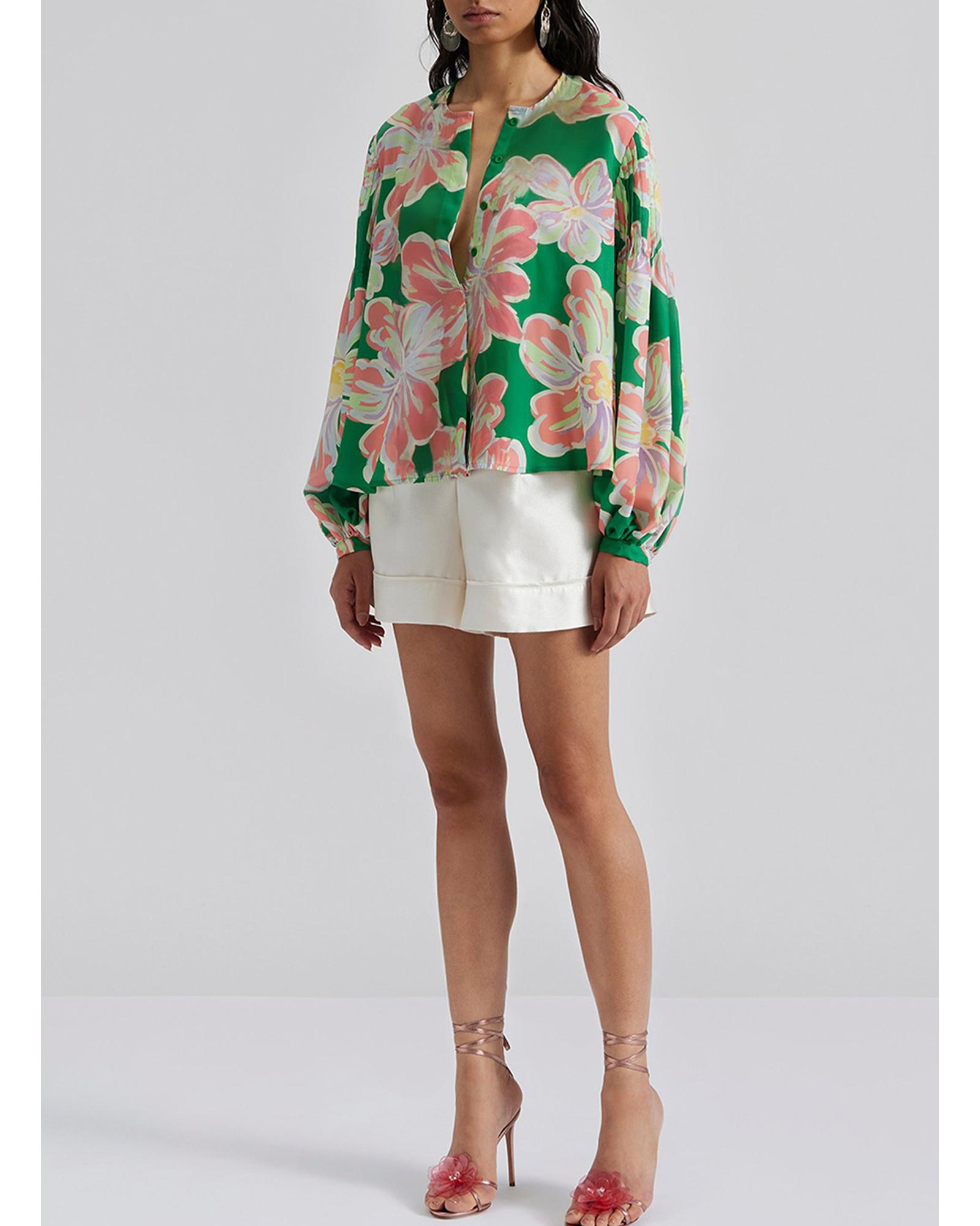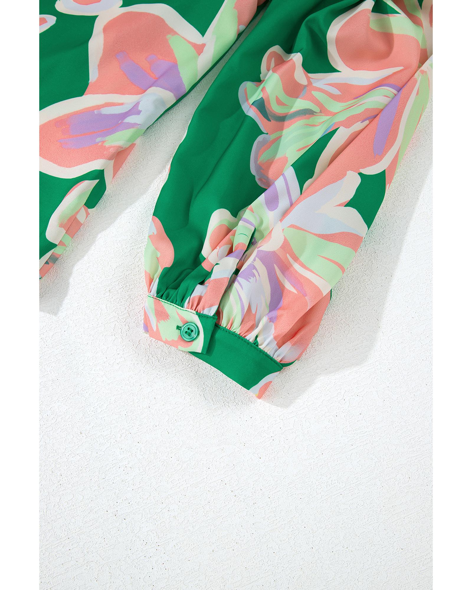 Green Floral Print Button up Pleated Puff Sleeve Loose Shirt – S