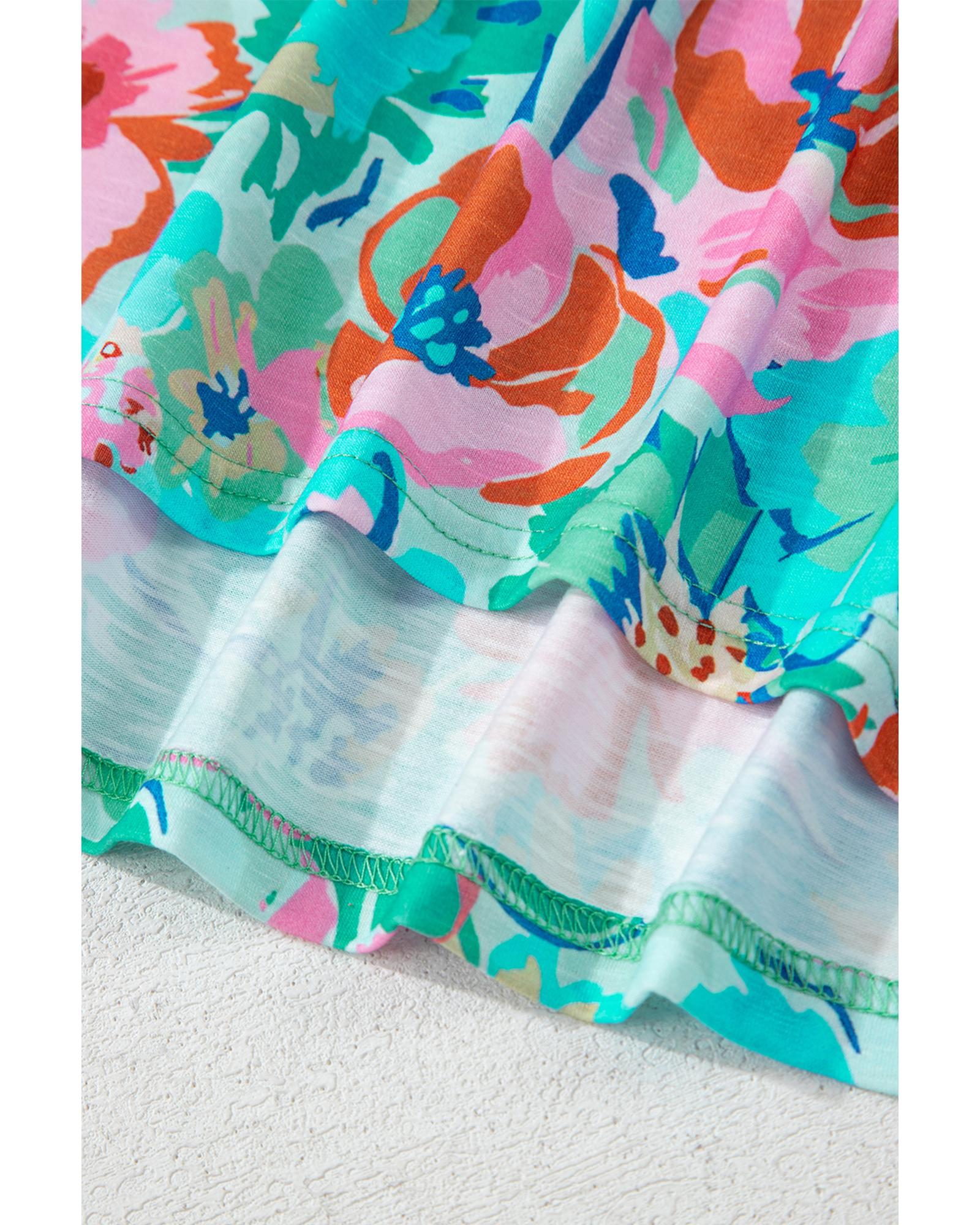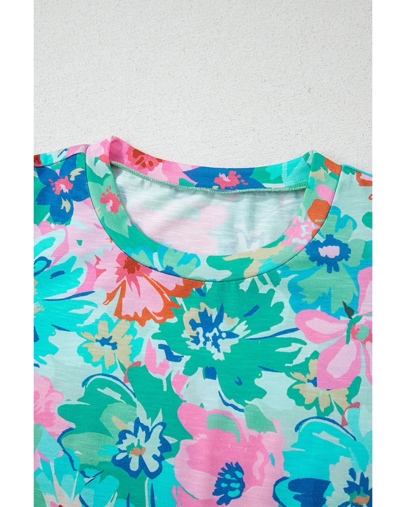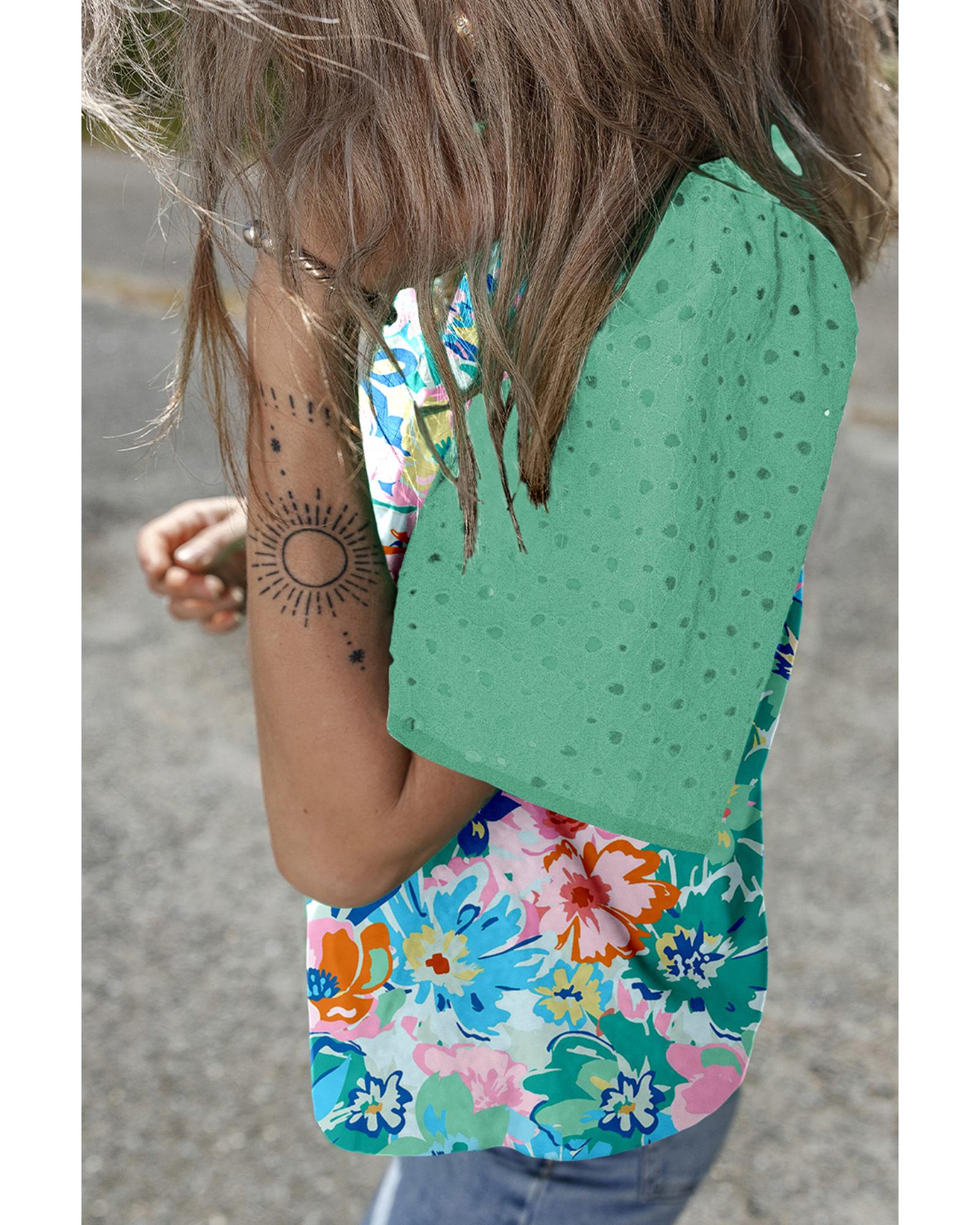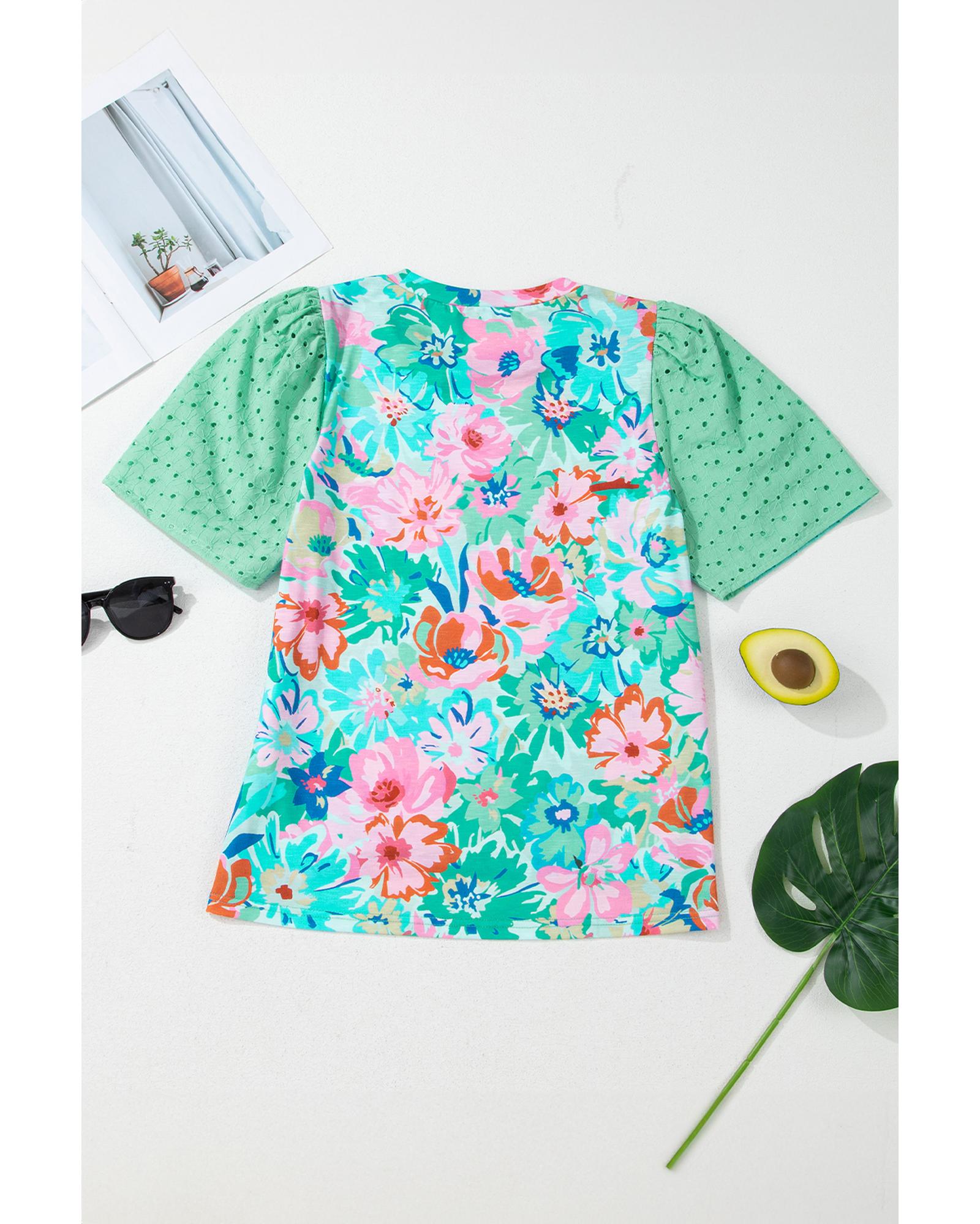 This floral print eyelet embroidered short sleeve crew neck top combines vibrant design with delicate detailing, making it a versatile addition to your wardrobe. Its classic crew neckline and feminine embroidery offer a timeless and stylish look suitable for various occasions.