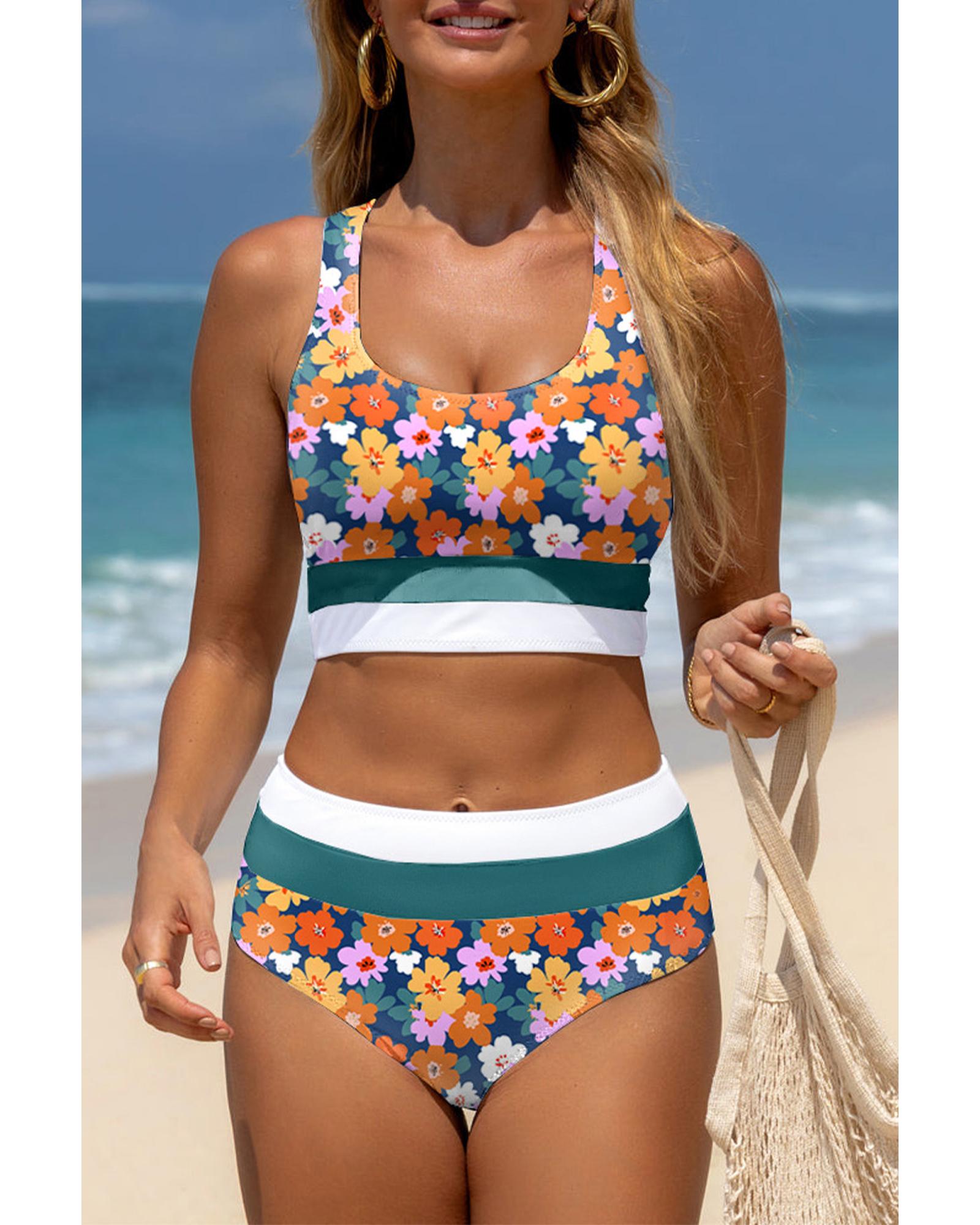 This stylish bikini set features a vibrant floral print and a modern design, perfect for a lively summer look. The set includes a racerback top with cutout details and high-waist bottoms, offering both support and a flattering fit. Crafted from a comfortable and stretchy fabric, it combines fashion with functionality for your beach or poolside activities.