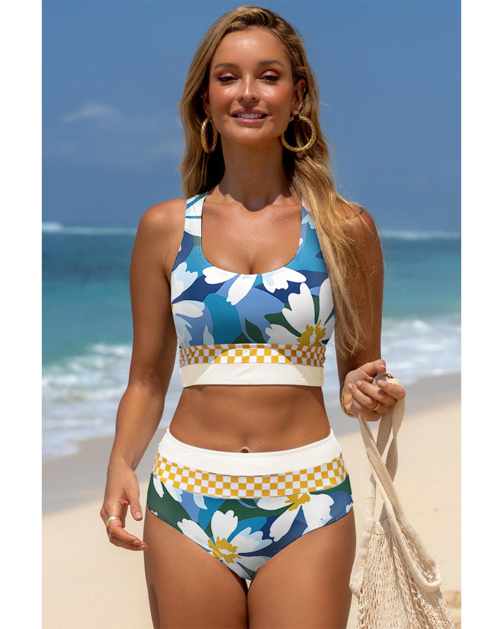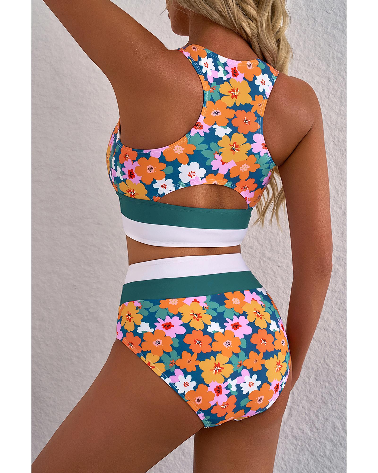 This two-piece bikini features a vibrant floral print and a high waist design, making it perfect for a stylish summer look. The racerback top provides added support and comfort, while the cutout details add a trendy and unique touch to the overall design.