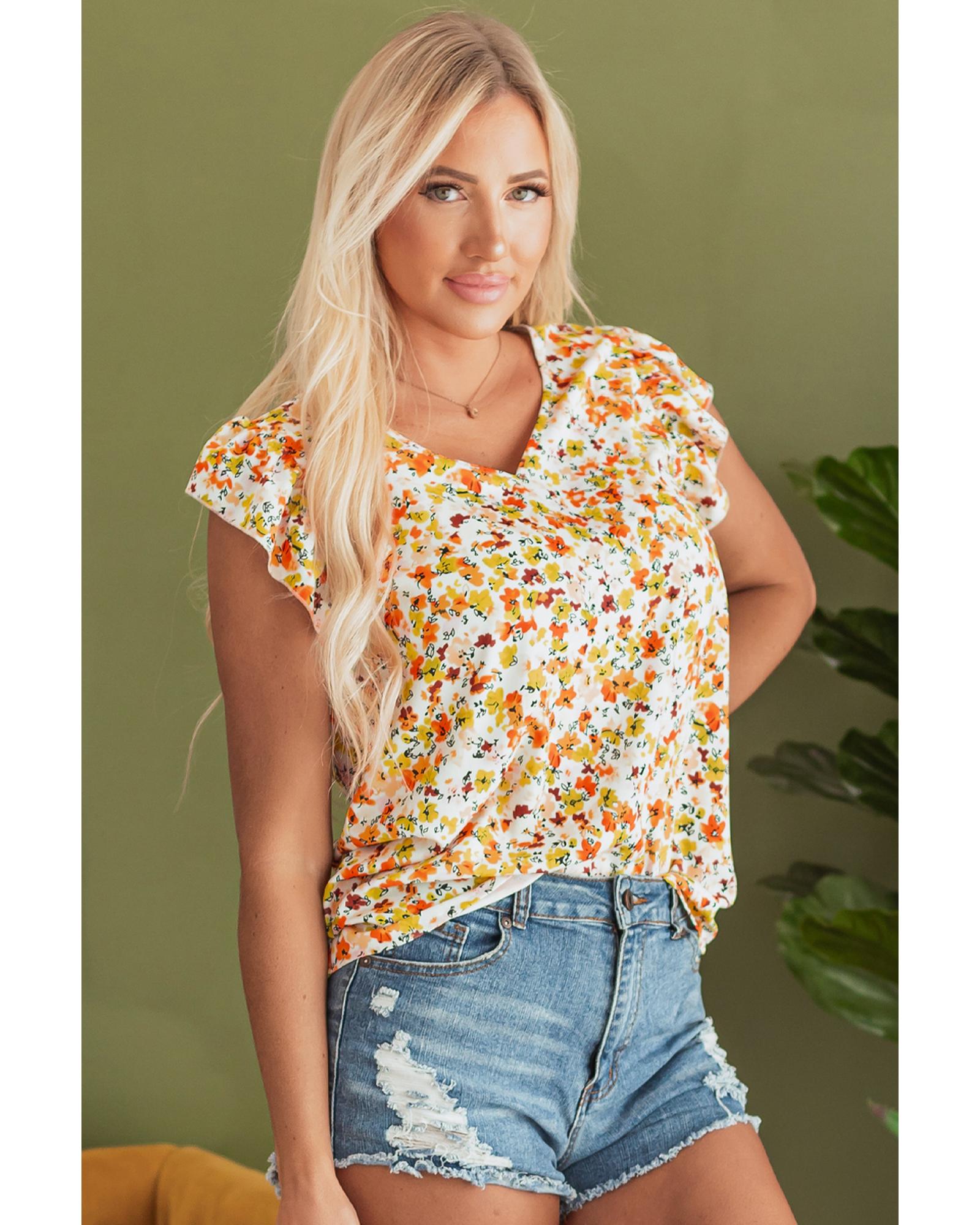 This sleeveless V-neck tank top features a vibrant green floral print and delicate ruffled details on the sleeves. Designed for comfort and style, it offers easy movement and breathability, making it suitable for casual wear or warm weather occasions.