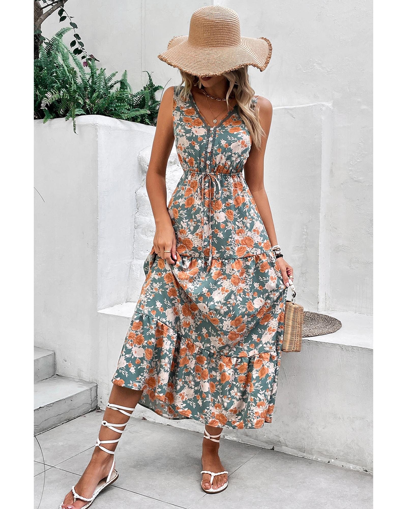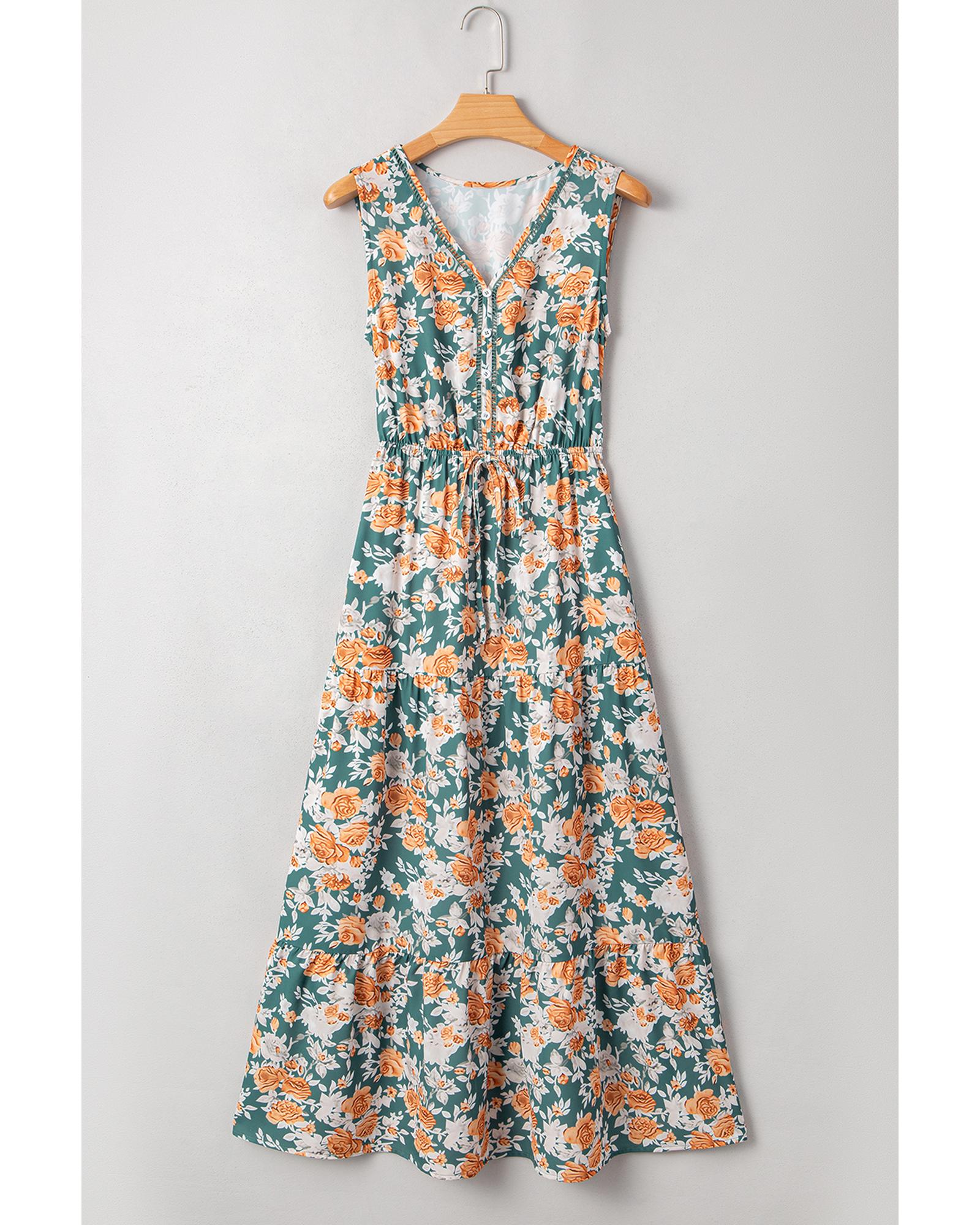 This sleeveless long dress features a vibrant green floral print and a flattering tie waist design. Its tiered, flowy silhouette and empire waist make it an ideal choice for holiday or casual occasions, offering both comfort and style.