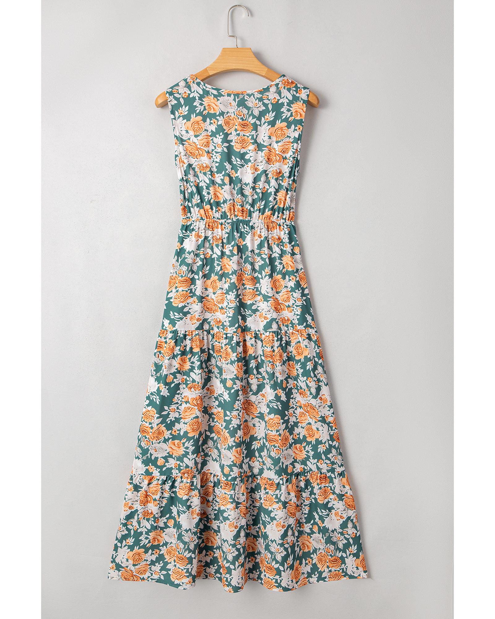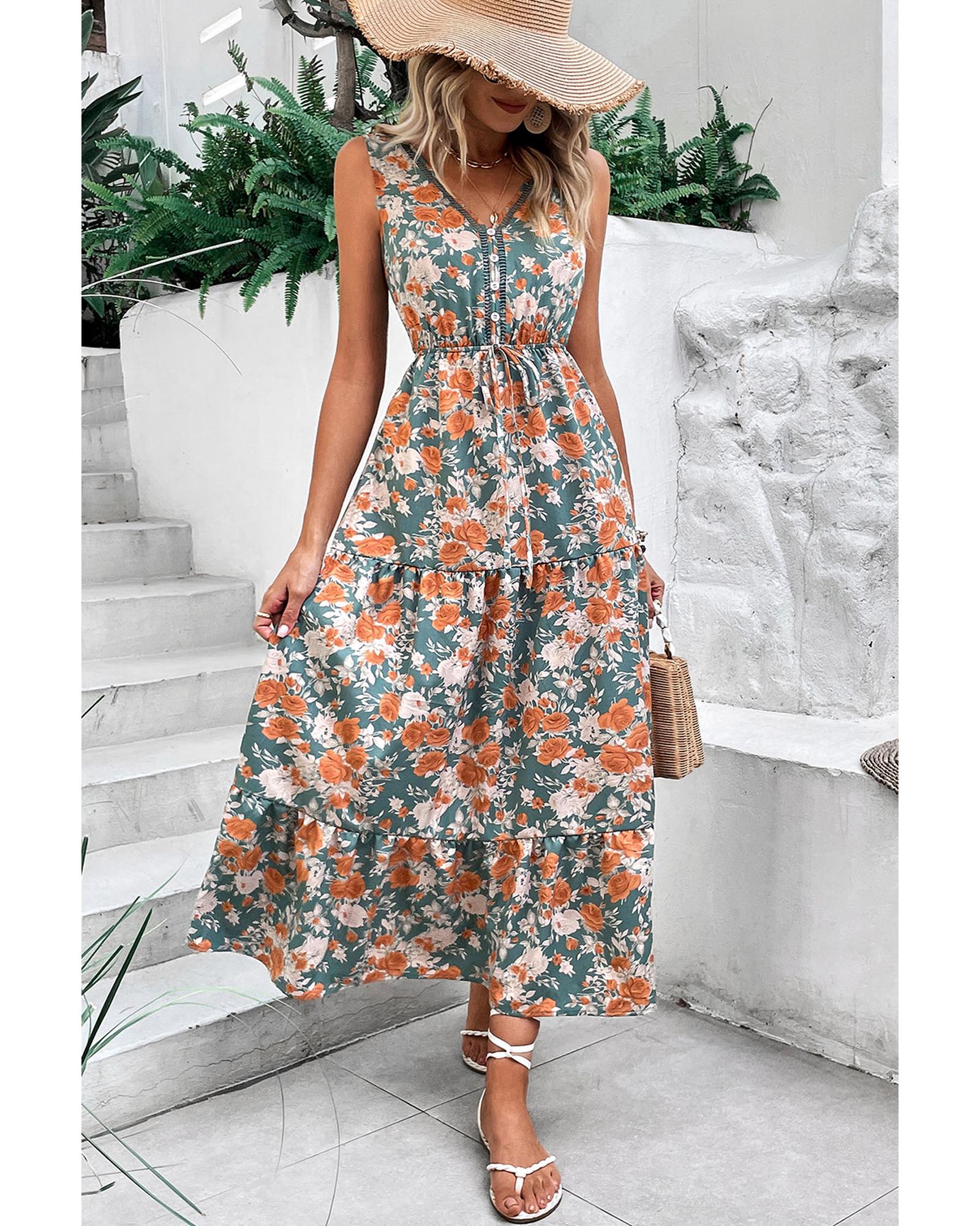 This sleeveless long dress features a vibrant green floral print and a flattering tie waist design. Its tiered, flowy silhouette and empire waist create an elegant and comfortable fit, making it ideal for holiday or special occasions.