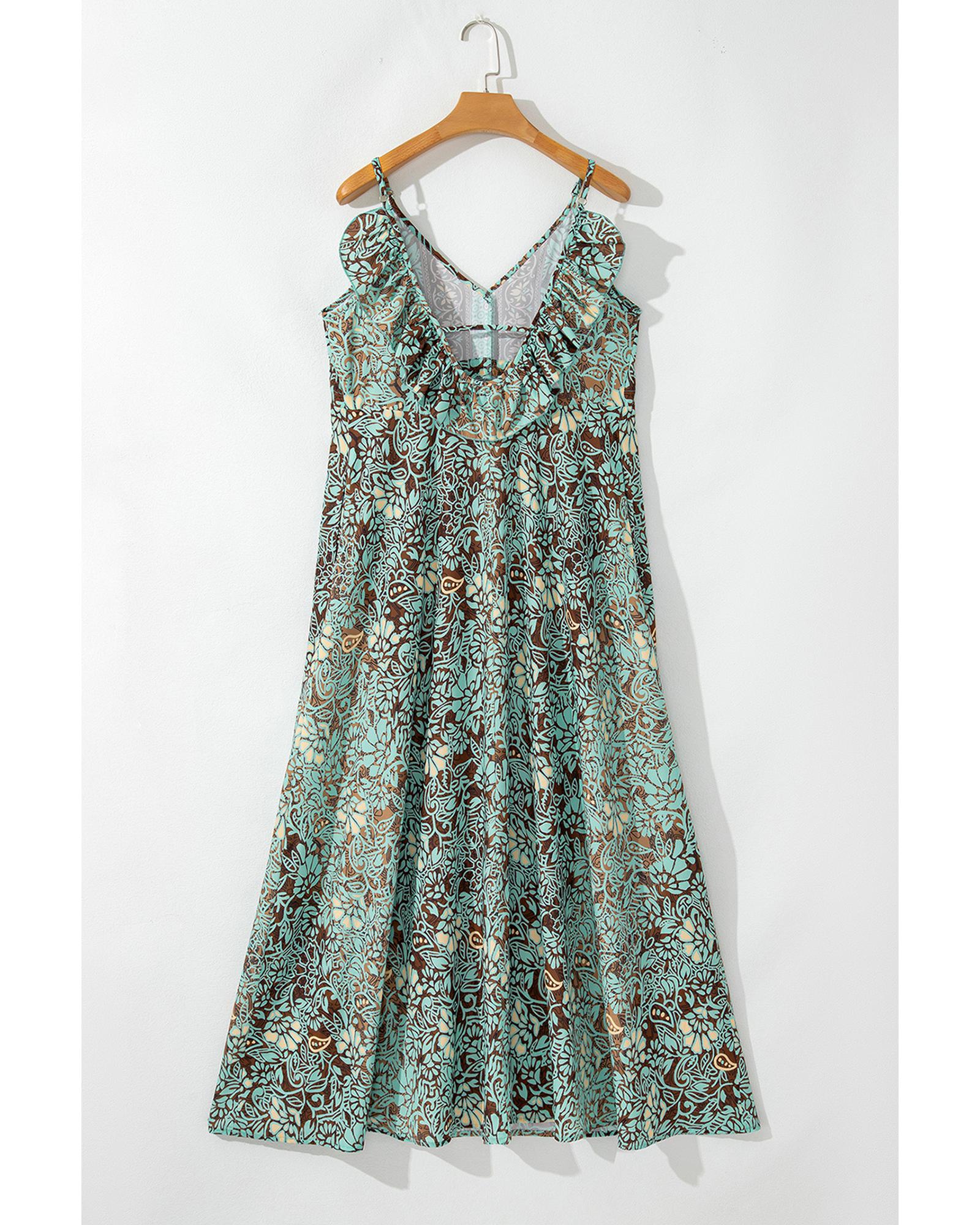 This green floral print maxi dress features a stylish V-neck design with ruffled trim details. It is designed to be backless with a tassel waist accent, offering a fashionable and comfortable fit for various occasions. The dress is available in multiple sizes to suit different body types.