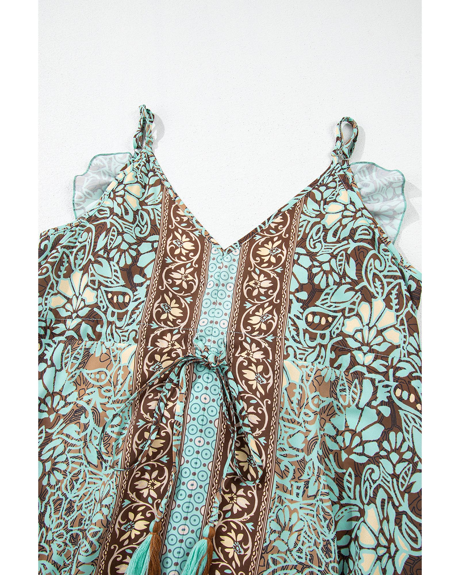 This green floral print maxi dress features a stylish V-neck design with ruffled trim details. It is designed to be backless with a tassel waist accent, offering a fashionable and comfortable fit for various occasions. The dress is available in multiple sizes to suit different preferences.