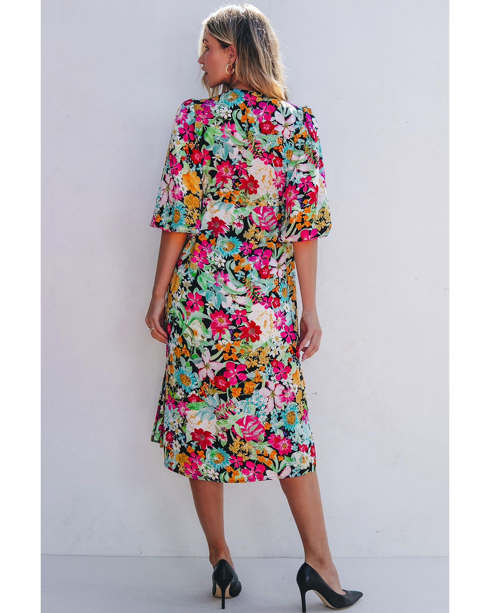 This dress features a vibrant green floral pattern with a stylish V neckline and puff sleeves, creating a playful yet elegant look. The adjustable tassel drawstring at the waist allows for a customizable fit, making it suitable for various body types. Designed for spring and summer wear, it offers a trendy and comfortable option for outdoor outings.
