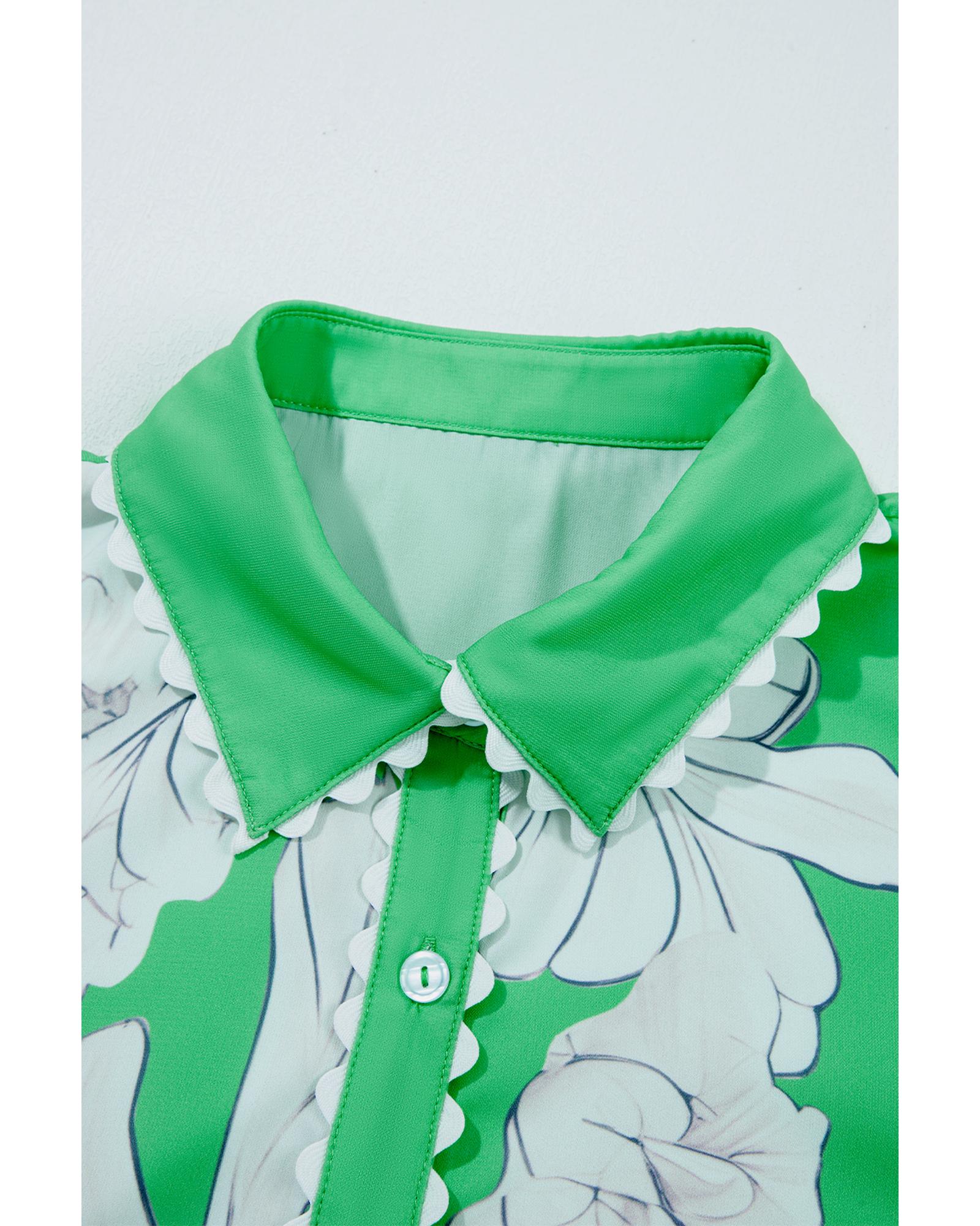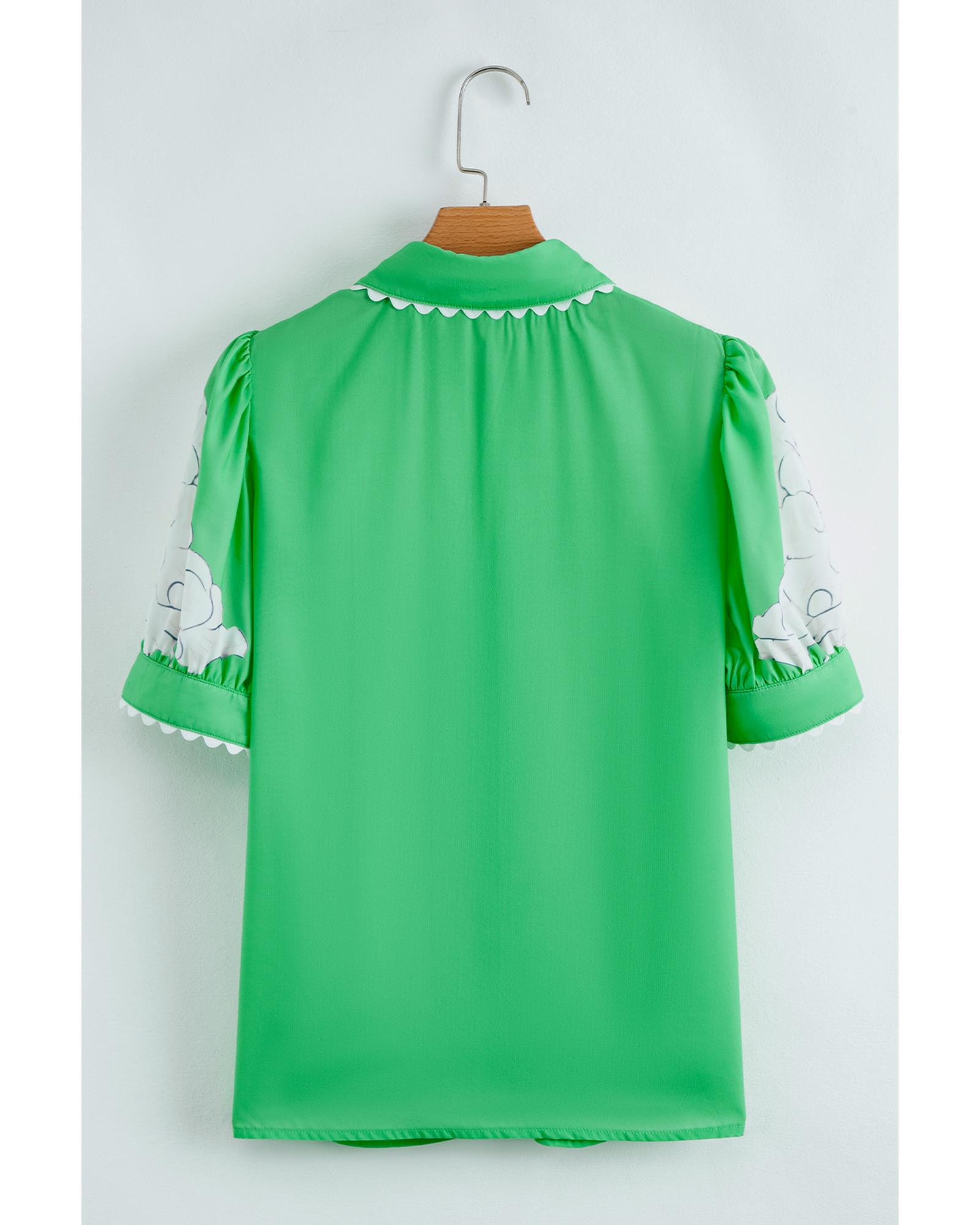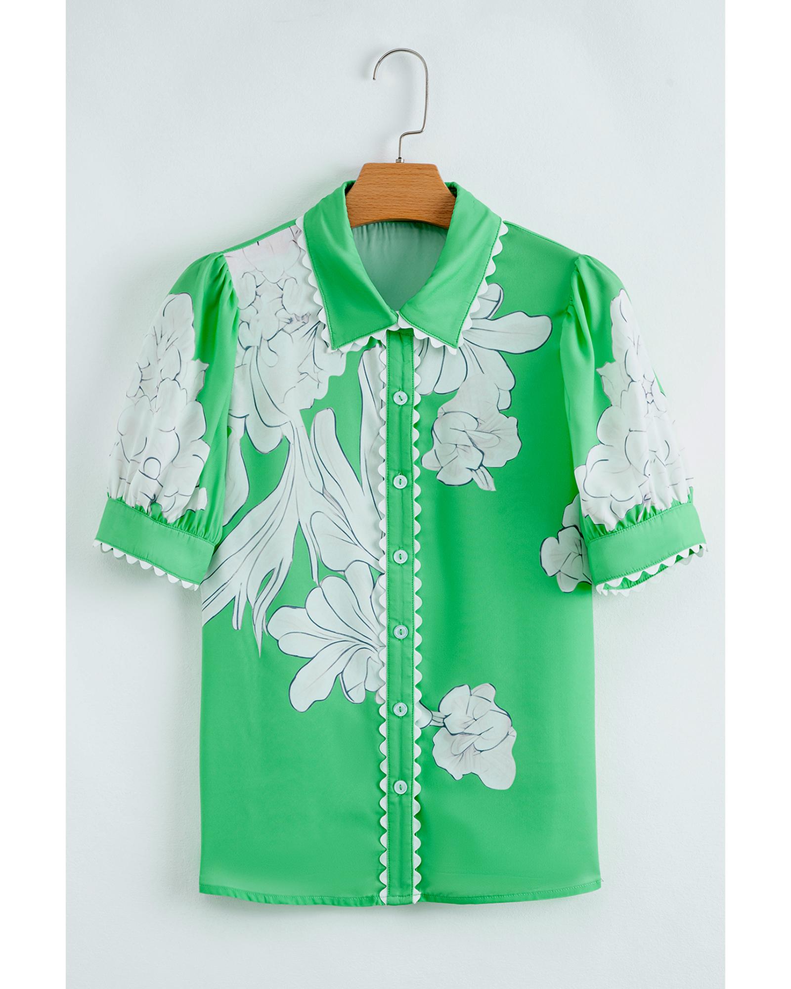 Green Floral Ric Rac Edge Puff Sleeve Button Up Summer Shirt – S