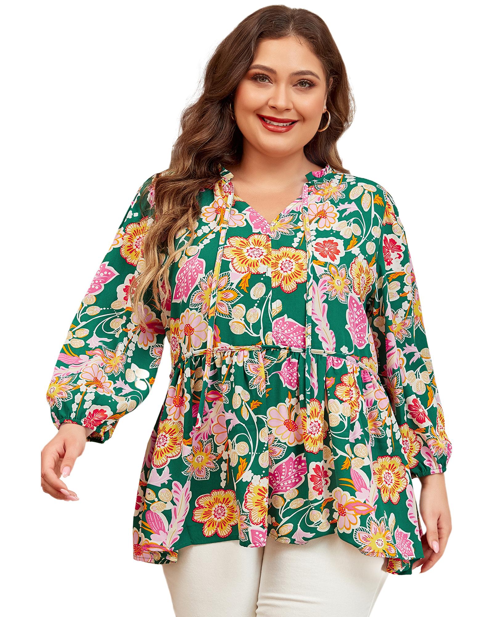 Green Floral Tied V Neck Long Sleeve Plus Size Babydoll Top – 1X