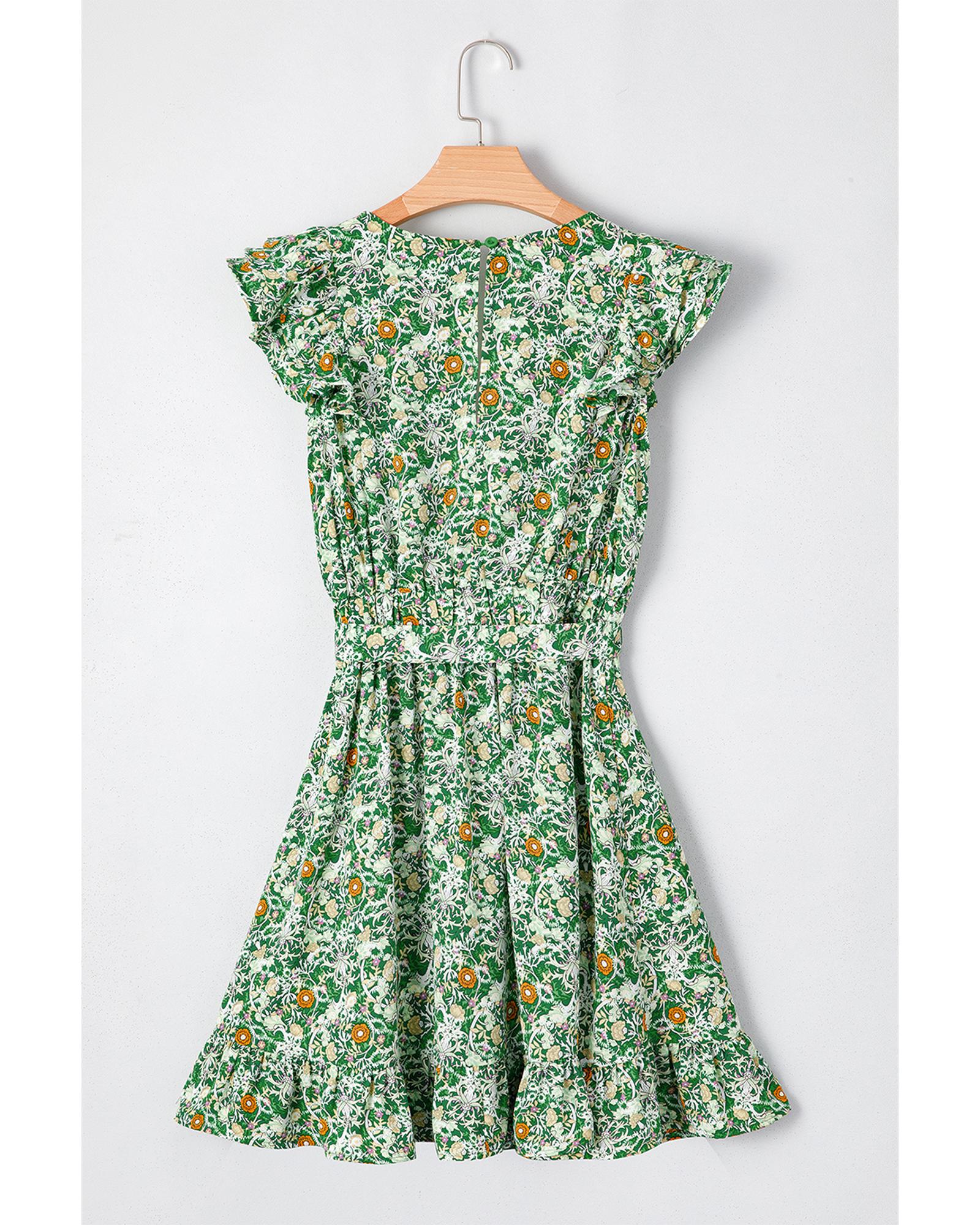 Green Flower Print Flutter Sleeve V Neck Sashed Ruffled Mini Dress – L