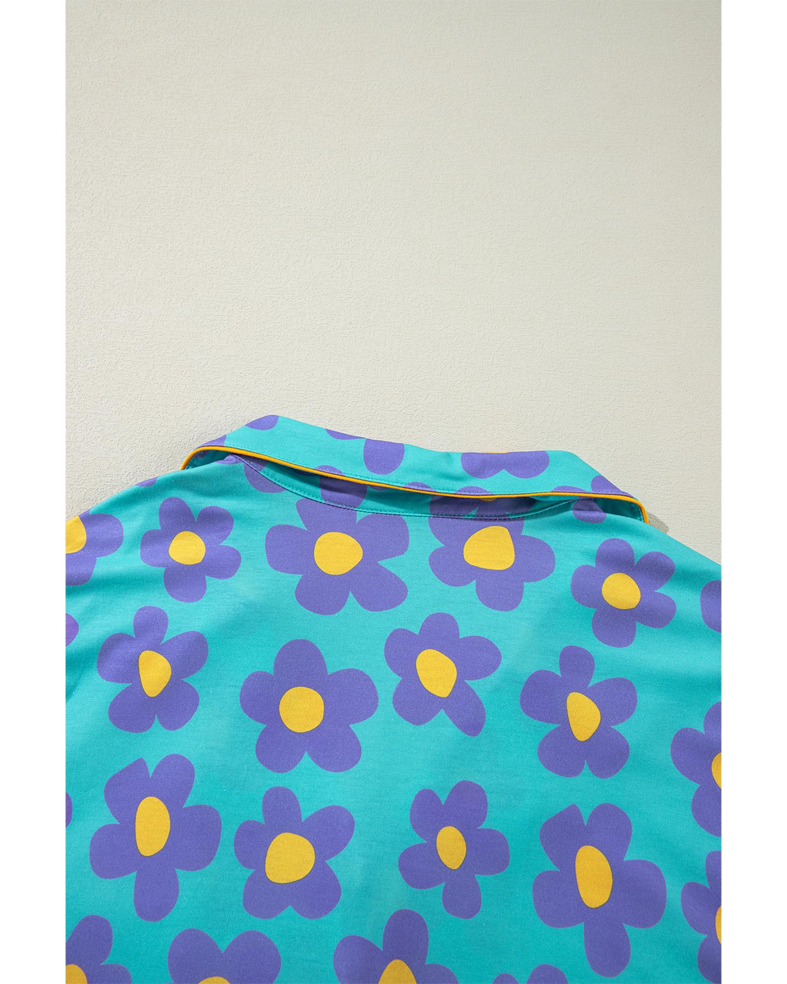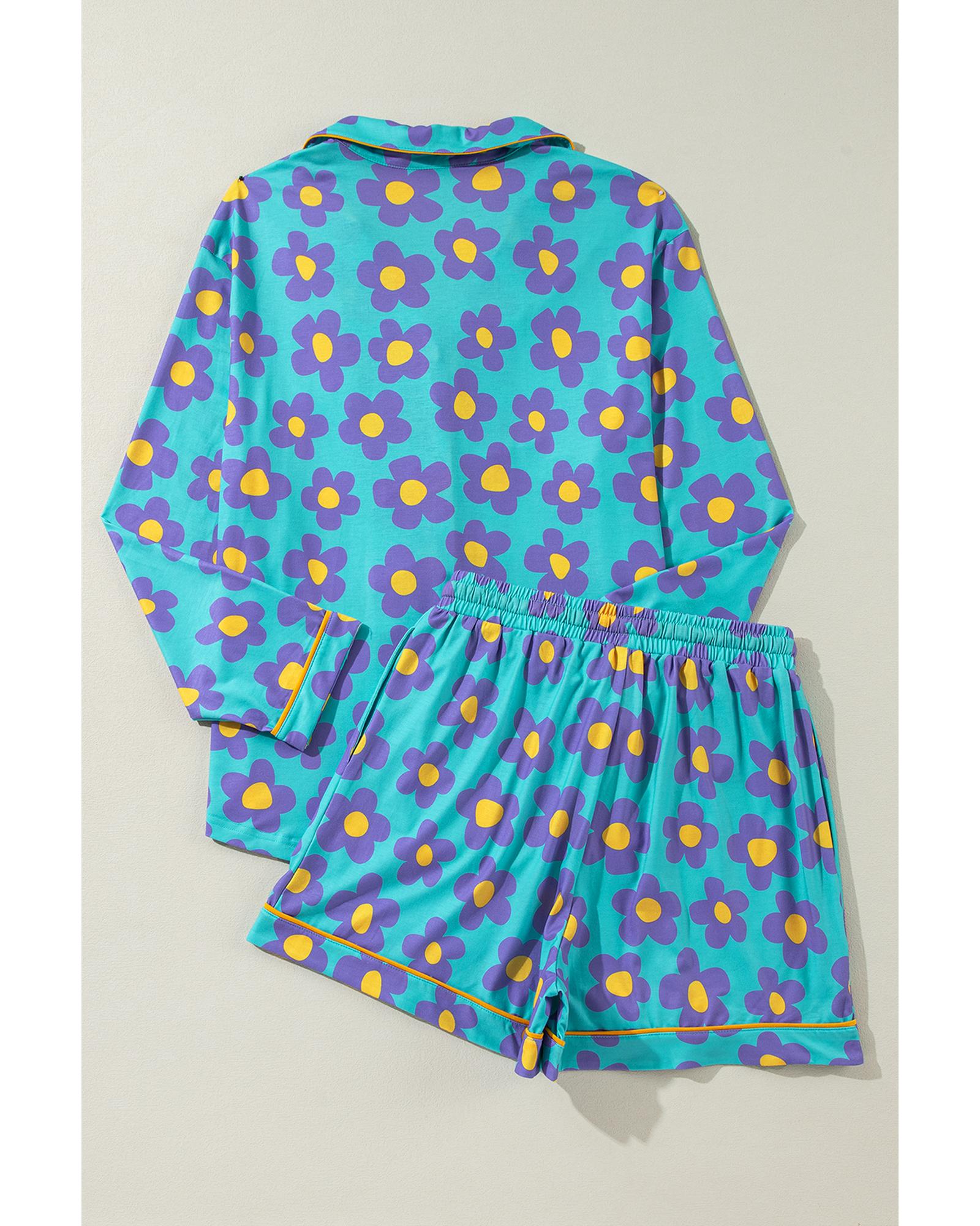 Green Flower Print Long Sleeve Shirt Shorts Pajamas Set – L