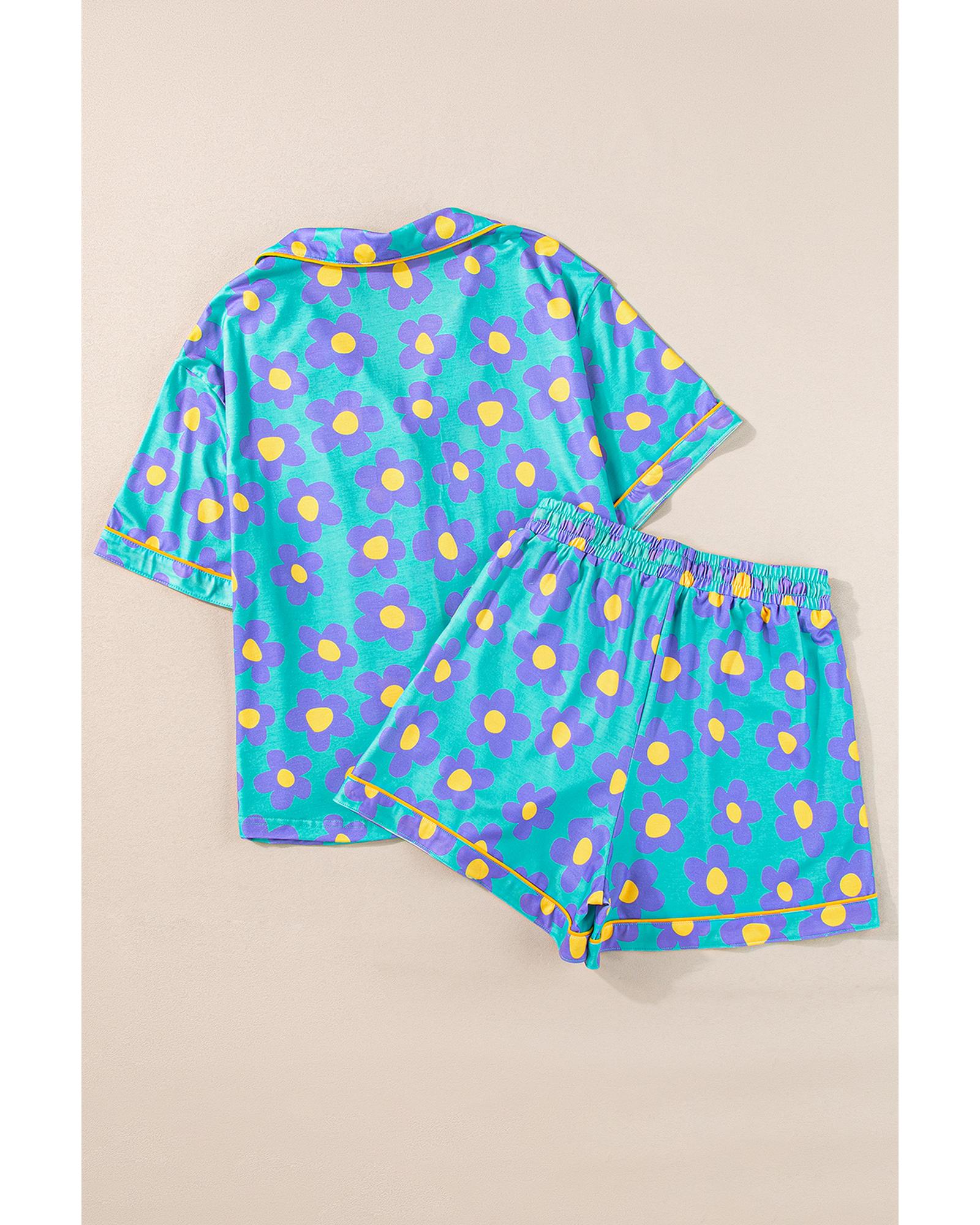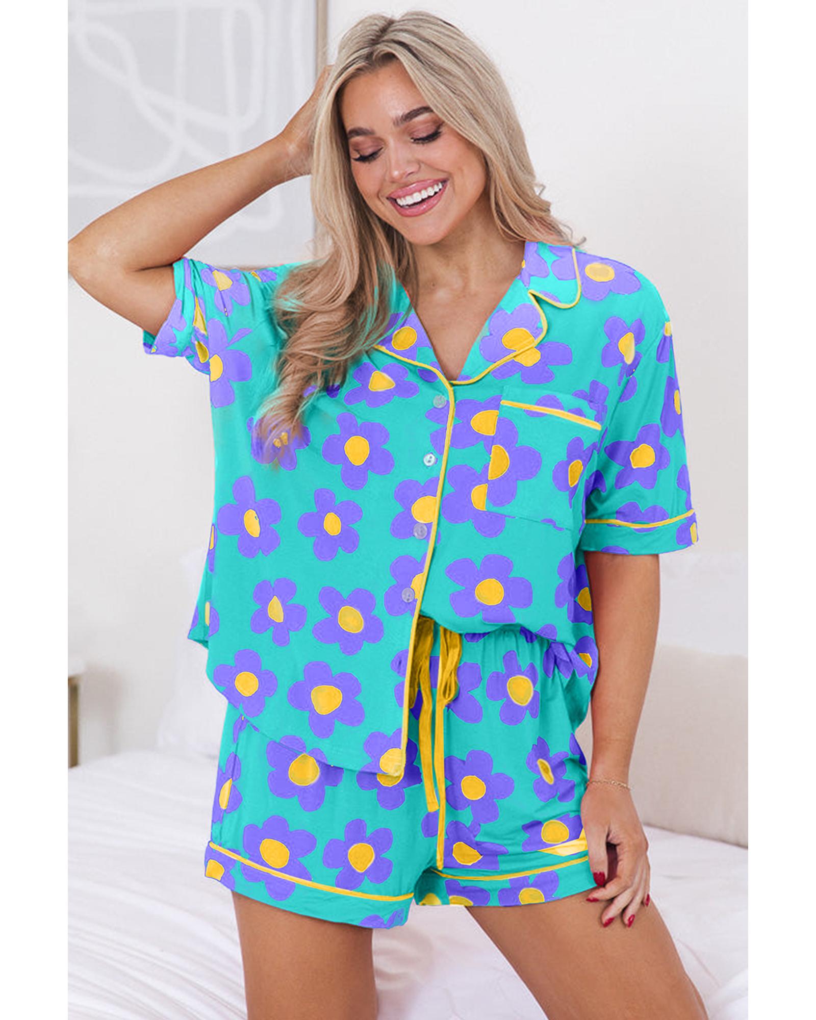 This short sleeve pajama set features a vibrant green flower print design, combining comfort and style for a relaxed sleepwear experience. Crafted from soft, breathable fabric, it offers a comfortable fit with high elasticity, making it suitable for various body types. The set includes a buttoned shirt with a V-neckline and a pair of drawstring shorts, providing convenience and flexibility for everyday wear.