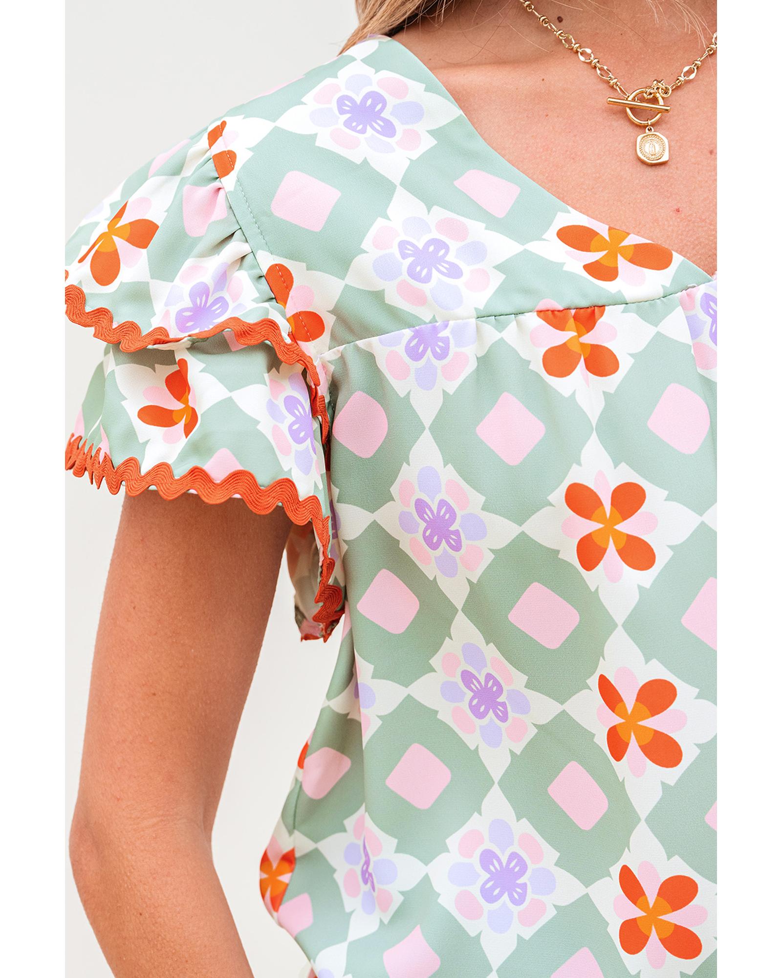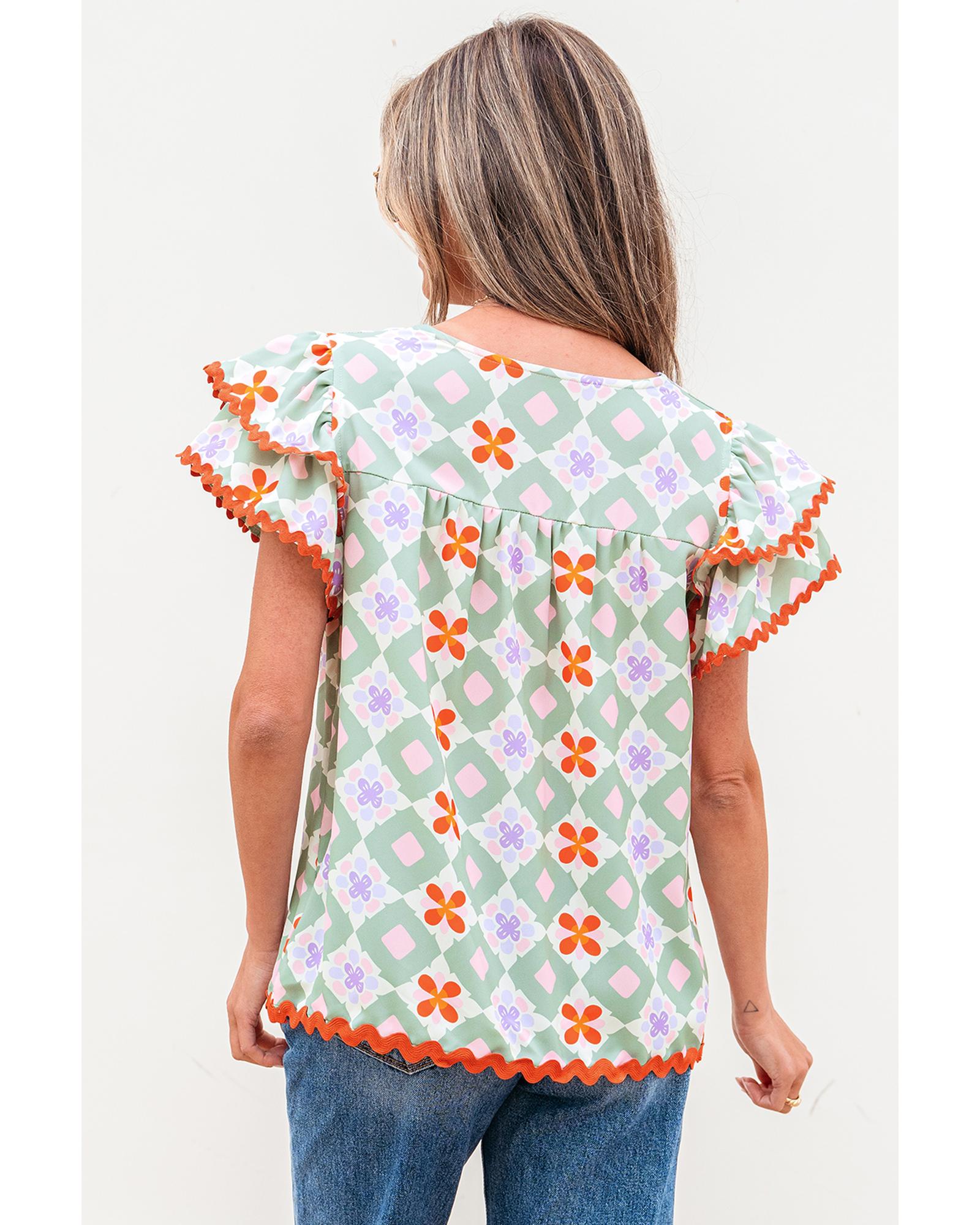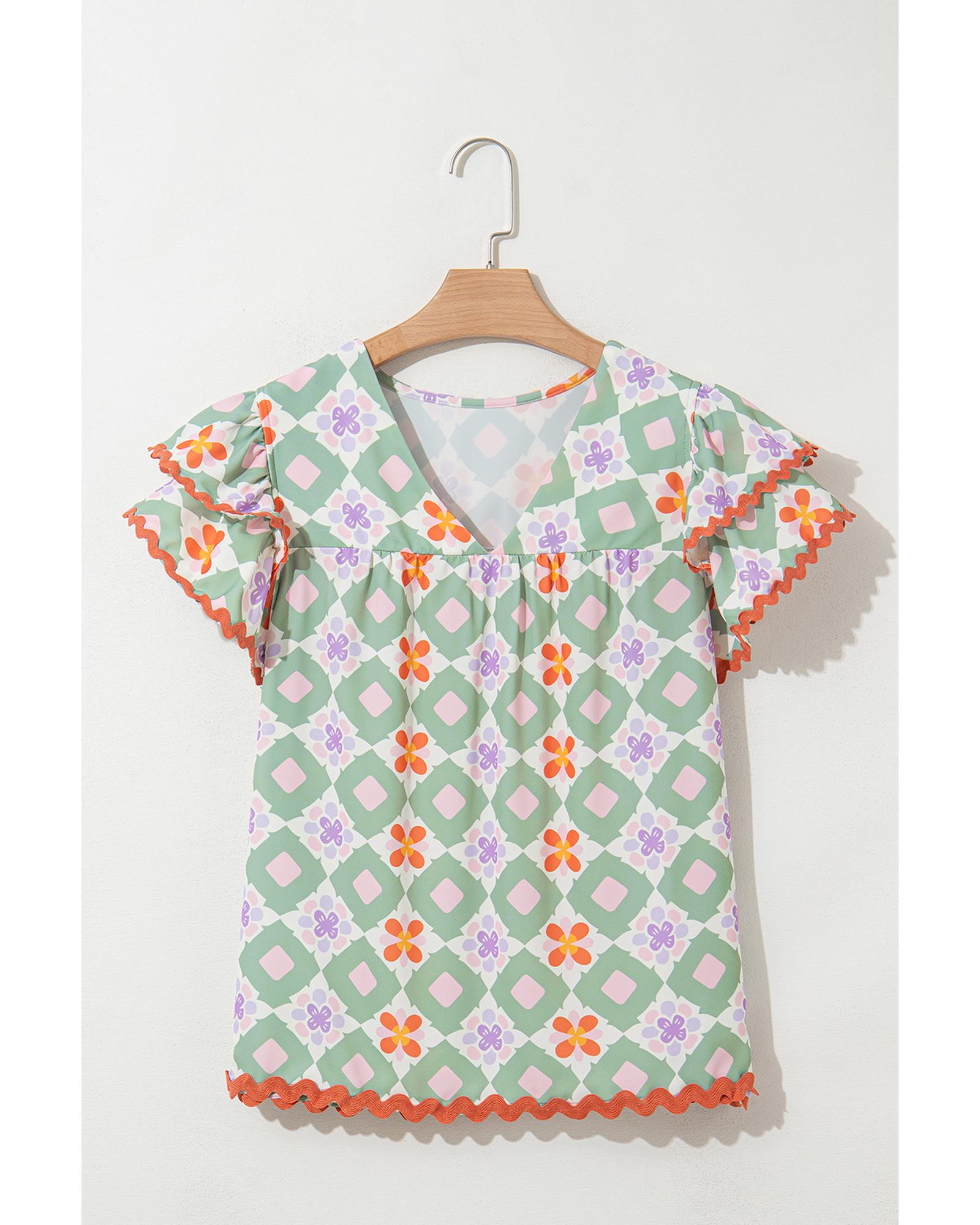 This blouse features a distinctive green geometric floral print combined with layered flutter sleeves, creating a feminine and stylish look. The V neck design highlights the collarbones, while the ric rac trim detail adds a delicate finishing touch. Made from lightweight polyester, it offers comfort and elegance for various occasions.