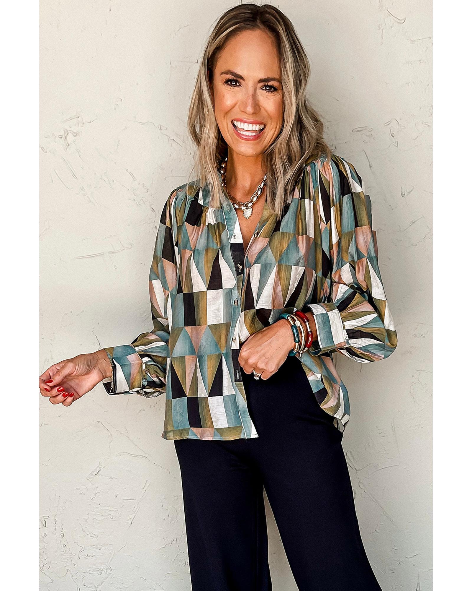 Green Geometric Print Buttoned Balloon Sleeve Loose Fit Shirt – XL