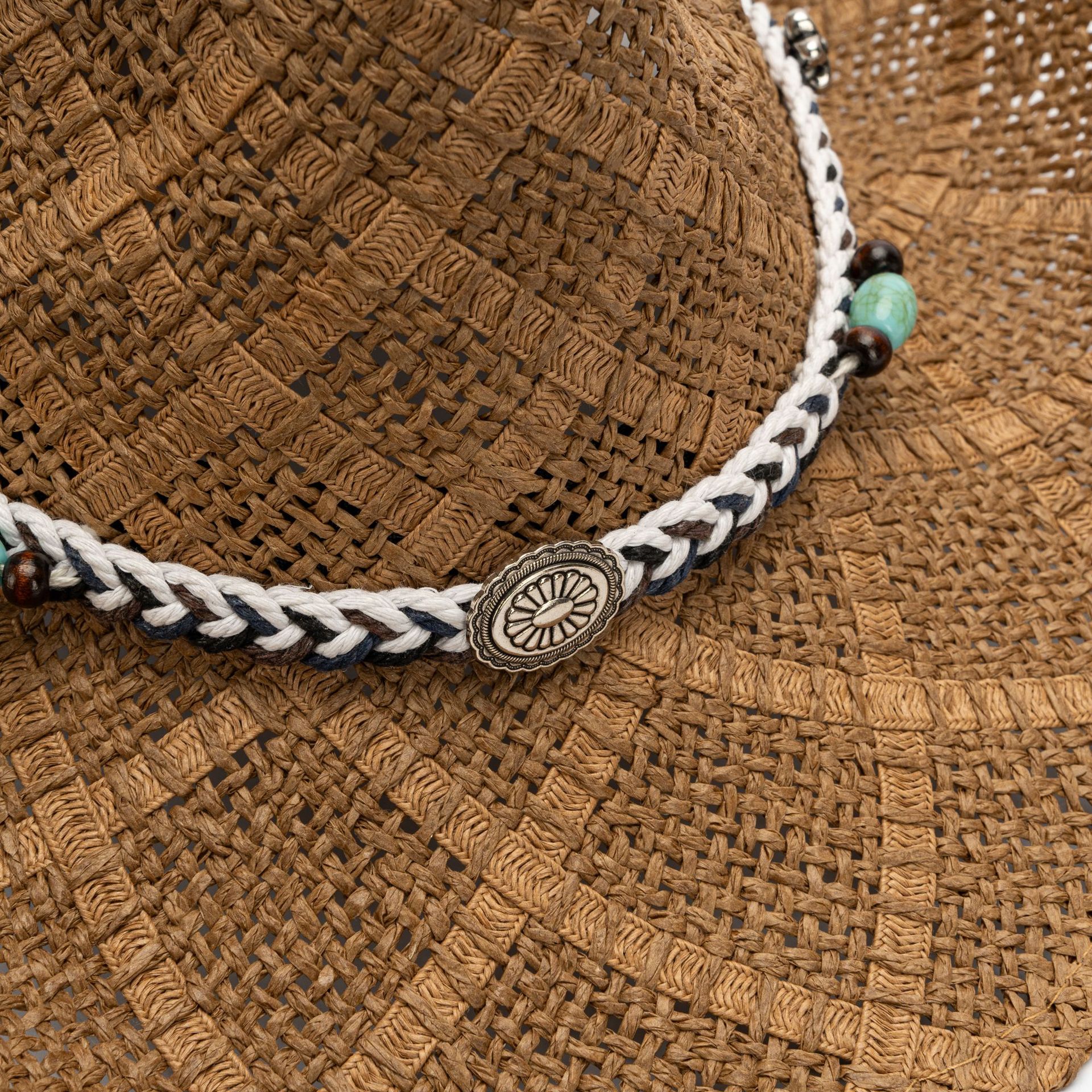 This handmade straw cowboy hat is designed to keep you cool and protected from the sun while adding a stylish Western touch to your outfit. Crafted from natural straw, it features a decorative leatherette band with studs and a wide brim for excellent sun protection. Ideal for summer outdoor activities, this hat combines comfort and functionality.