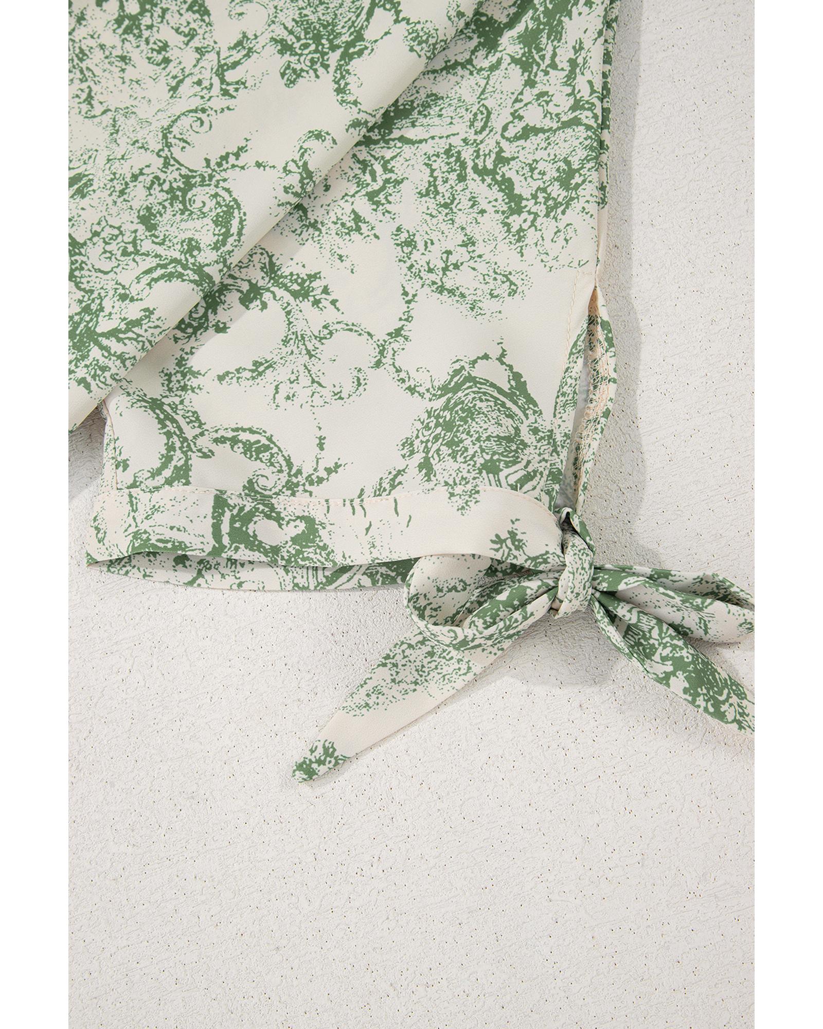 This green landscape print tied 3/4 sleeve shirt features a stylish design with a comfortable fit. The shirt is accented with a sash to enhance the silhouette, making it a versatile addition to your wardrobe. The vibrant landscape print adds a touch of nature-inspired elegance.