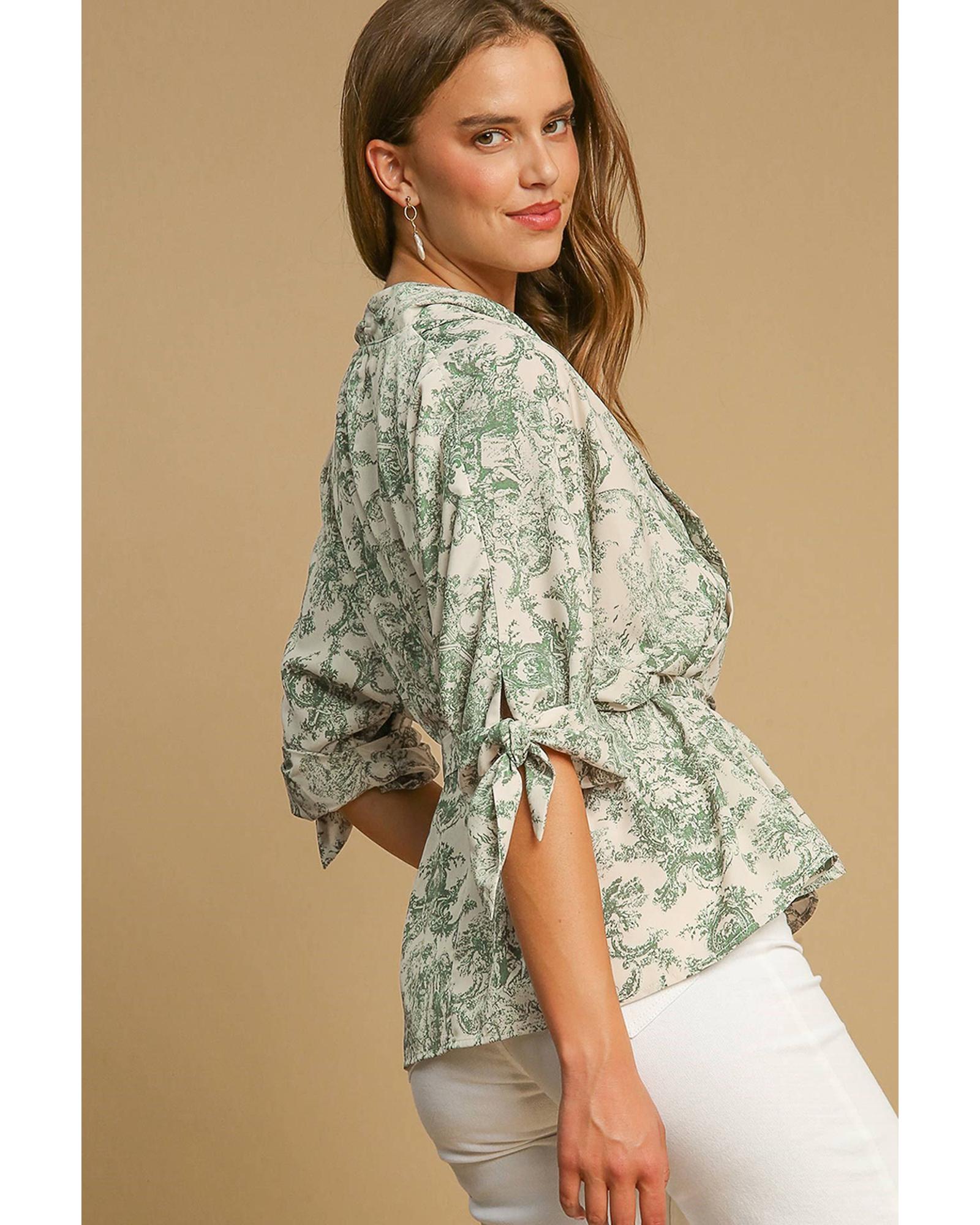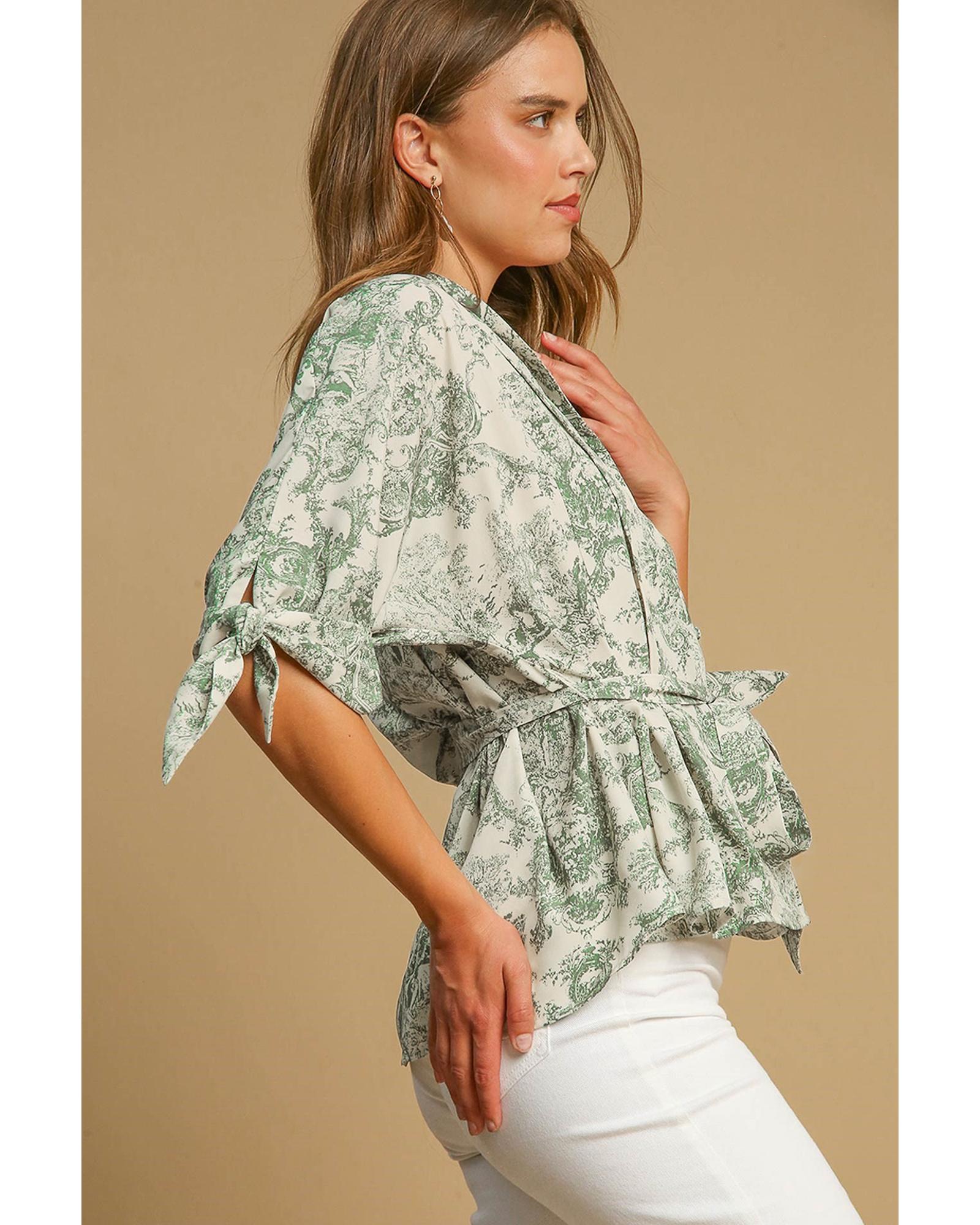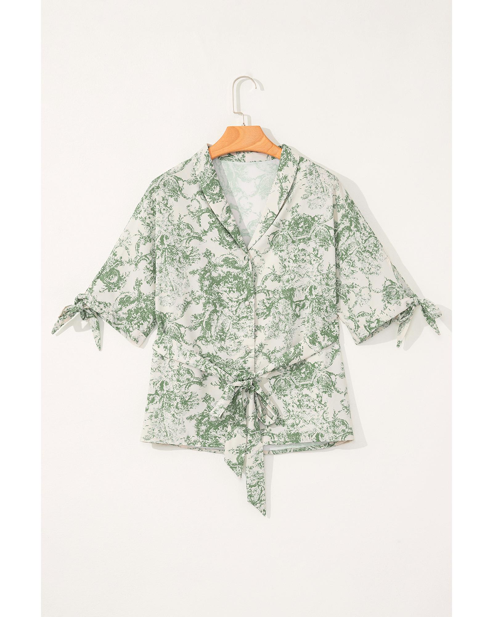 Green Landscape Print Tied 3/4 Sleeve Shirt with Sash – M