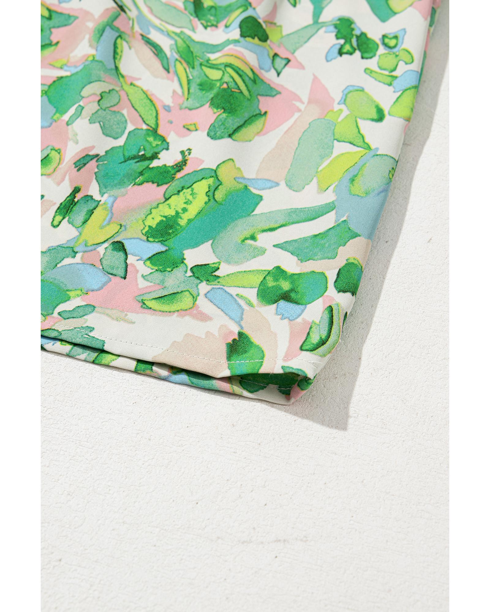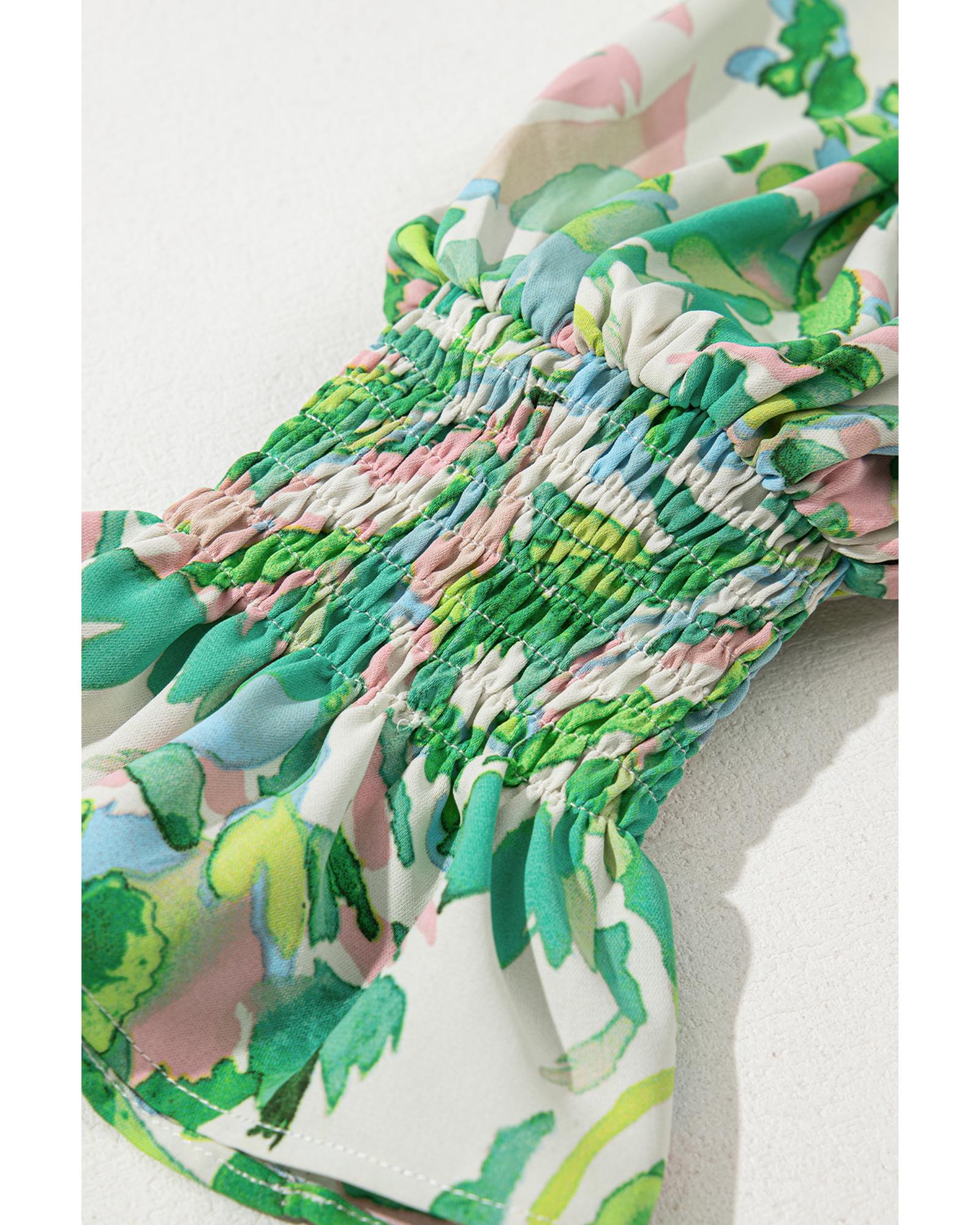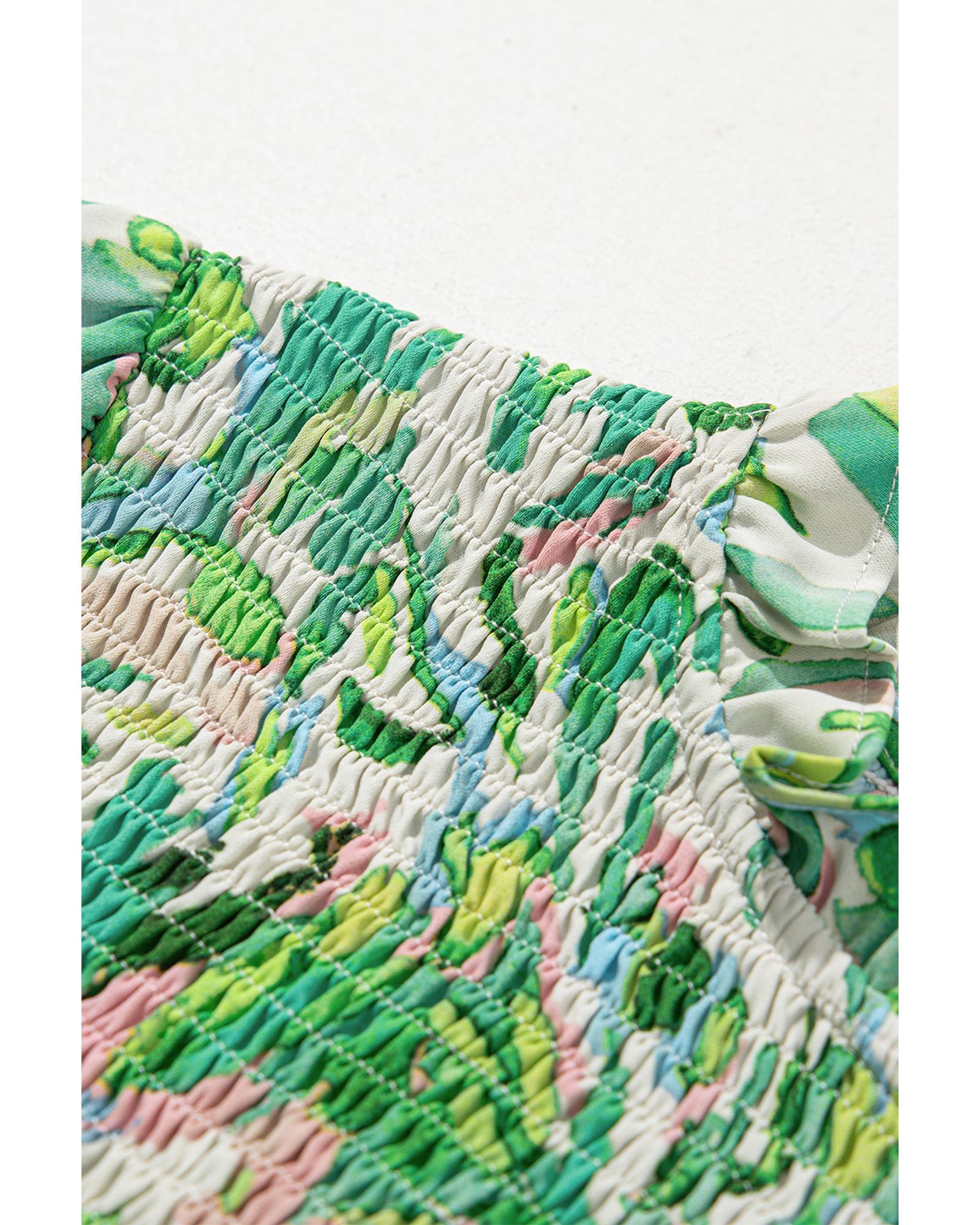Green Leafy Printed Flounce Sleeve Shirred Mock Neck Blouse – S