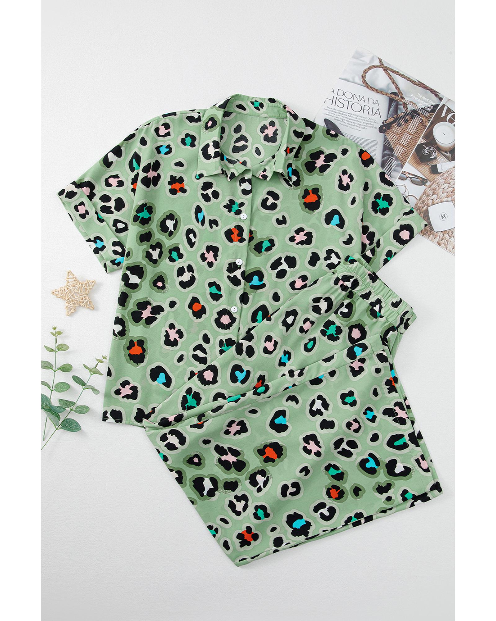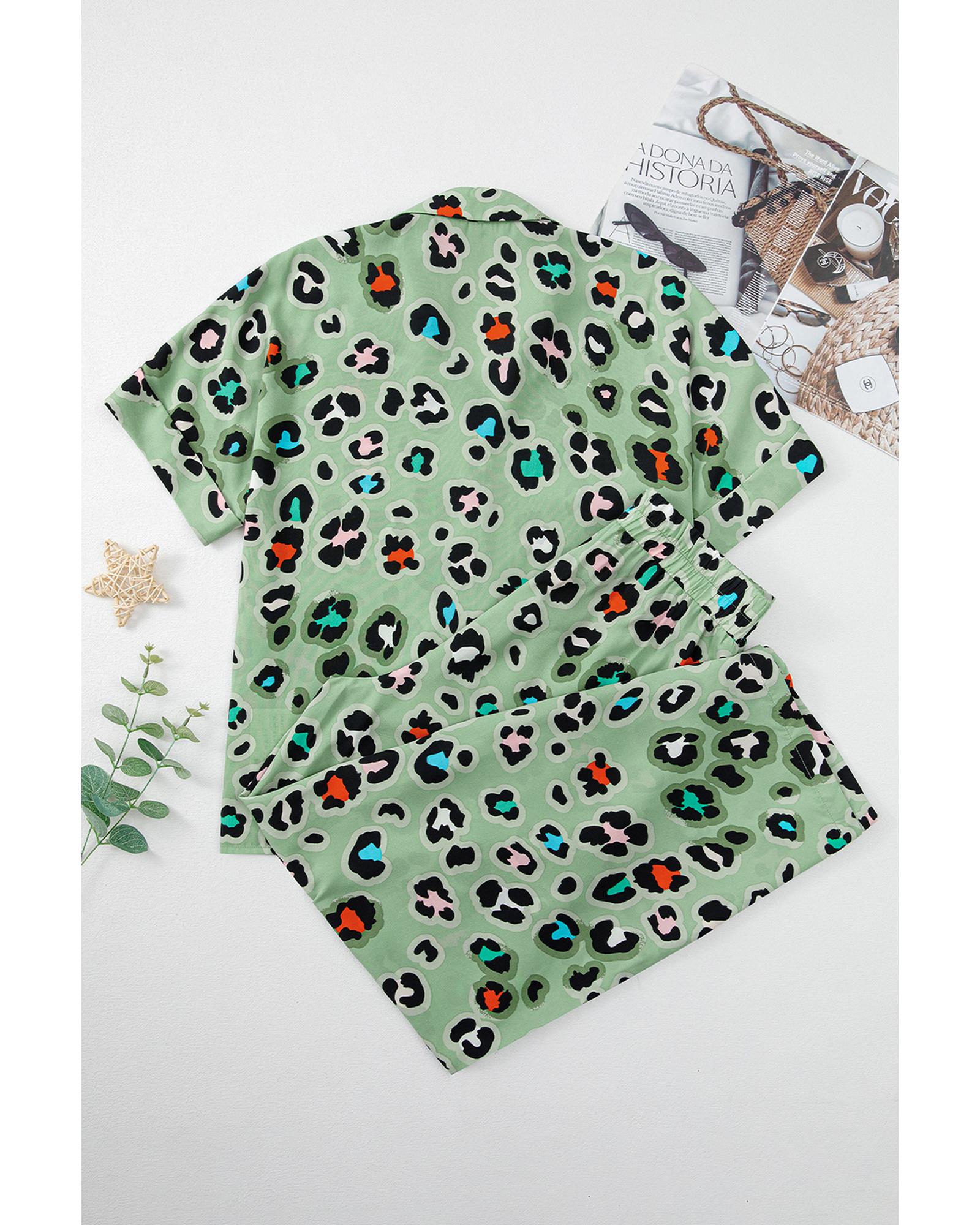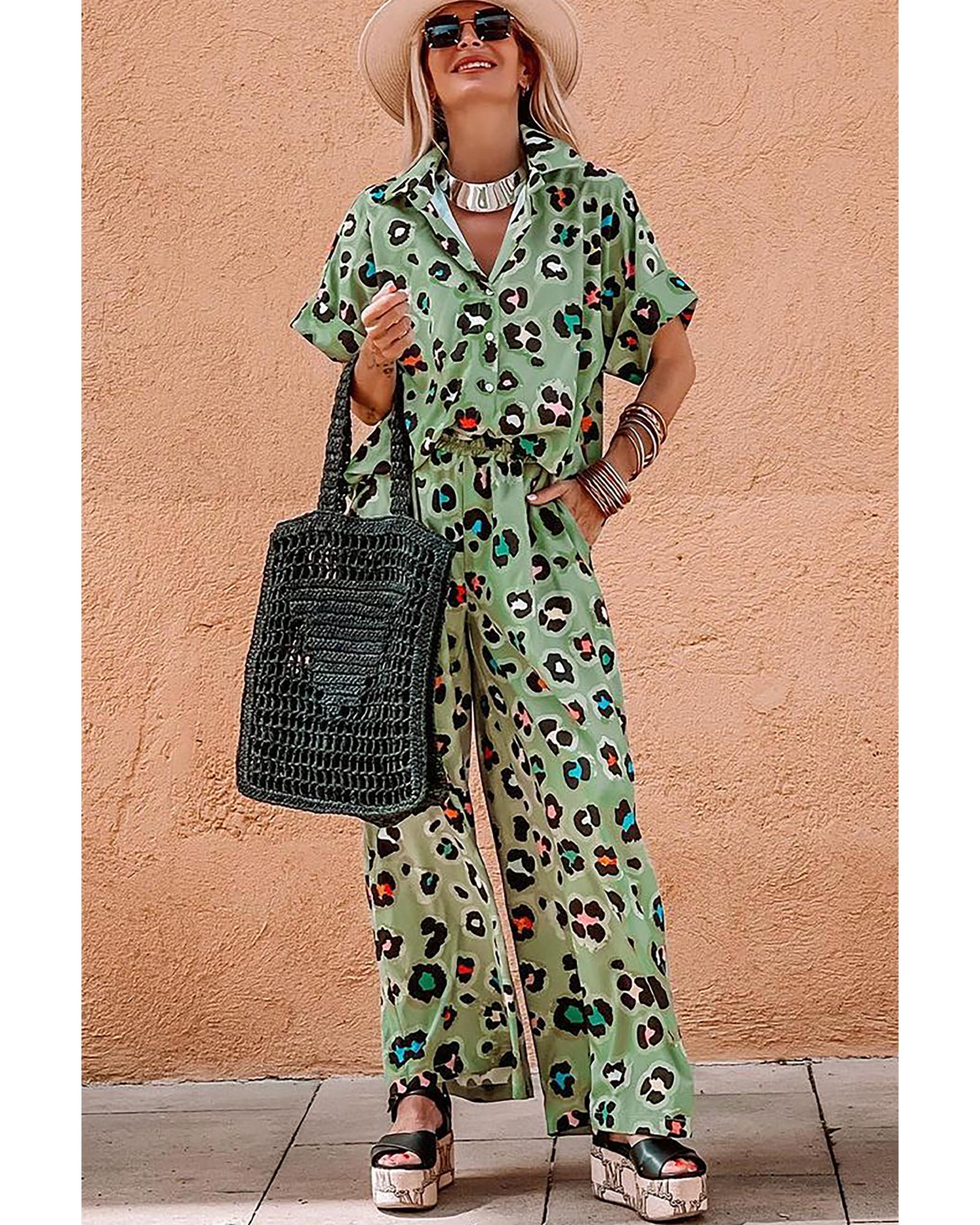 This stylish two-piece set features a green leopard print design, combining a short sleeve shirt with wide leg pants. It offers a trendy and bold look suitable for various occasions, providing both comfort and fashion-forward style.