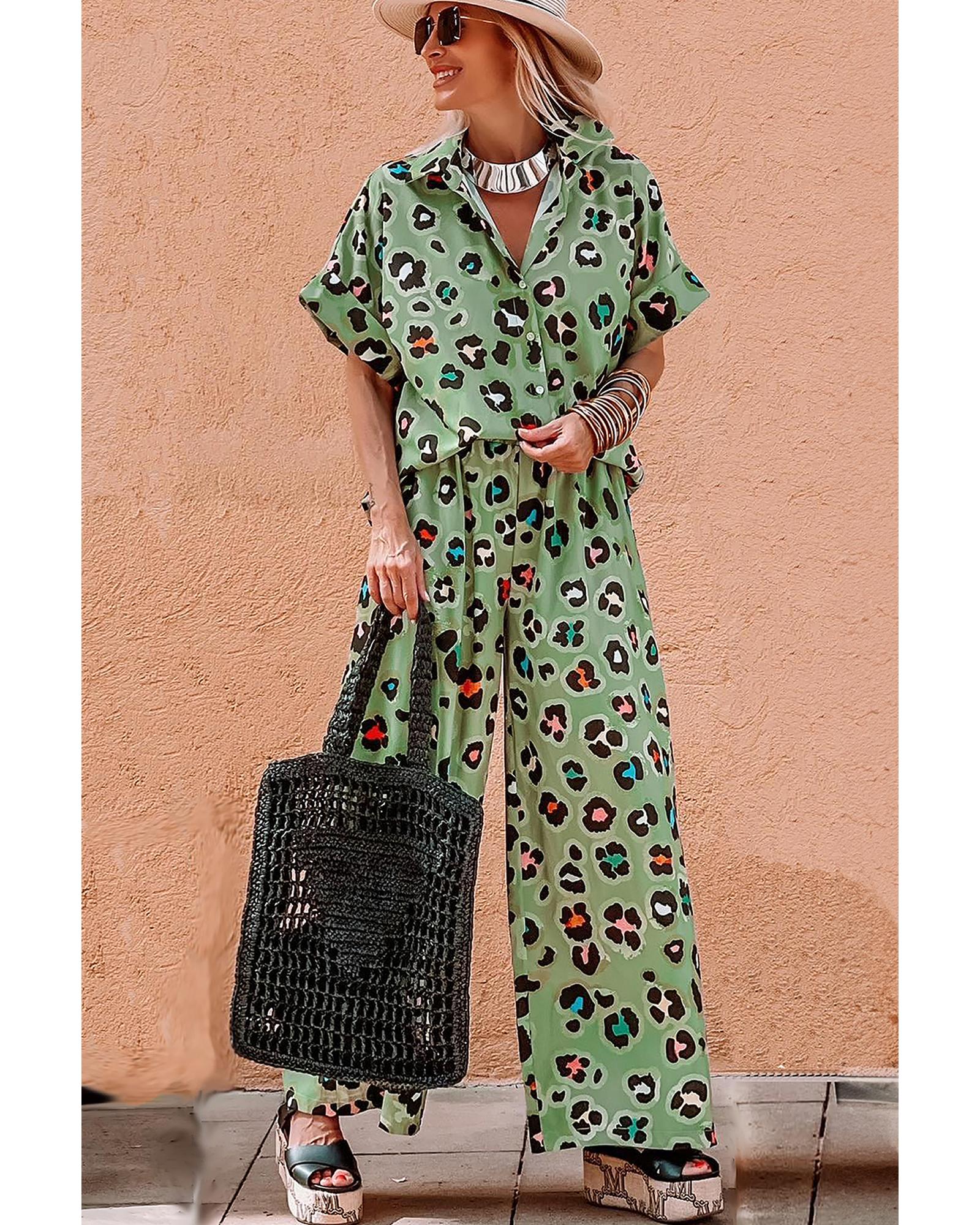 Green Leopard Print Short Sleeve Shirt and Wide Leg Pants Set – XL