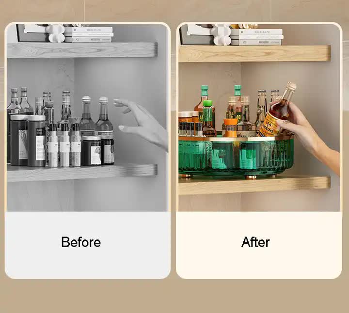 Keep your kitchen or living room organized with a transparent, rotating storage rack. Its sleek design allows for easy access to spices, condiments, or small household items, making it a practical and stylish addition to any space.