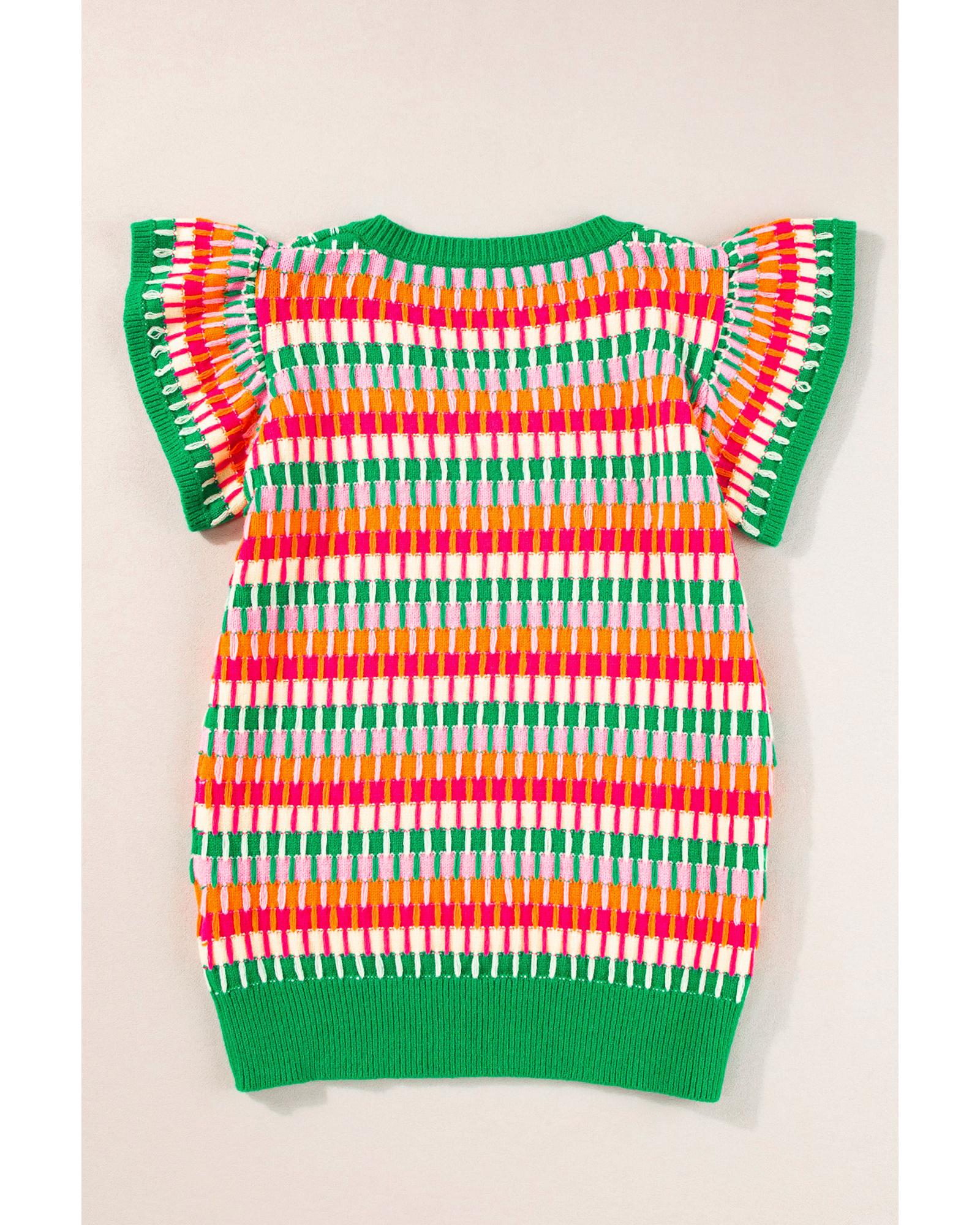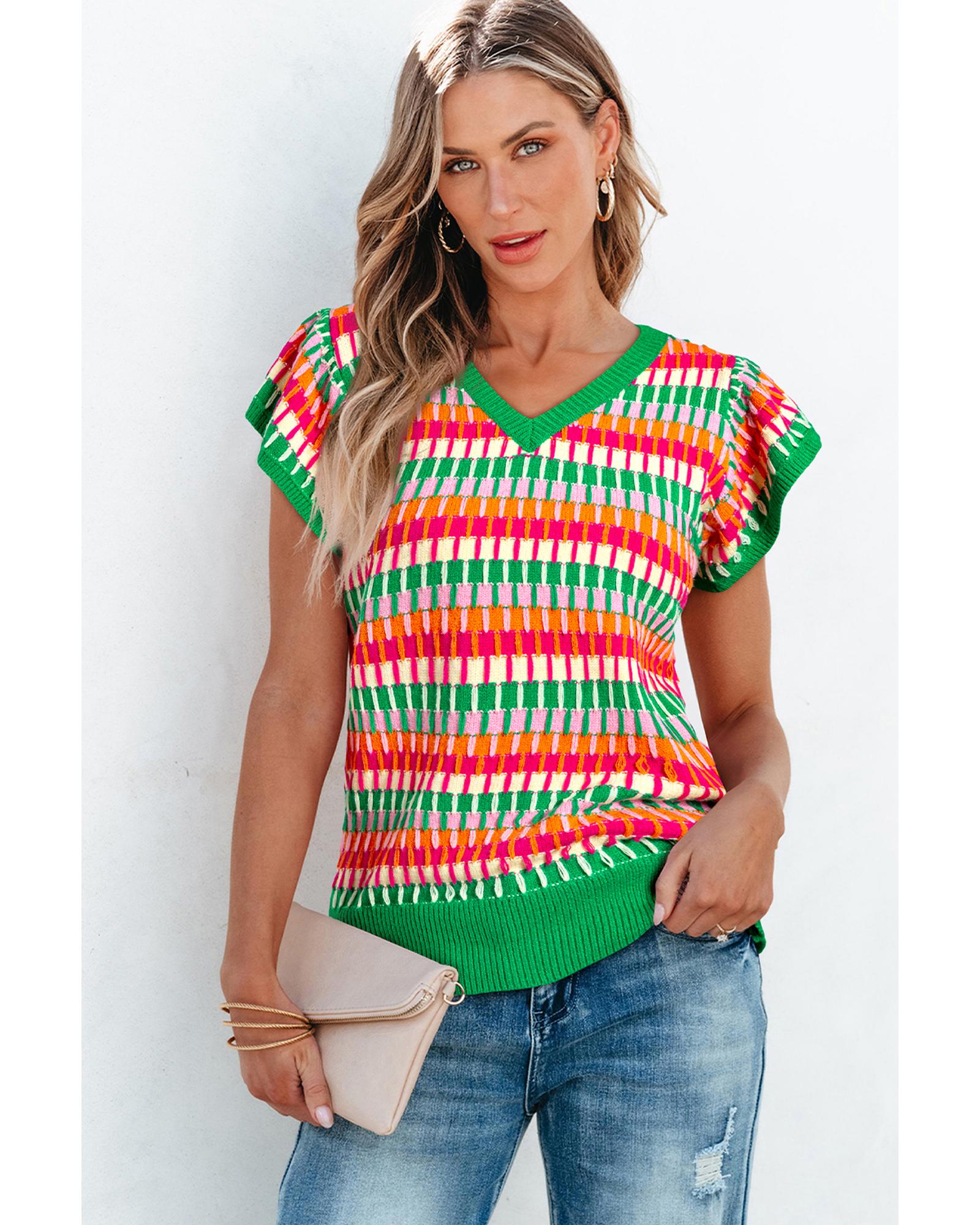 This green multi flutter sleeve knitted sweater top features a vibrant multicolor silhouette and a stylish design that complements various body shapes. The flutter sleeves add a touch of elegance, while the V neckline highlights the collarbones for a flattering appearance. Crafted with a comfortable blend of viscose, polyester, and polyamide, this short sleeve sweater offers both style and comfort for different occasions.