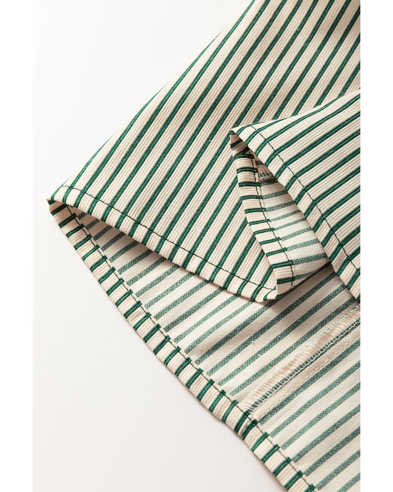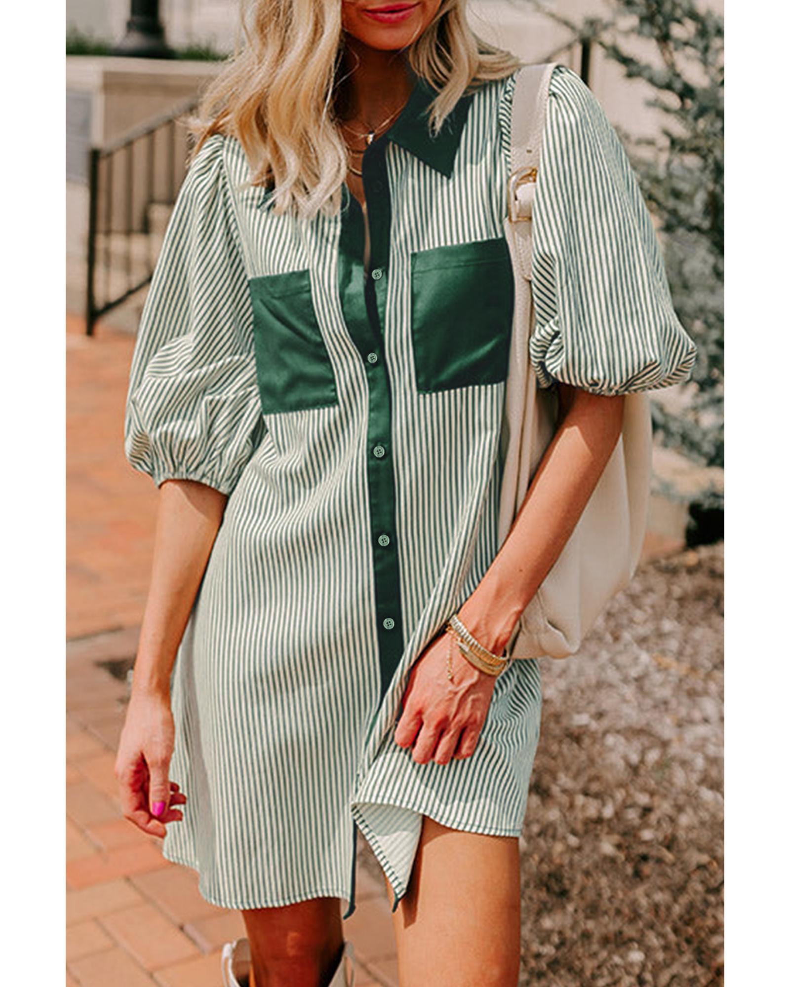 This short puff sleeve dress features a stylish striped silhouette with practical and decorative patch pockets on the chest. It is designed with a collared neckline and length sleeves with elastic cuffs, making it suitable for casual outings or coffee dates. The dress offers a trendy fitted look and is made from a comfortable blend of polyester and cotton.