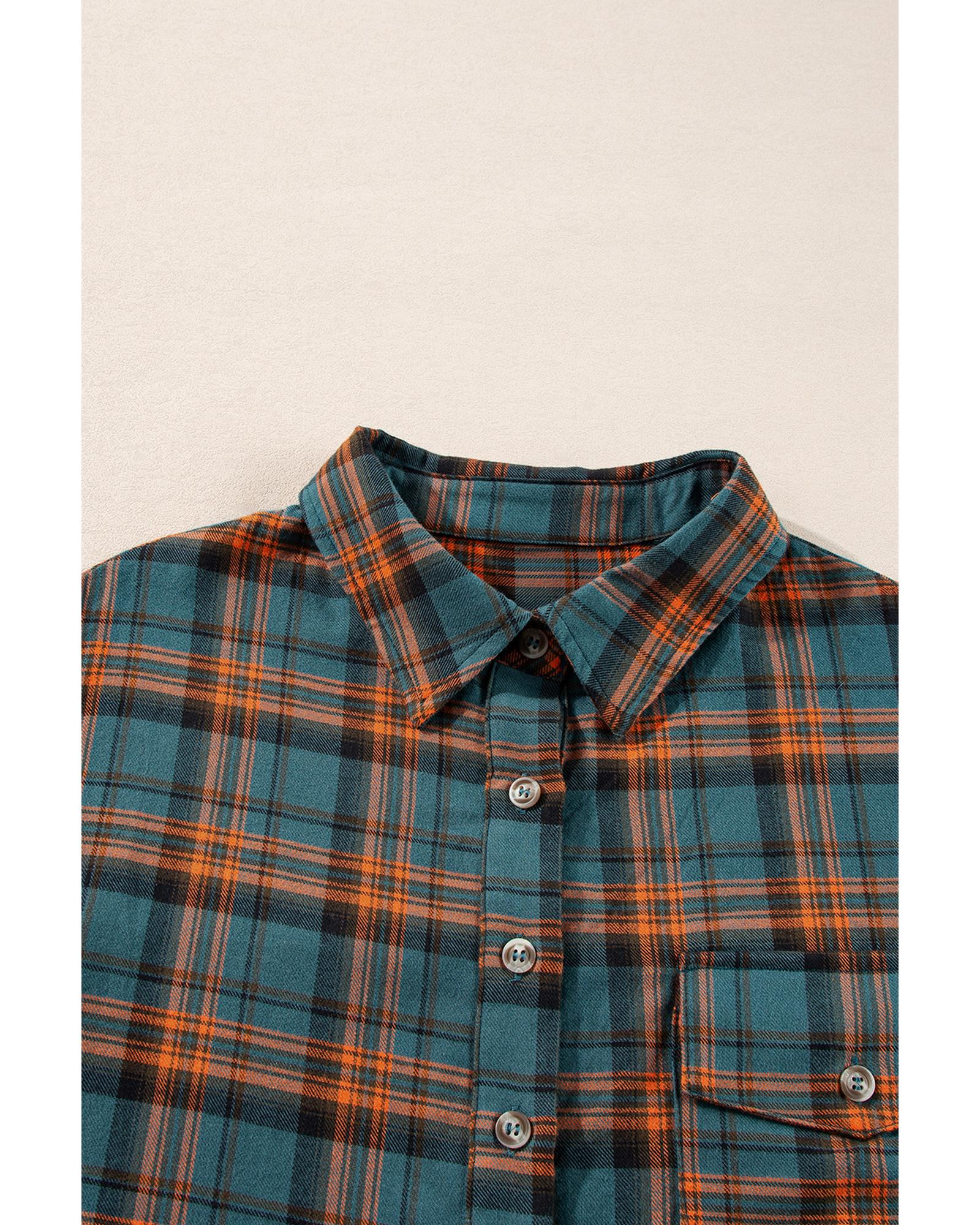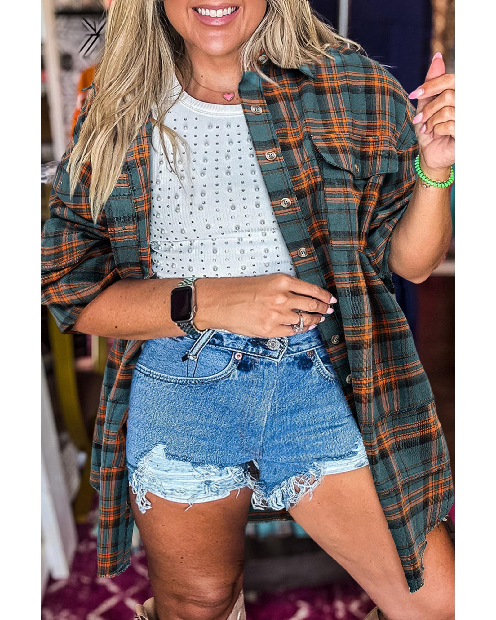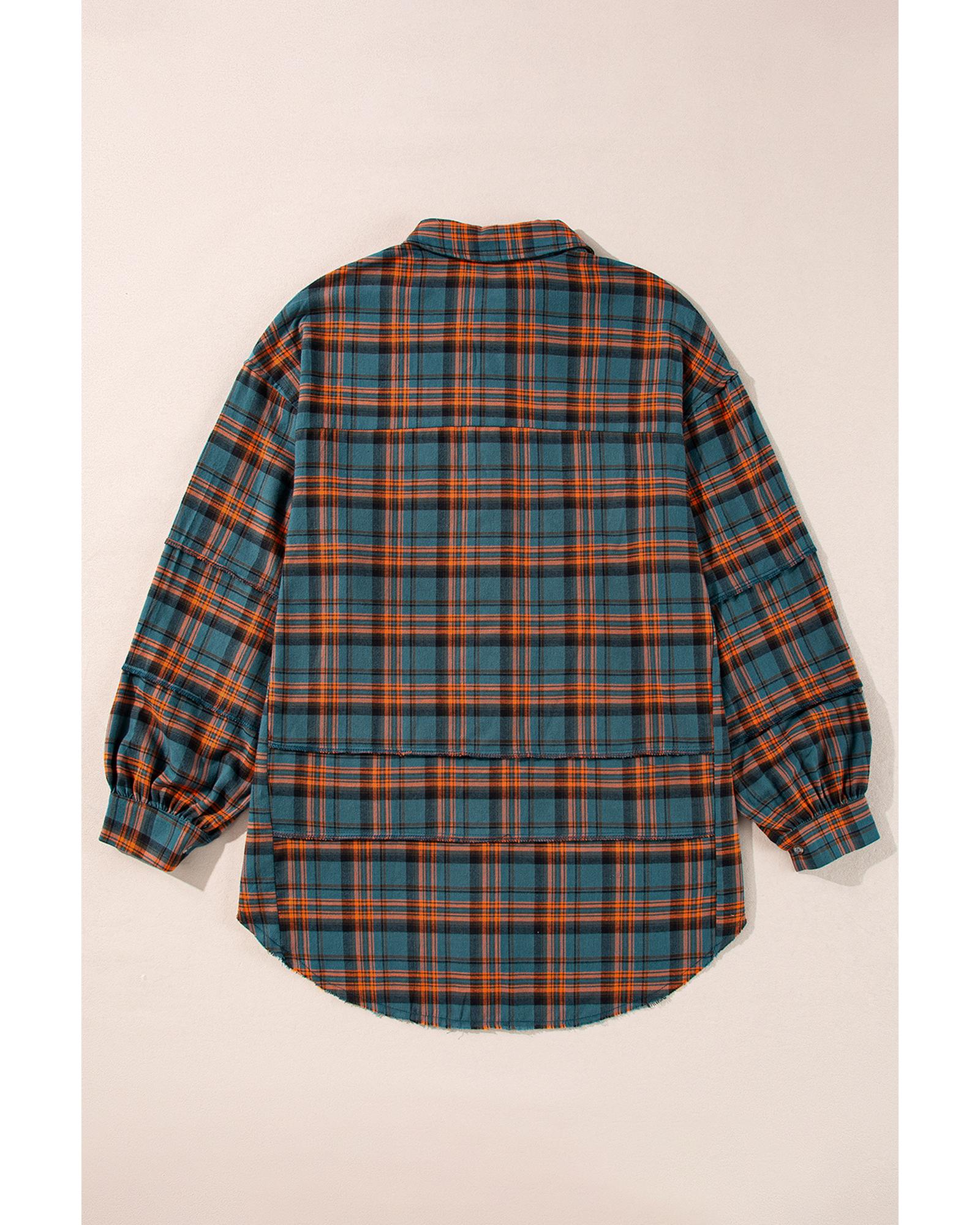 This long sleeve plaid shirt features a relaxed fit with a stylish distressed hem and side slits, offering a versatile and trendy look suitable for various casual occasions. The classic plaid pattern adds timeless appeal, while the comfortable design ensures ease of wear.